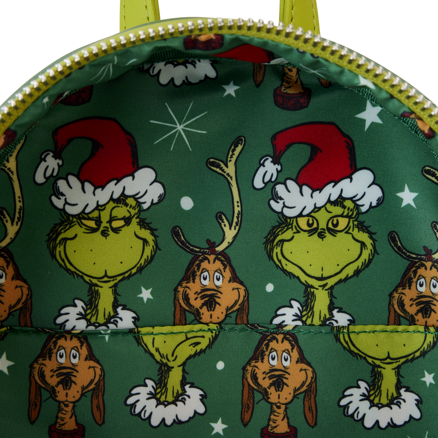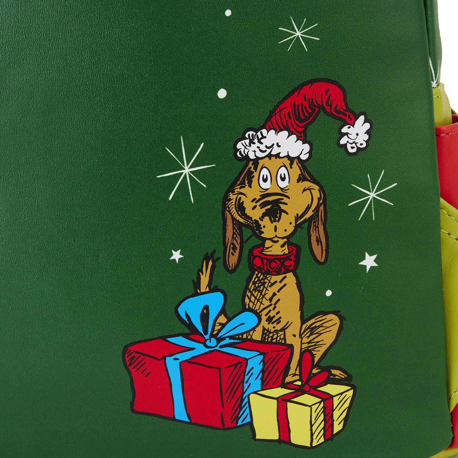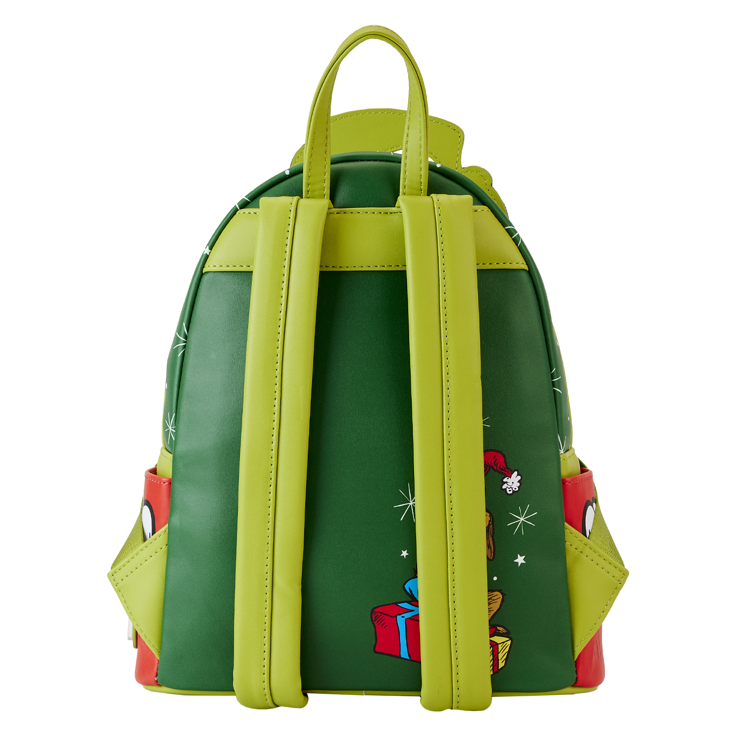 Hitch up your sleigh and slide into Whoville in style. Our Loungefly Dr. Seuss Santa Grinch Cosplay Mini Backpack will steal your heart. On the front, The Grinch comes to life in applique detail, his red Santa hat poking up over the top of the backpack. On the front zipped compartment, he wraps his arms around a present. An interactive pop-up feature allows Max to peek up out of the top of the present. Faux fur accents on the trim of The Grinch's hat add an authentic touch. And, a sentimental story unfolds upon closer inspection of the tag that accompanies the present. It seems that Max has remembered to give even The Grinch a gift. Applique fur details continue on the side pockets, and on the back, Max makes an encore appearance surrounded by presents. Transform even the chilliest of days into warmhearted adventures with this festive backpack.