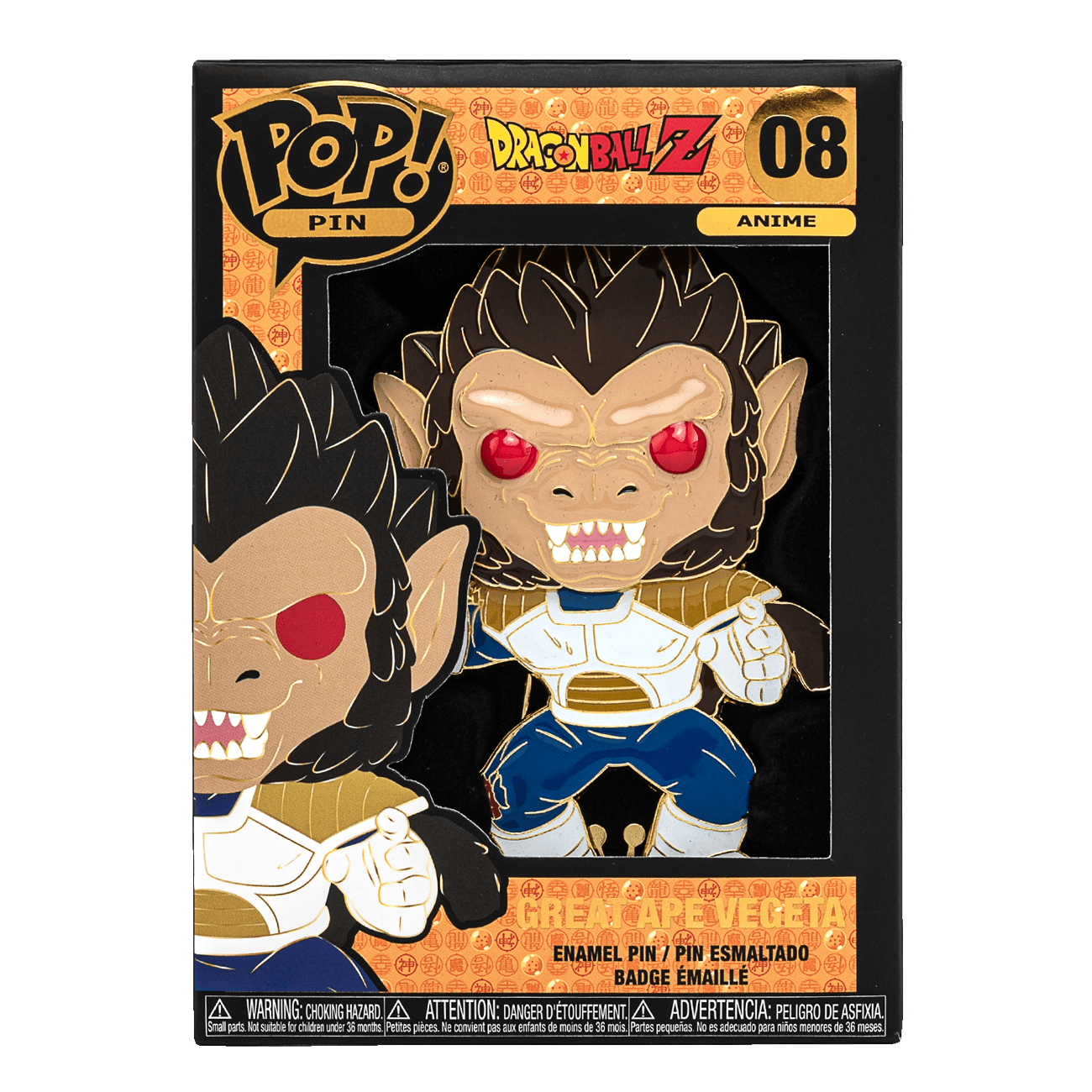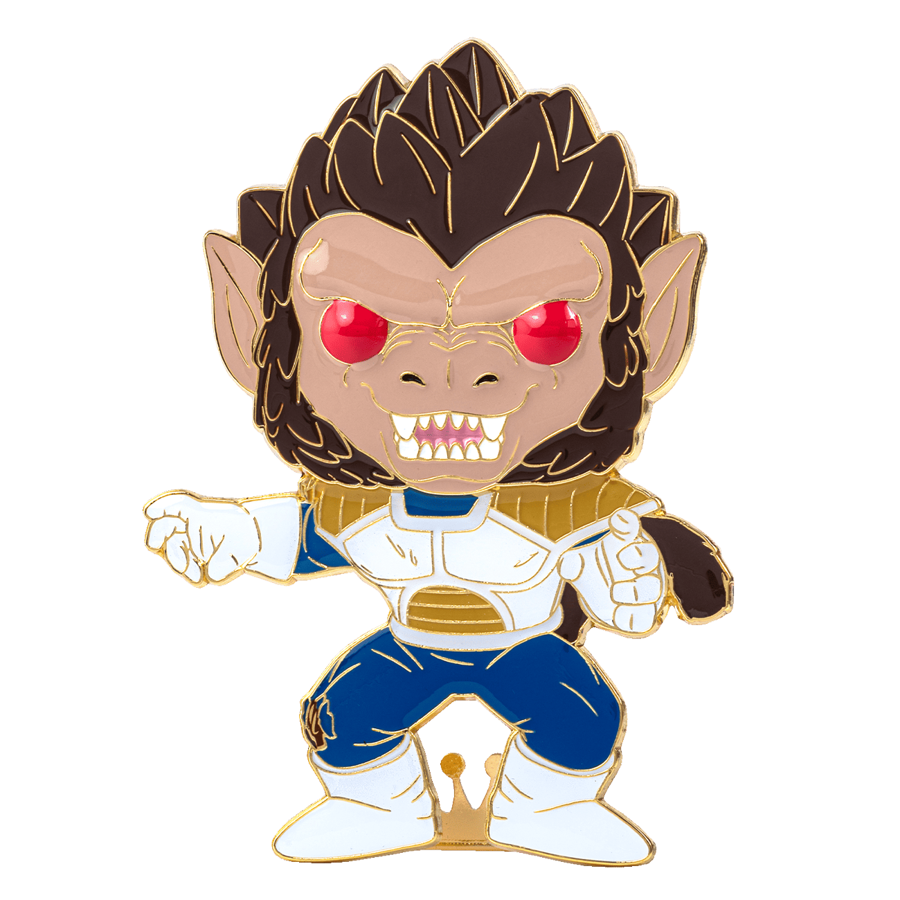 “Are you ready now to witness a power not seen for thousands of years?” This Pop! pin of Great Ape Vegeta is ready to fight for his spot in your Dragon Ball Z collection. Pin features a built-in stand and soft enamel fill on gold colored hardware. Enamel pin is approximately 4-inches tall.