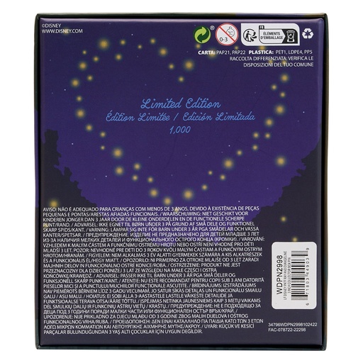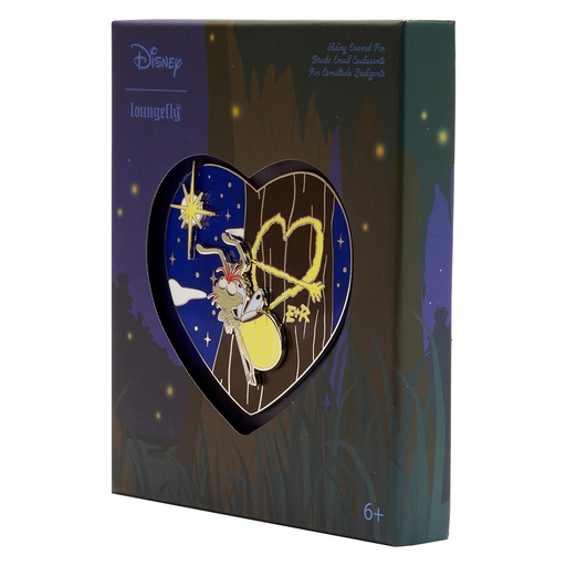 Make a wish for true love! The Ray and Evangeline Collector Box Pin shows the lightning bug Ray as he gazes into the night sky. Looking up at the star Evangeline, he lights a heart on a tree with their initials. Ray slides up and down to set the scene in motion, and details of this pin glow in the dark! This enamel pin adds a dash of romance to any outfit and is perfect for Princess and the Frog fans looking to keep one of their favorite movies close.