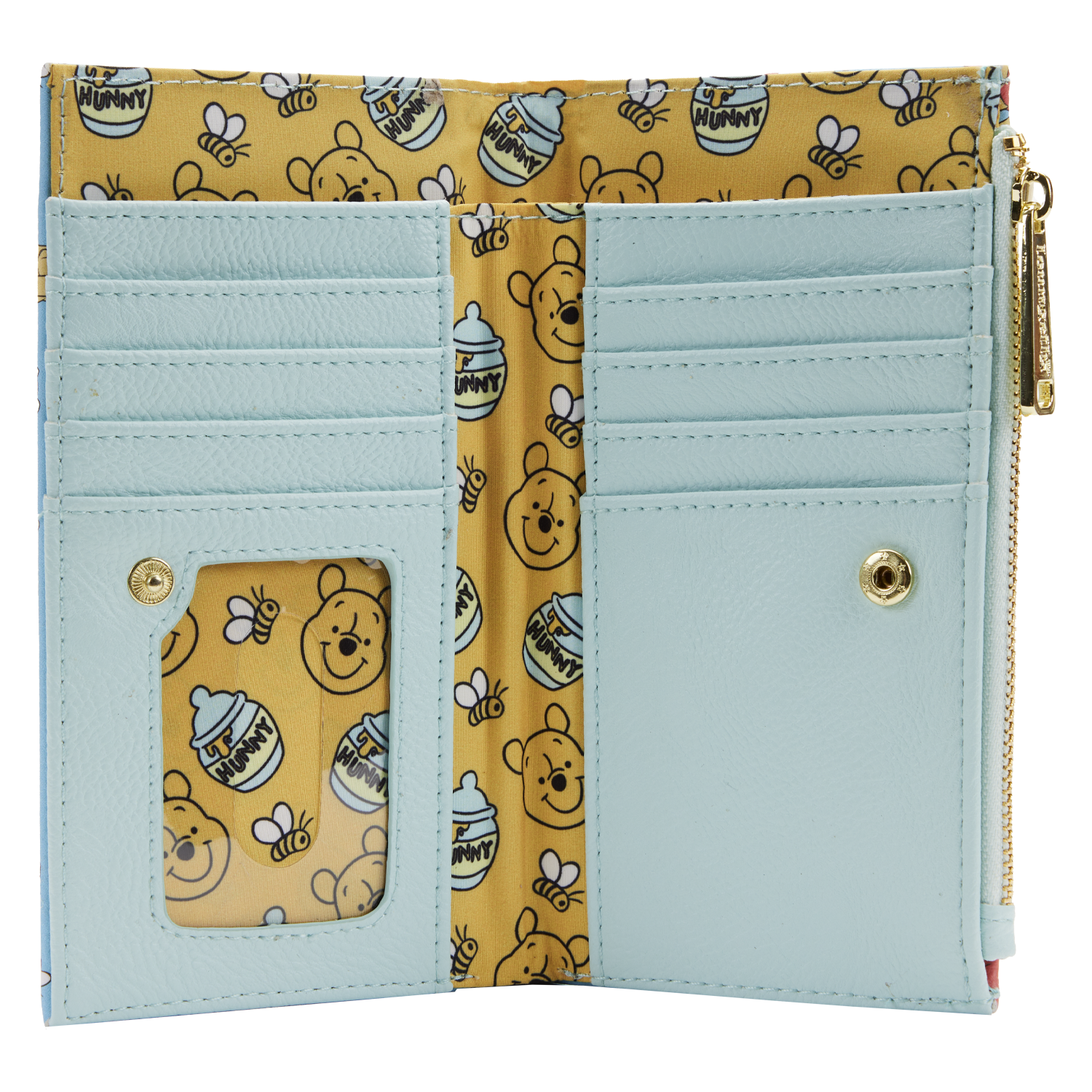 Inside, the wallet opens to reveal multiple card slots, a clear ID window, and compartments for notes, all finished with a coordinating Pooh-themed lining. A snap closure keeps everything secure, while the zip pocket offers extra storage for coins or small essentials.