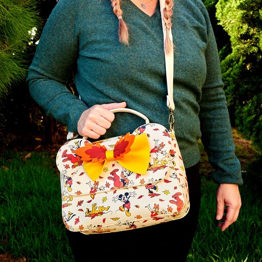 Leave room for some fun this fall with this exclusive Loungefly Disney Fall Minnie Mouse Crossbody Bag. Jump into action with Minnie Mouse and her friends as they play in bright piles of leaves. The All-over-print for this crossbody bag features Minnie Mouse, Pluto, Goofy, Mickey Mouse, and Daisy Duck celebrating the fall colors. Applique details bring Minnie Mouse’s ears to life—extending them beyond the borders of the bag. A bow, made of applique leaf shapes, includes debossed details for the veins of the leaves. It’s the perfect accessory for collecting colorful fall finds—or for turning everyday outings into magical adventures. Act fast to collect this exclusive accessory; supplies are limited.