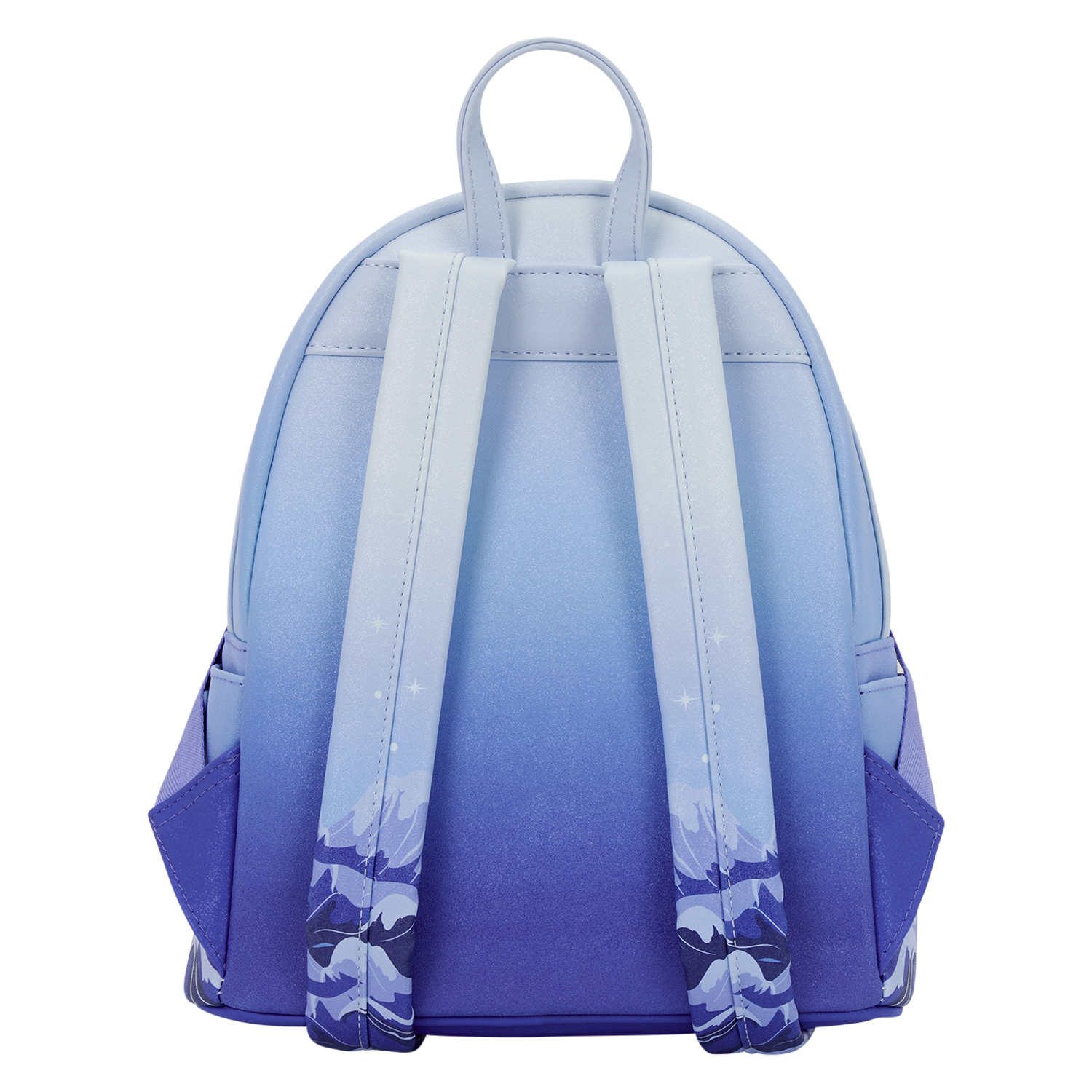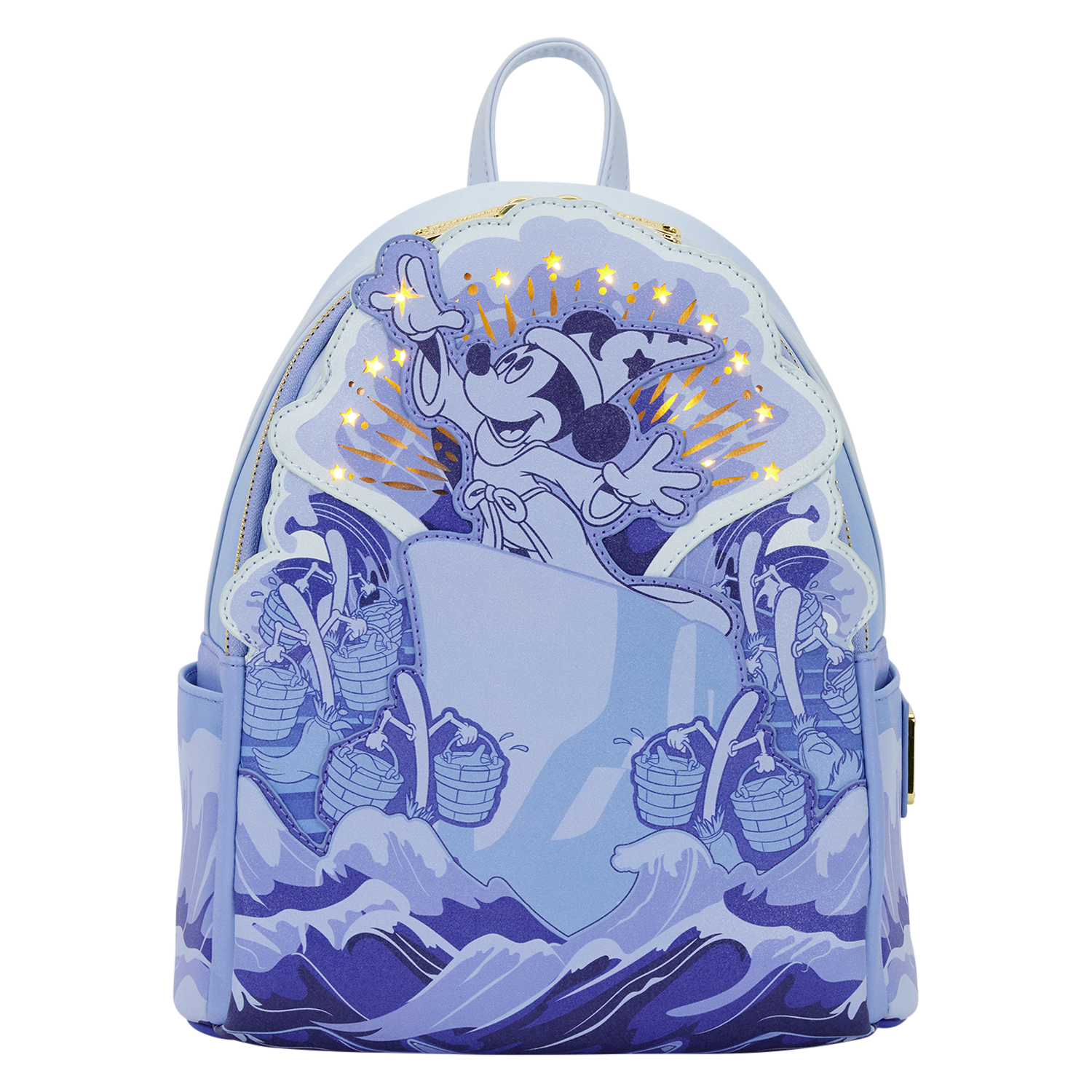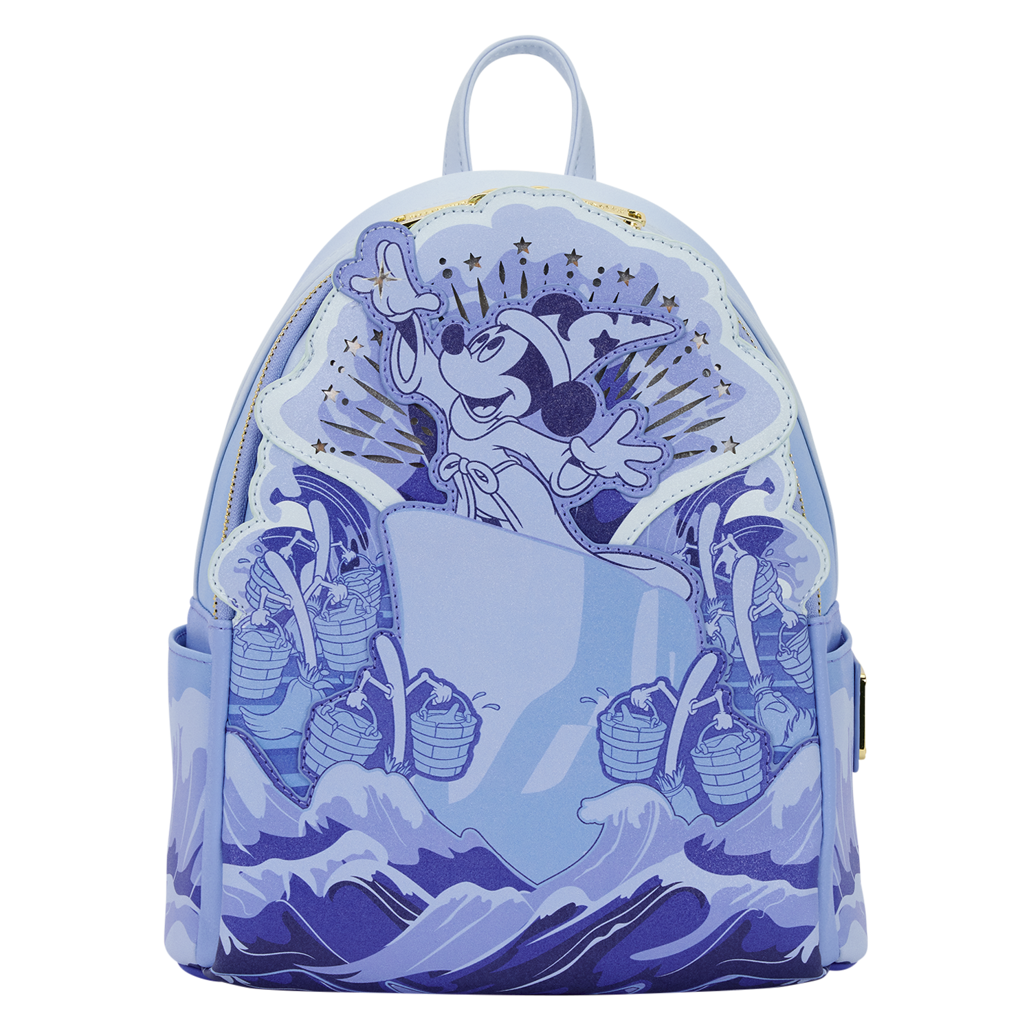 This mini backpack is inspired by Disney's Fantasia. You'll find Sorcerer Mickey front and center casting magic (the stars around him light up!). Around him are crashing waves and the Magic Brooms! Gold foil and shimmer faux leather make this an extra special piece!
