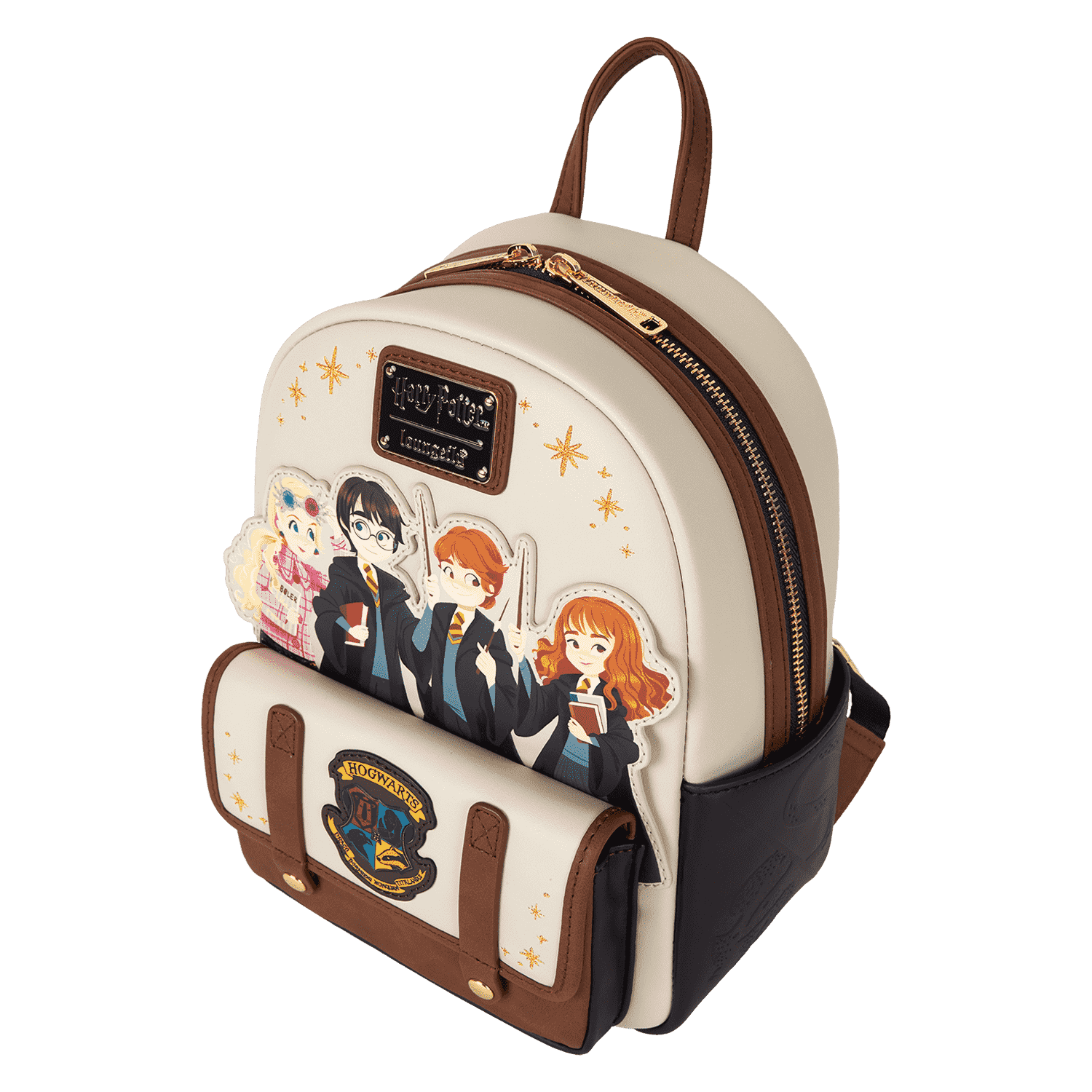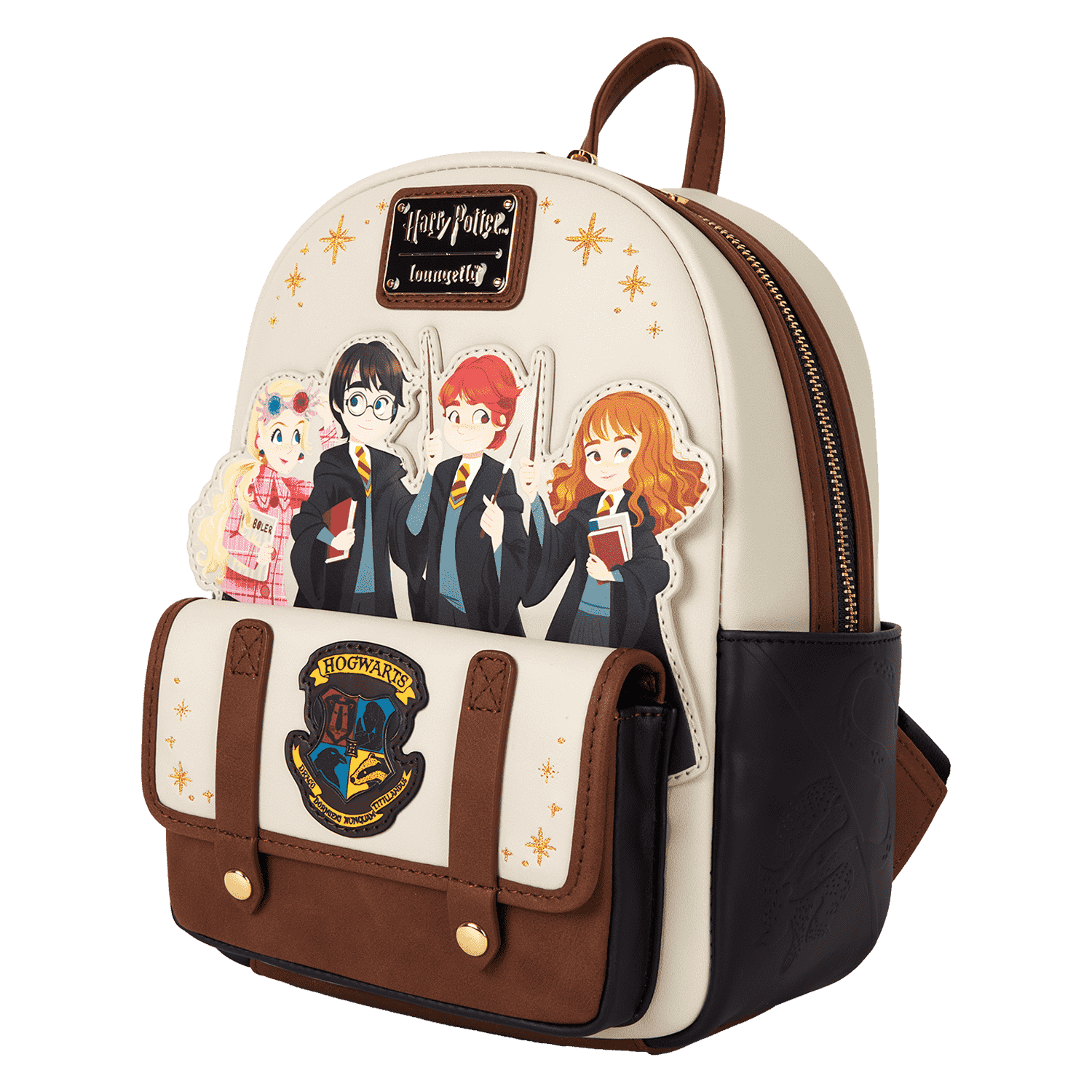 Arrive with class on the first day at Hogwarts™, Harry Potter™ fans! Enchant the halls with this Harry Potter mini backpack, which features a snap front flap with the Hogwarts crest. Above the pocket, you’ll find an applique of classmates Luna Lovegood, Harry Potter, Ron Weasley, and Hermione Granger—all wands at the ready. Embroidered gold “sparkles,” indicate an allusion to magic. Flip the backpack around, and Professor Albus Dumbledore appears as a print. Even the side pockets include a nod to the various Hogwarts houses, the individual mascots rendered as debossed prints. There’s just enough room for packing your daily essentials and setting off on magical journeys in style.