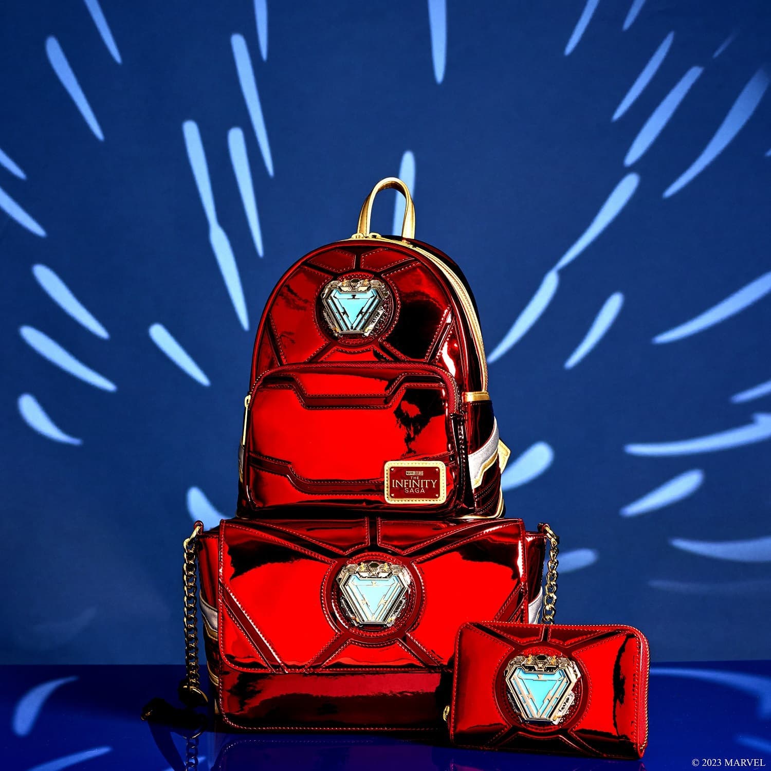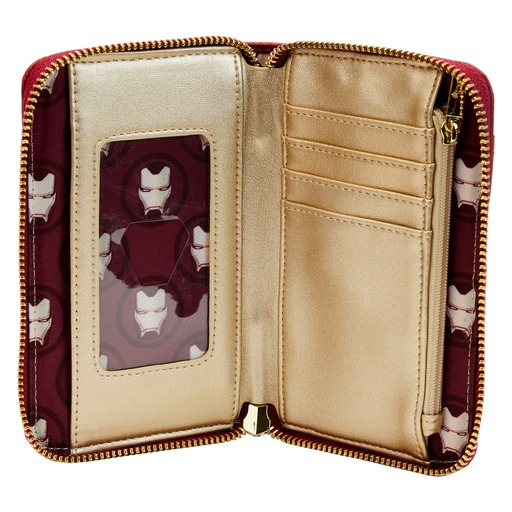 The Loungefly Iron Man 15th Anniversary Cosplay Zip Around Wallet is made of metallic vegan leather (polyurethane). Wallet zips closed with sturdy metal hardware. Additional features include applique and printed details.