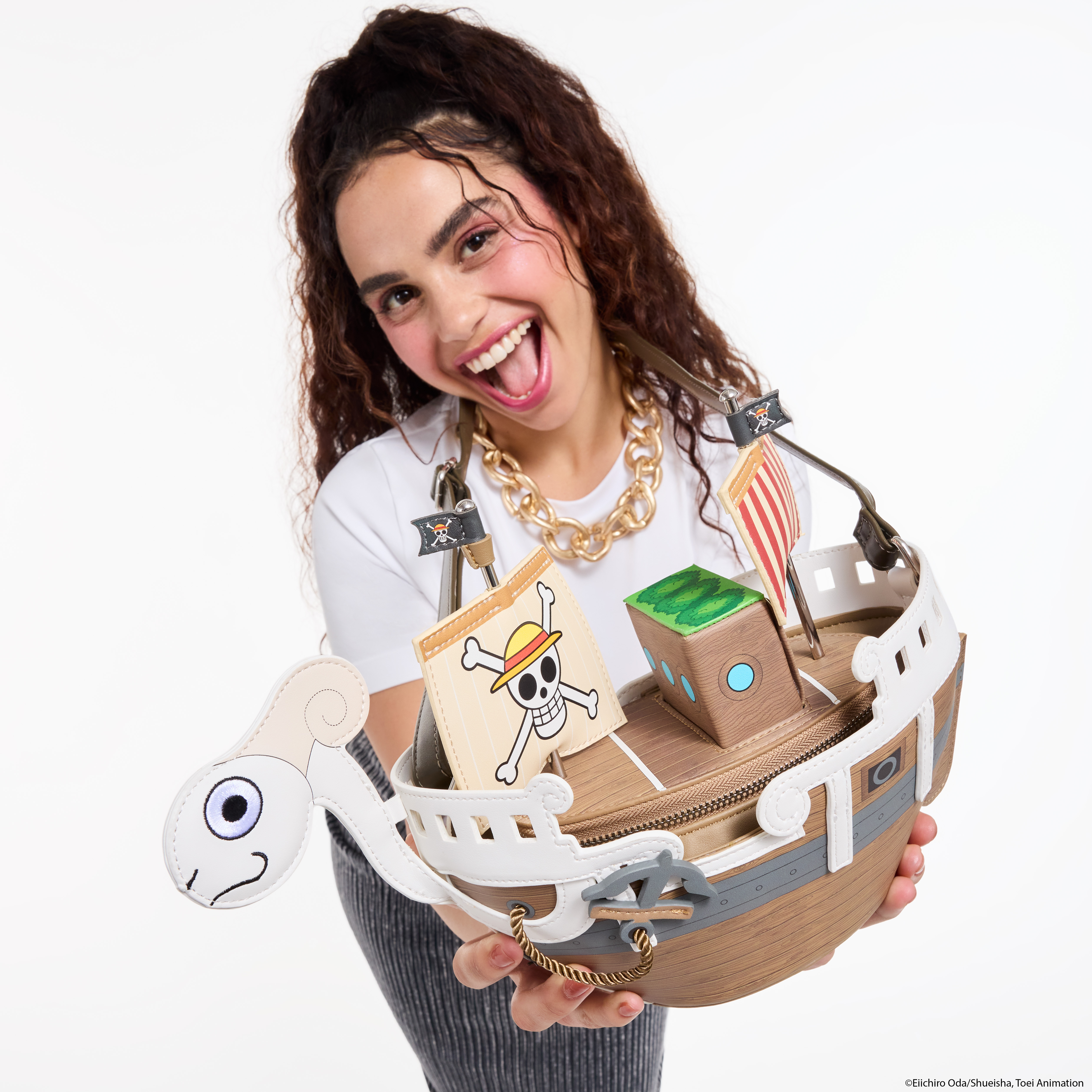 This figural crossbody bag is in the shape of the Going Merry from One Piece. Real rope, embroidery, and padded appliques bring the ship to life!