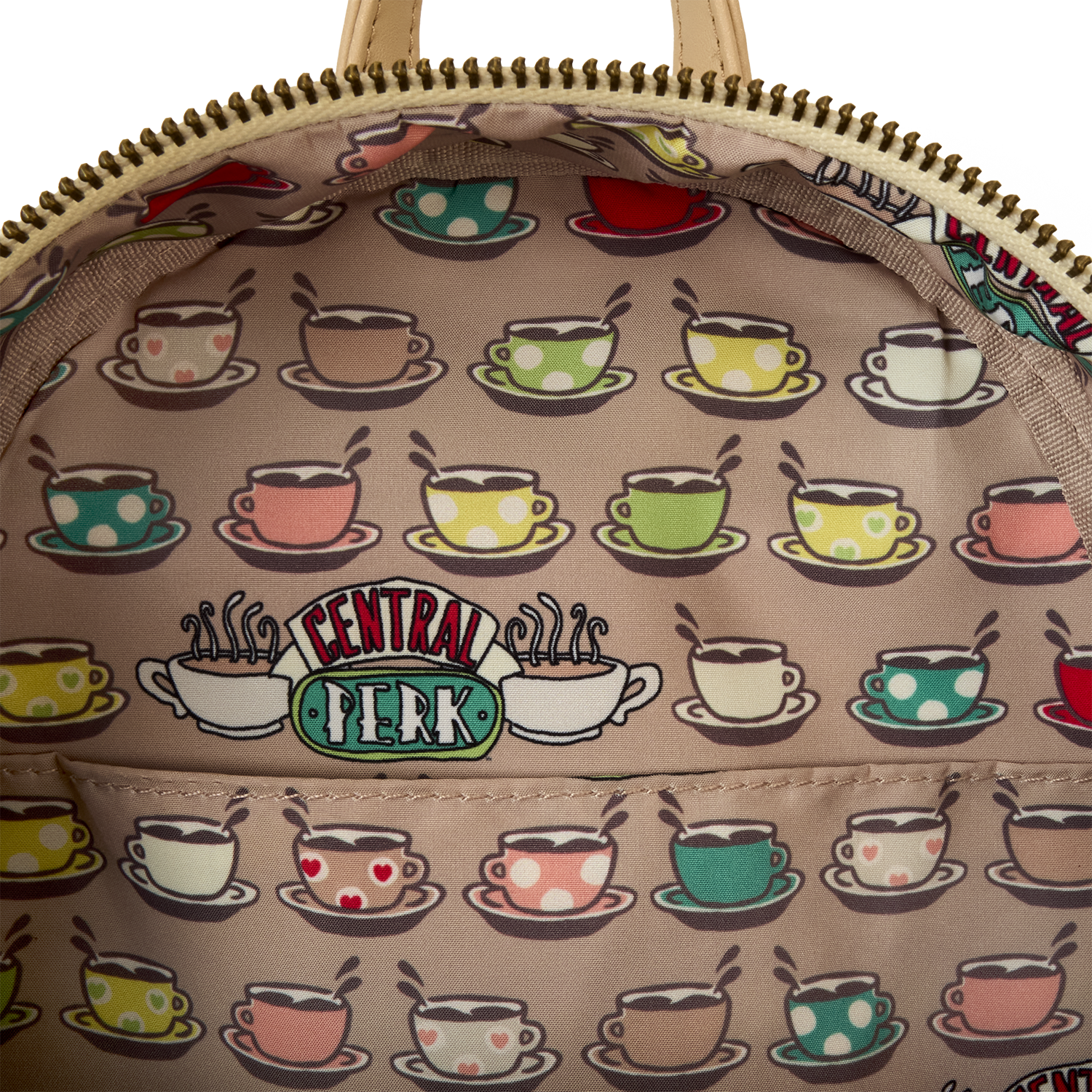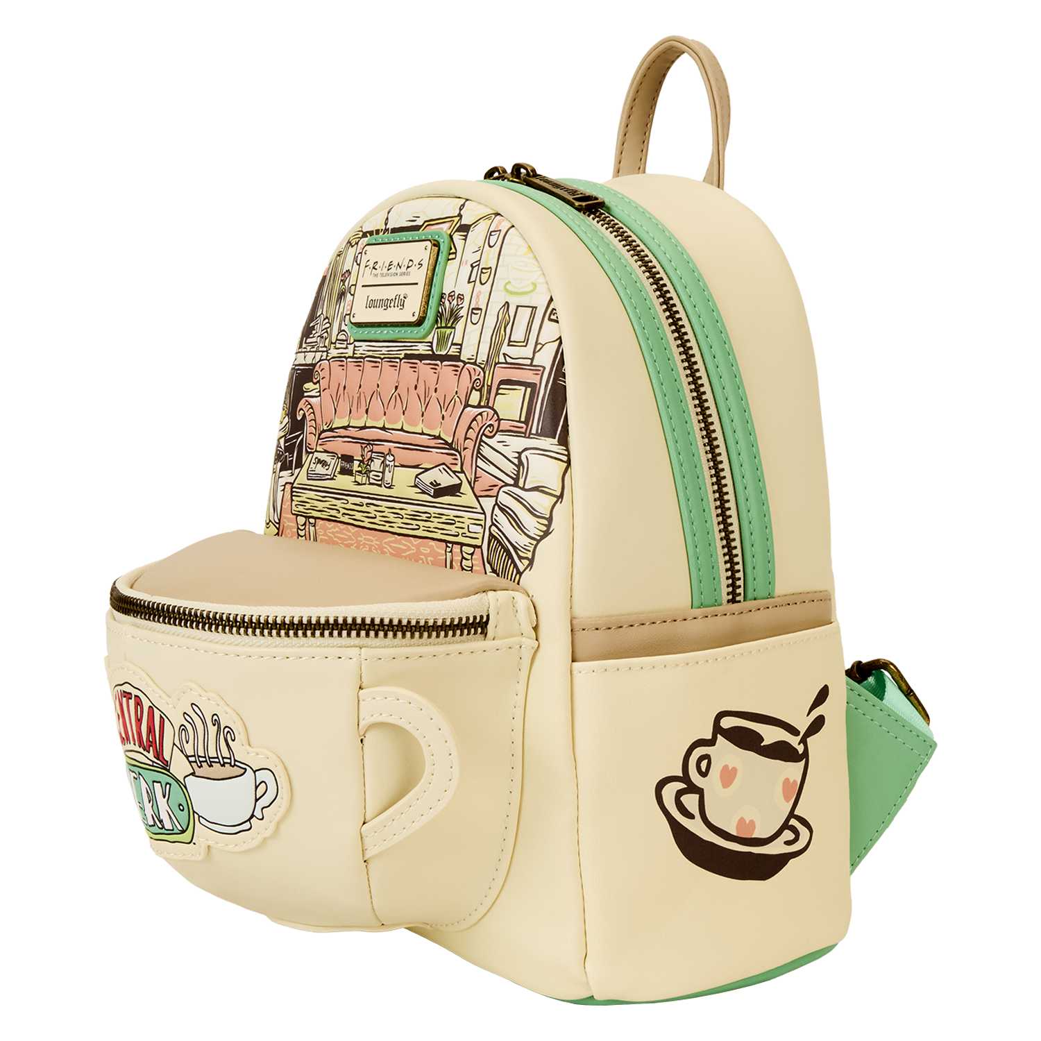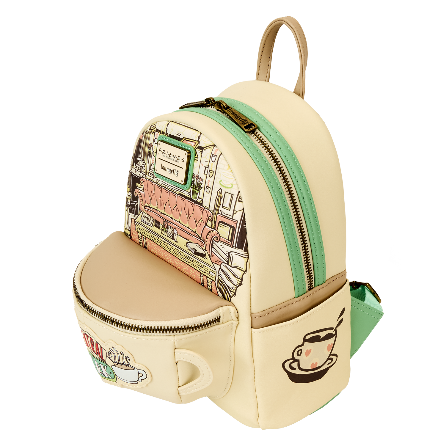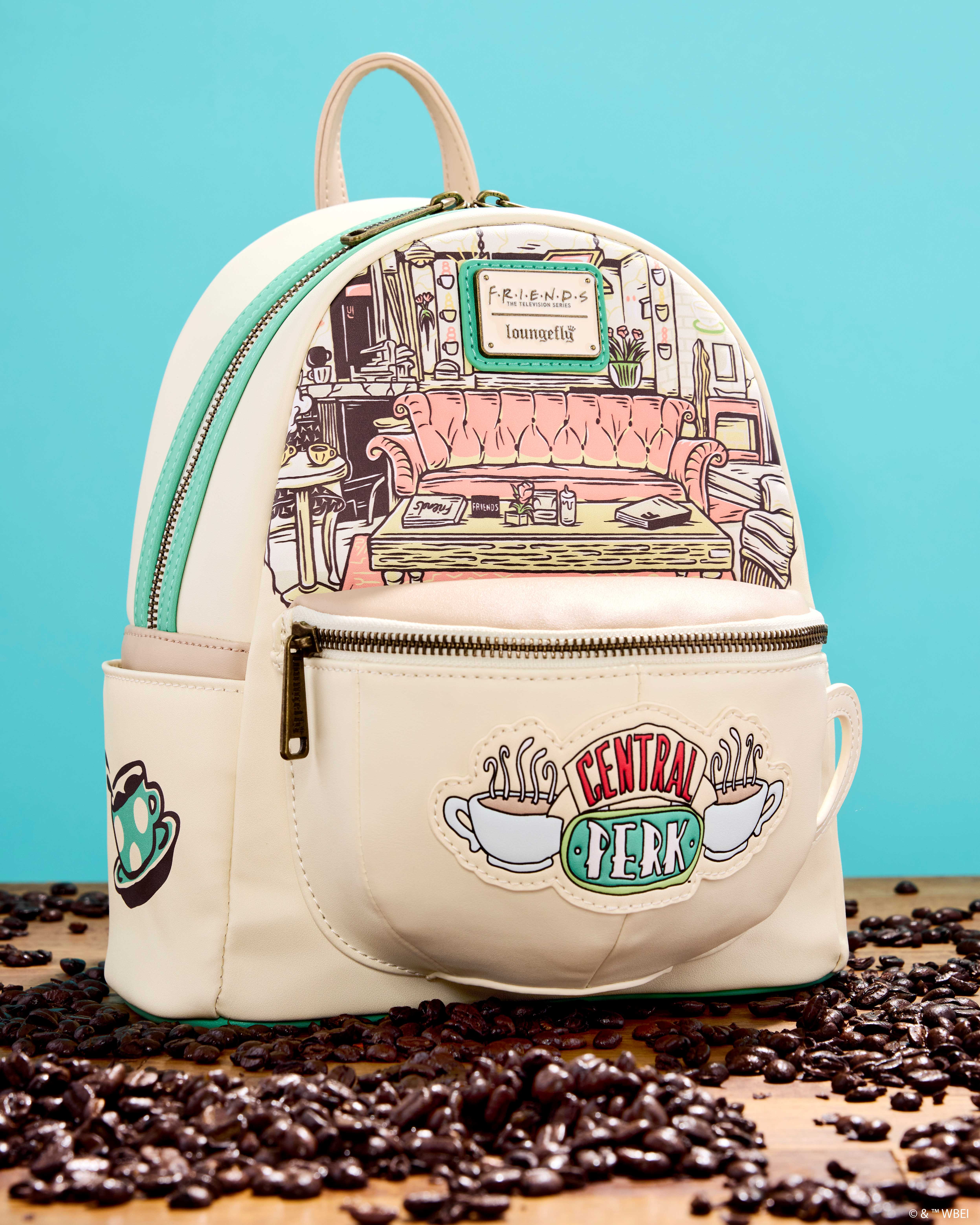Perk up your day! This Central Perk coffeehouse mini backpack is a fashionably fun way to take a favorite fandom on the go. It’s even coffee-scented! The front pocket resembles a coffee cup, which extends forward with a rounded cup-like shape on the bottom. On the top, the smooth surface takes on a creamy coffee color, and the Central Perk applique logo appears on the front. Just behind it, you’ll get an inside view of the coffeehouse, complete with the couch from the Friendsset. Pack your daily essentials, grab your bestie, and toast to new adventures.