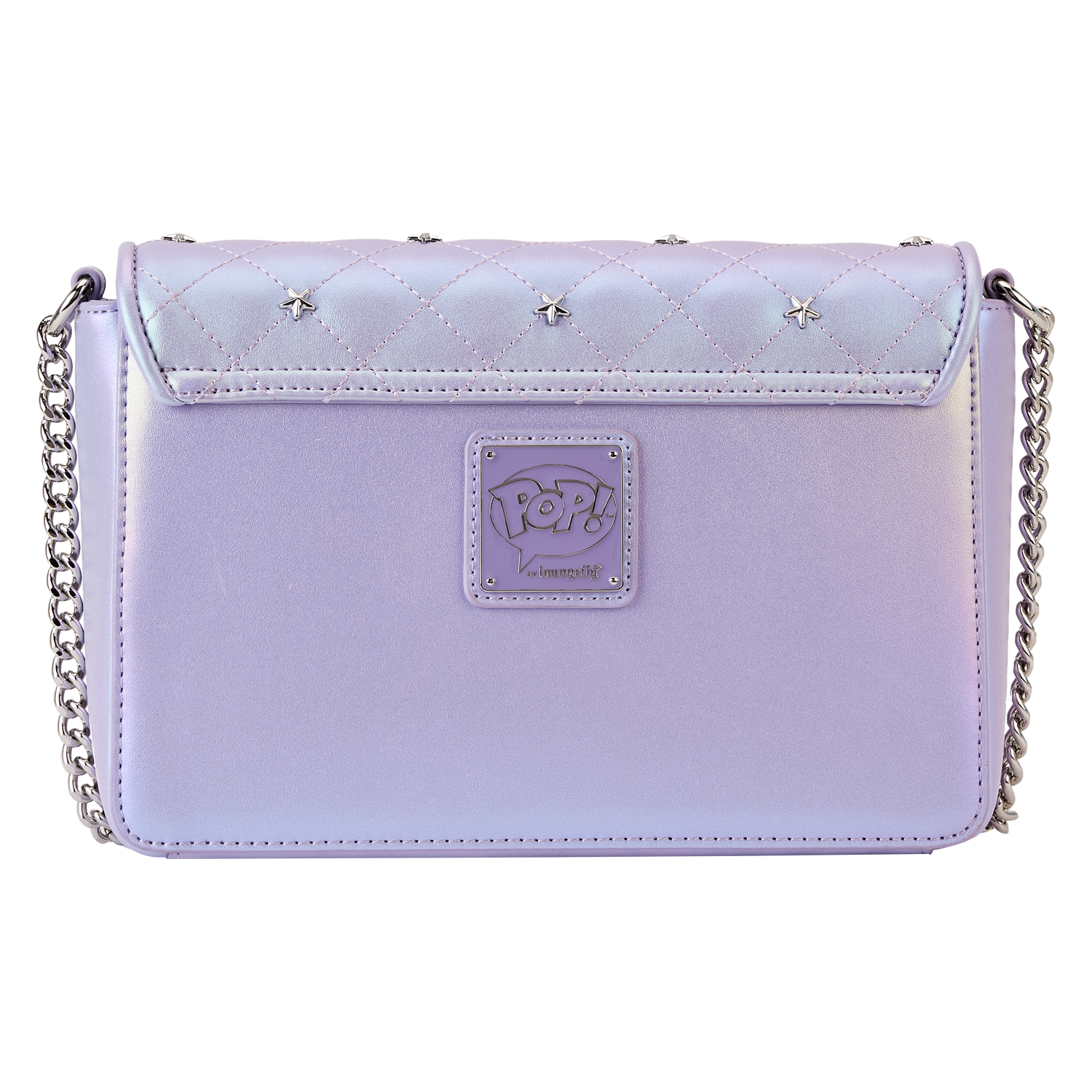 Setting a dynamite trend? It's is in the stars with our Loungefly BTS Pop! by Loungefly Crossbody Bag! This sleek bag shines with purple iridescent sparkle. The design on the front flap features quilted detailing with star-shaped metal studs for an elegant pillowy, textured look. Lifting the molded metal charm on the front flap reveals all the BTS band members in top Pop! form from their Dynamite video, including RM, Jin, Suga, J-Hope, Jimin, V, and Jung Kook. Shine wherever you go with this superstar accessory.
