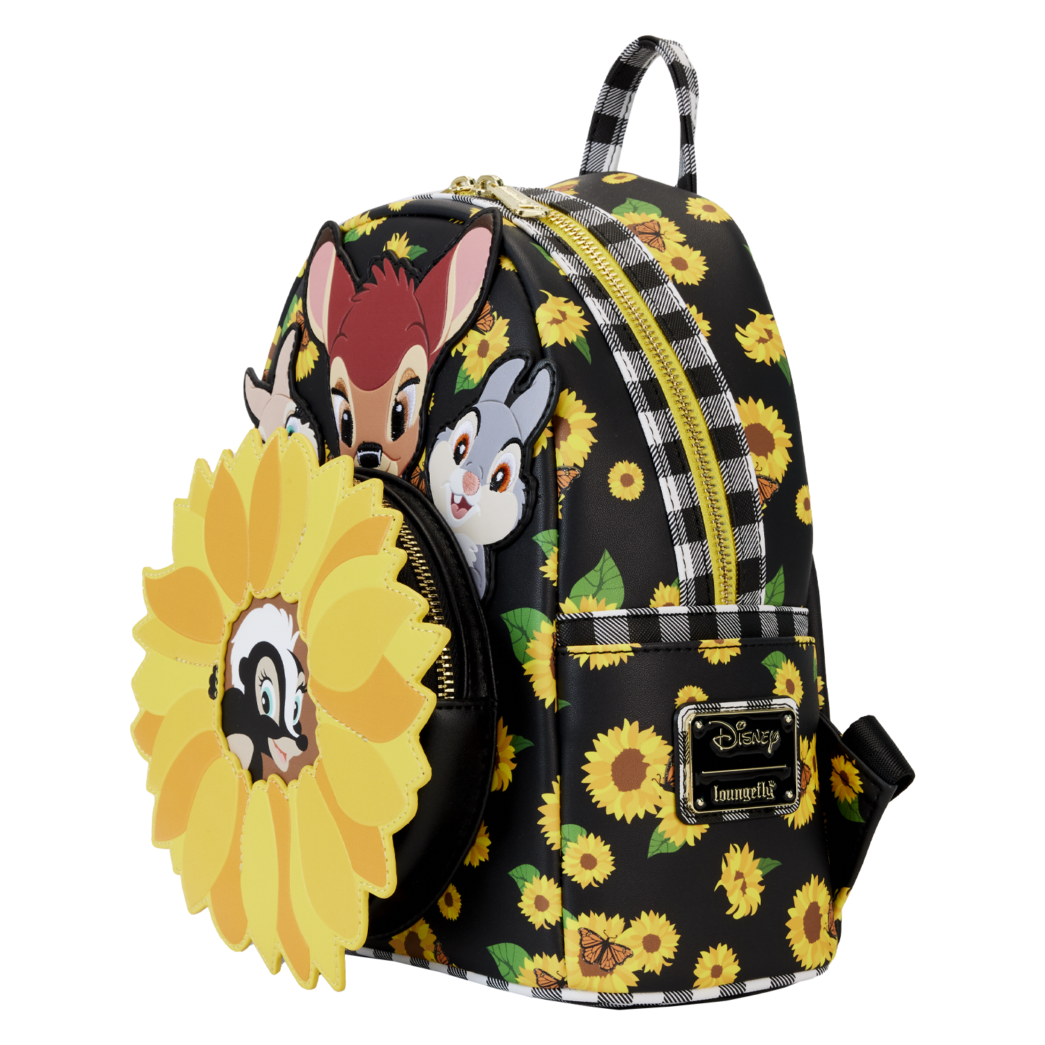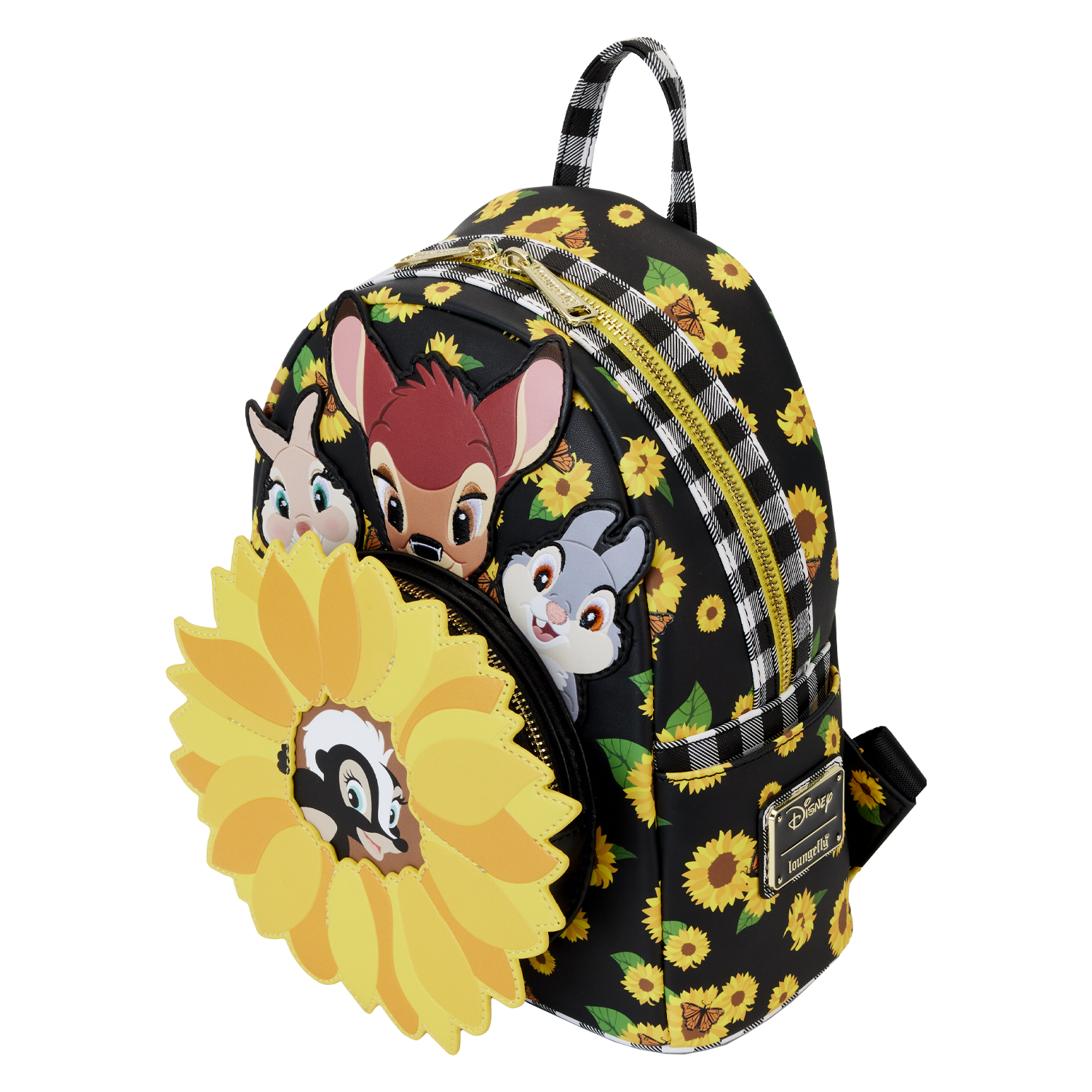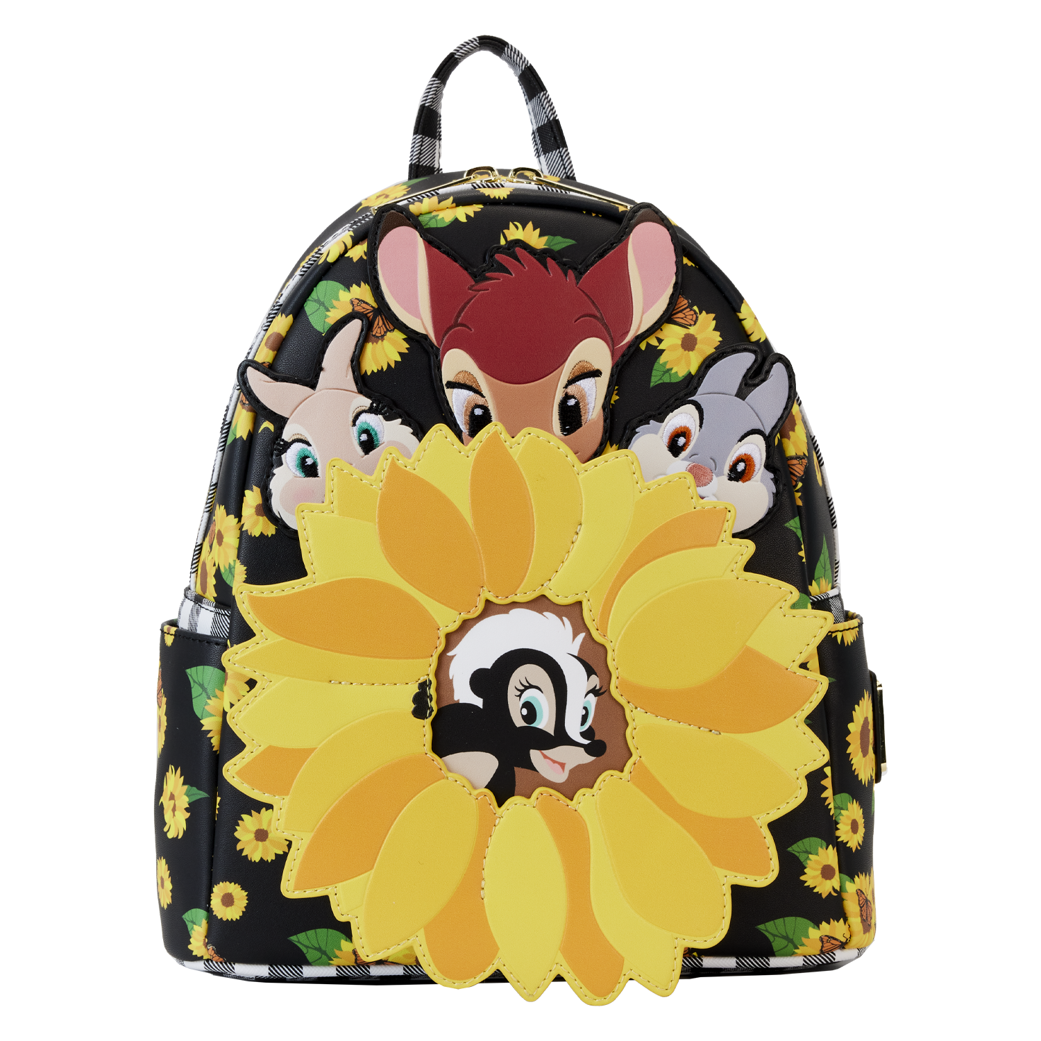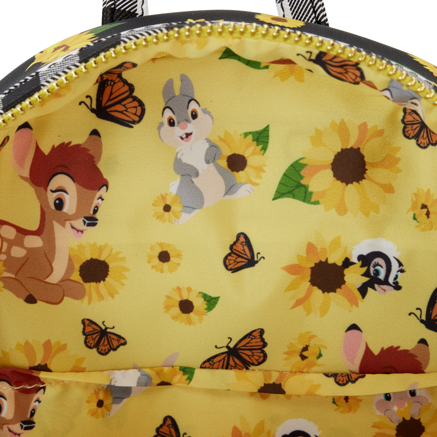 Time spent with friends simply feels like sunshine. Gather in the garden with the Loungefly Bambi Sunflower Friends Mini Backpack, where bright yellow sunflowers cover the bag in a cheerful all-over print. On the front, Bambi, Thumper, and Miss Bunny peek out from golden petals as a large sunflower takes shape on the front zipper pocket. Down below, Flower rests in the sunflower’s center. Black and white plaid trim adds a trendy note to the bag’s design and continues onto its adjustable shoulder straps. This mini backpack makes a radiant addition to any outfit and is perfect for Disney fans looking to keep their favorite characters close.