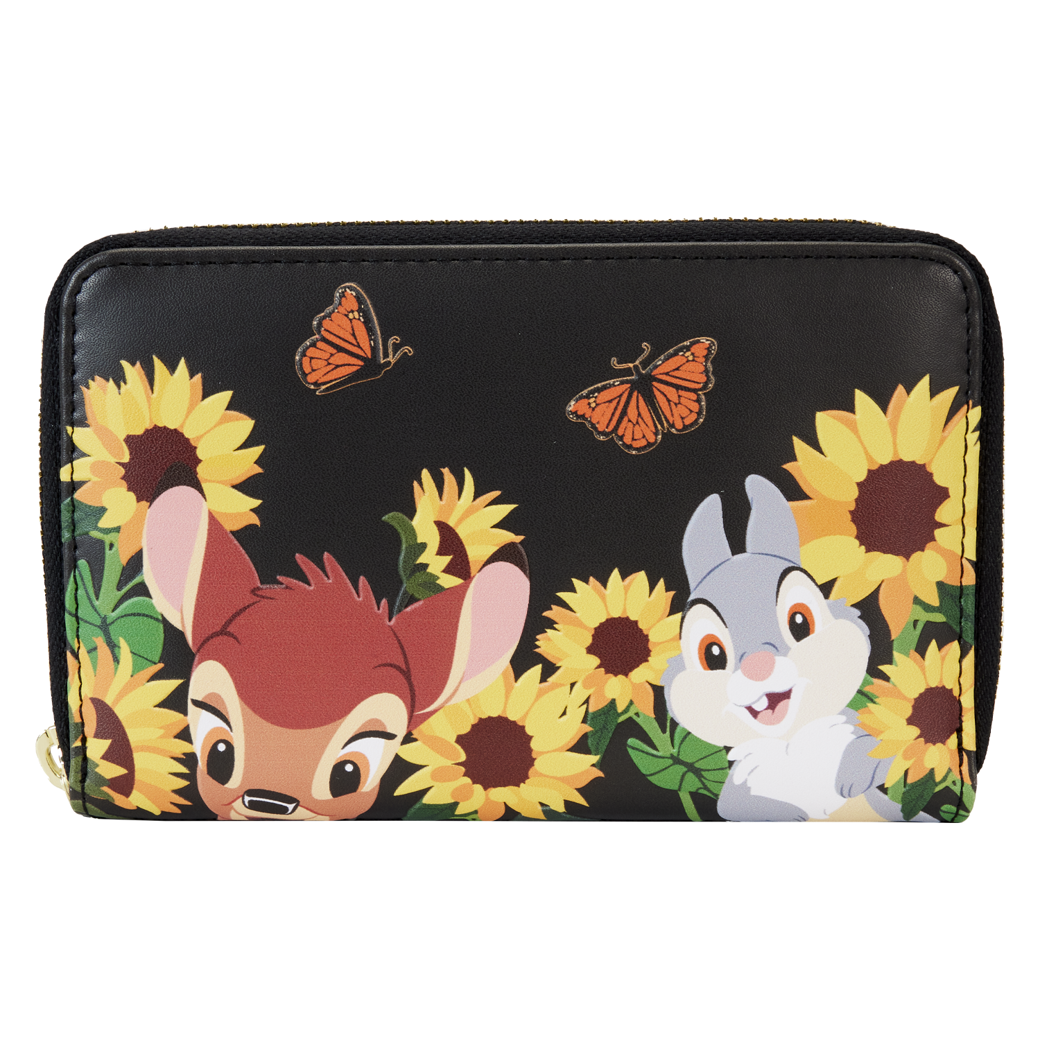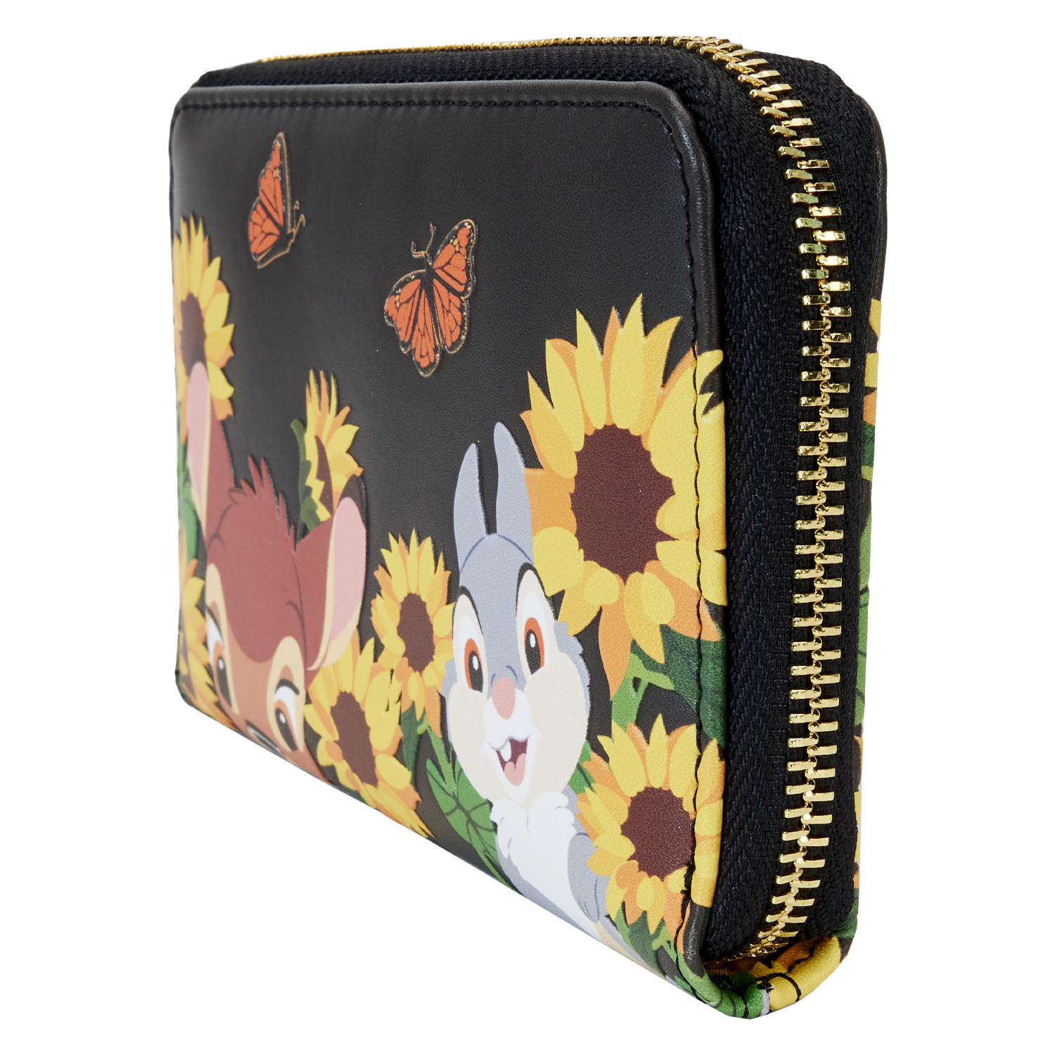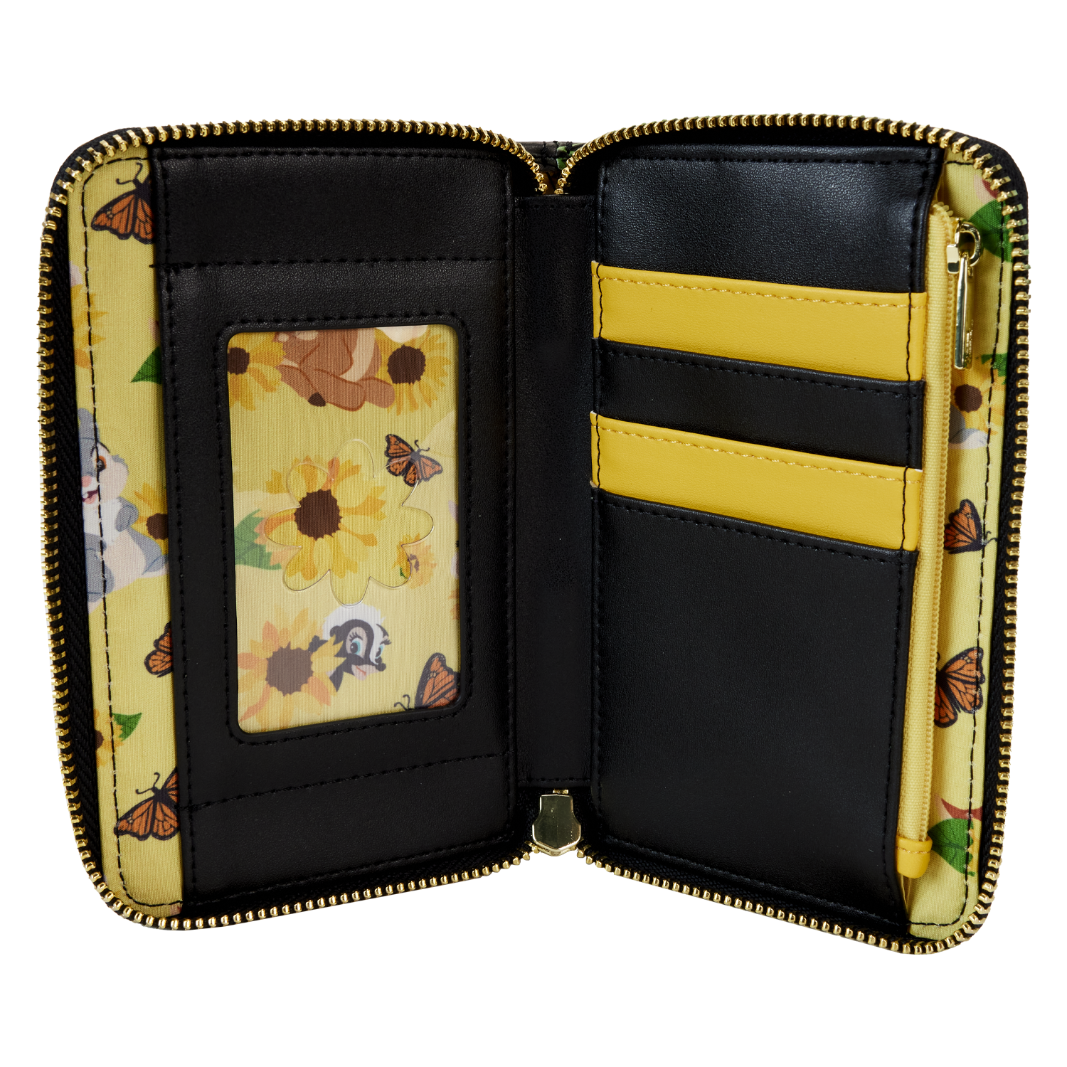The Loungefly Bambi Sunflower Friends Zip Around Wallet is made of vegan leather (polyurethane). Wallet zips closed with shiny gold hardware. Additional features include applique, debossed, and printed details. Take note of the flower-shaped die-cut ID window and the coordinating inside lining.