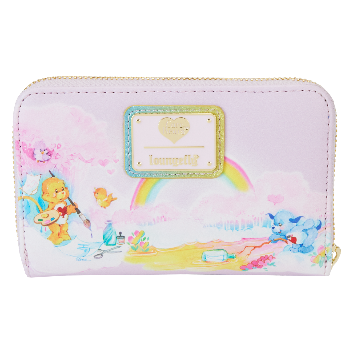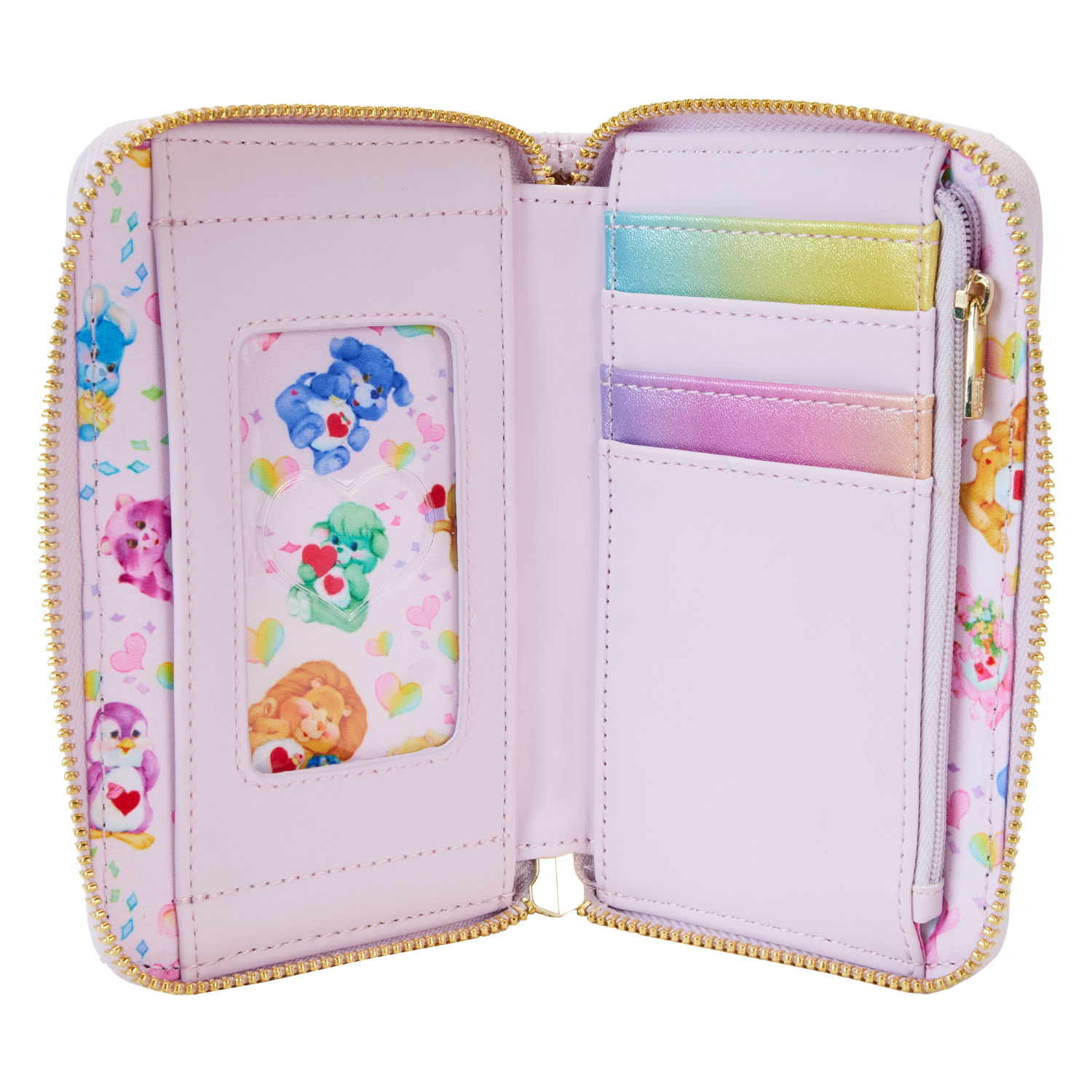 Journeying to Care-a-Lot™? Stop by the Forest of Feelings™ in style with our Loungefly Care Bears™ Cousins Forest Fun Zip-Around Wallet. On the front of this soft pink wallet, you’ll find dreamy artwork of a forest scene. Rainbow trunks lead to frosty pink leaves. Among them, favorite Care Bears and Cousins play. You might be able to spot Brave Heart Lion™, Lotsa Heart Elephant™, Cozy Heart Penguin™, and more—along with cheerful birds and colorful hearts. On the back, Playful Heart Monkey™ paints while Loyal Heart Dog™ sends a message in a bottle on the water. A rainbow, birds, and a pink tree complete the scene. Inside, you’ll find approximately four slots for holding cards and one clear slot for displaying your ID. A die-cut shape of a heart, on the clear slot, adds a signature touch. Share a message of caring wherever you go with this delightful accessory.