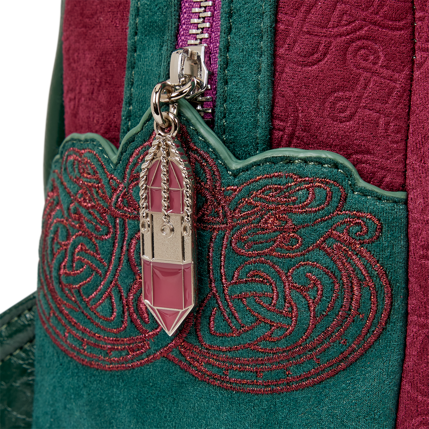 This bag features the Book of Shadows on the front with an embroidered triquetra on the front cover. The book lights up! You'll find more designs in foil on the sides and an enamel zipper charm in the shape of a crystal!