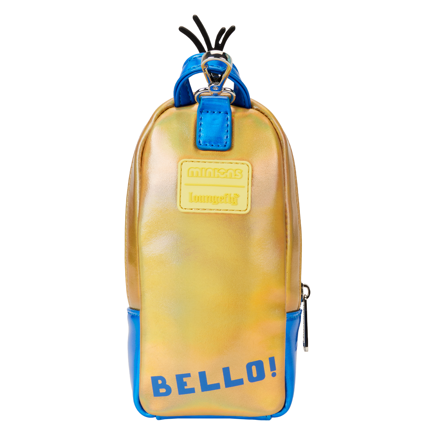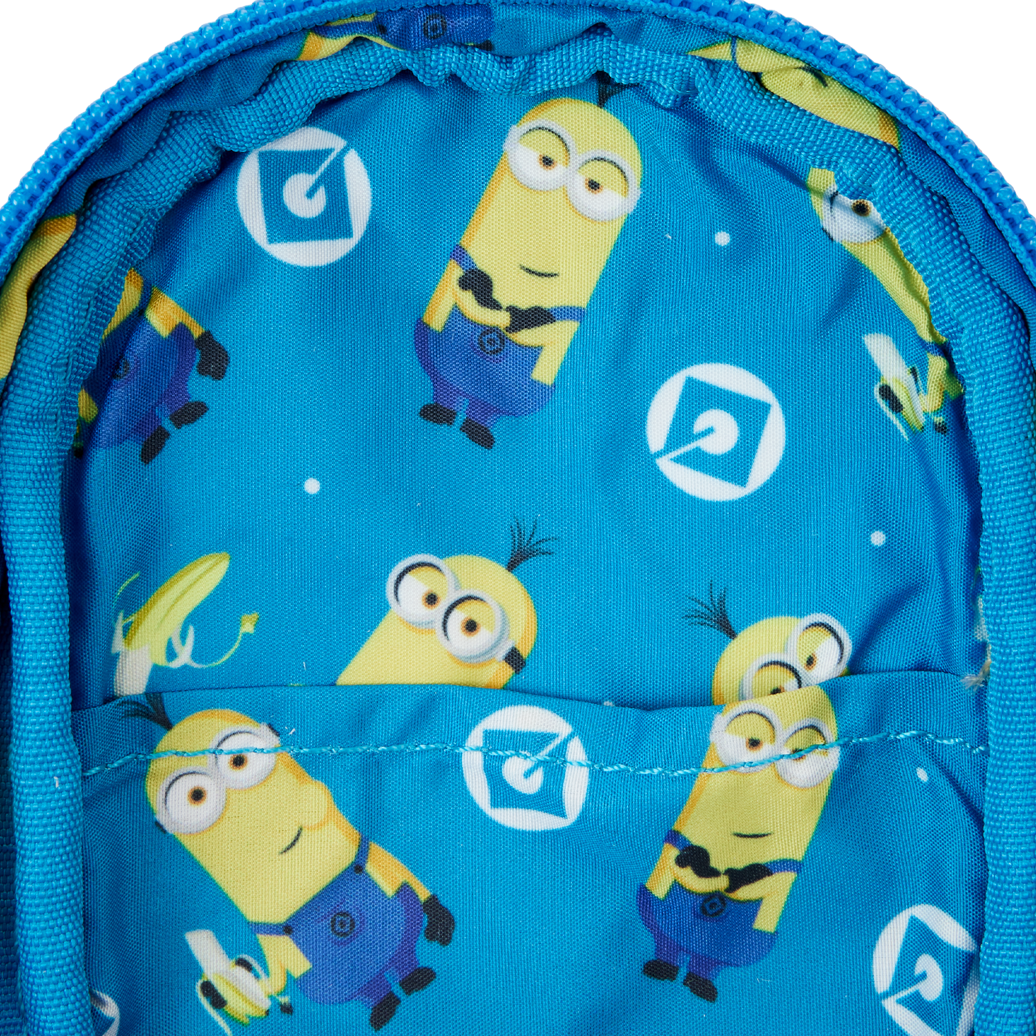 Writing an ode to your favorite Minions—and bananas? Express yourself and keep all your inspirational tools organized with our Minions mini backpack pencil case. The front cover features a Minion in shiny gold and blue iridescent details. His applique glasses are framed in silver vegan leather, and clear PVC material creates see-through “lenses.” Even his hair sticks up at the top! A front “pocket” displays the “Gru” symbol in blue. On the back, you’ll find the word “Bello!” An extra zipper compartment in the front makes it easy to store and secure even smaller items, such as thumb drives or erasers. At the top, a clip adds convenience and versatility, as you can attach keychains or favorite charms. Have fun recording all the good-natured mischievous moments you encounter on your journeys, in style.