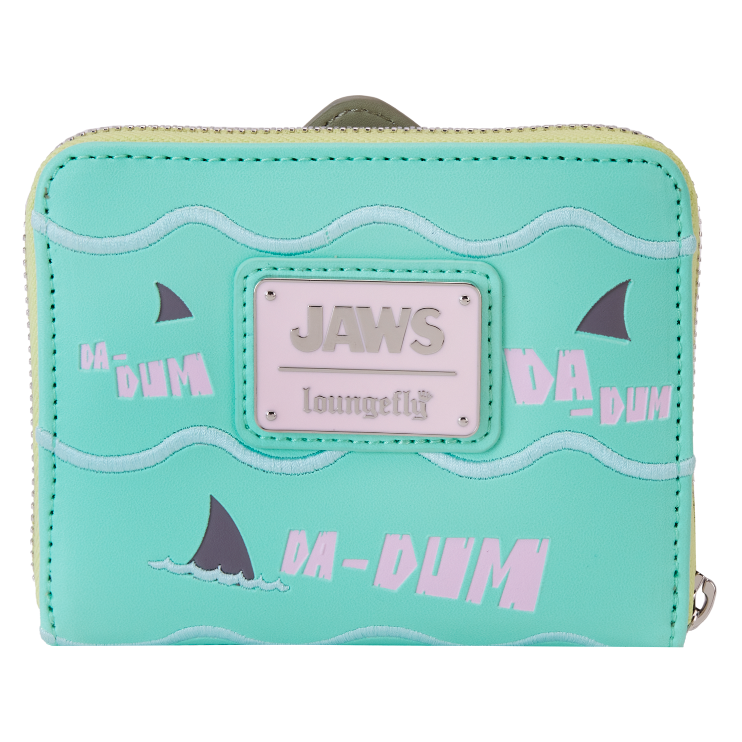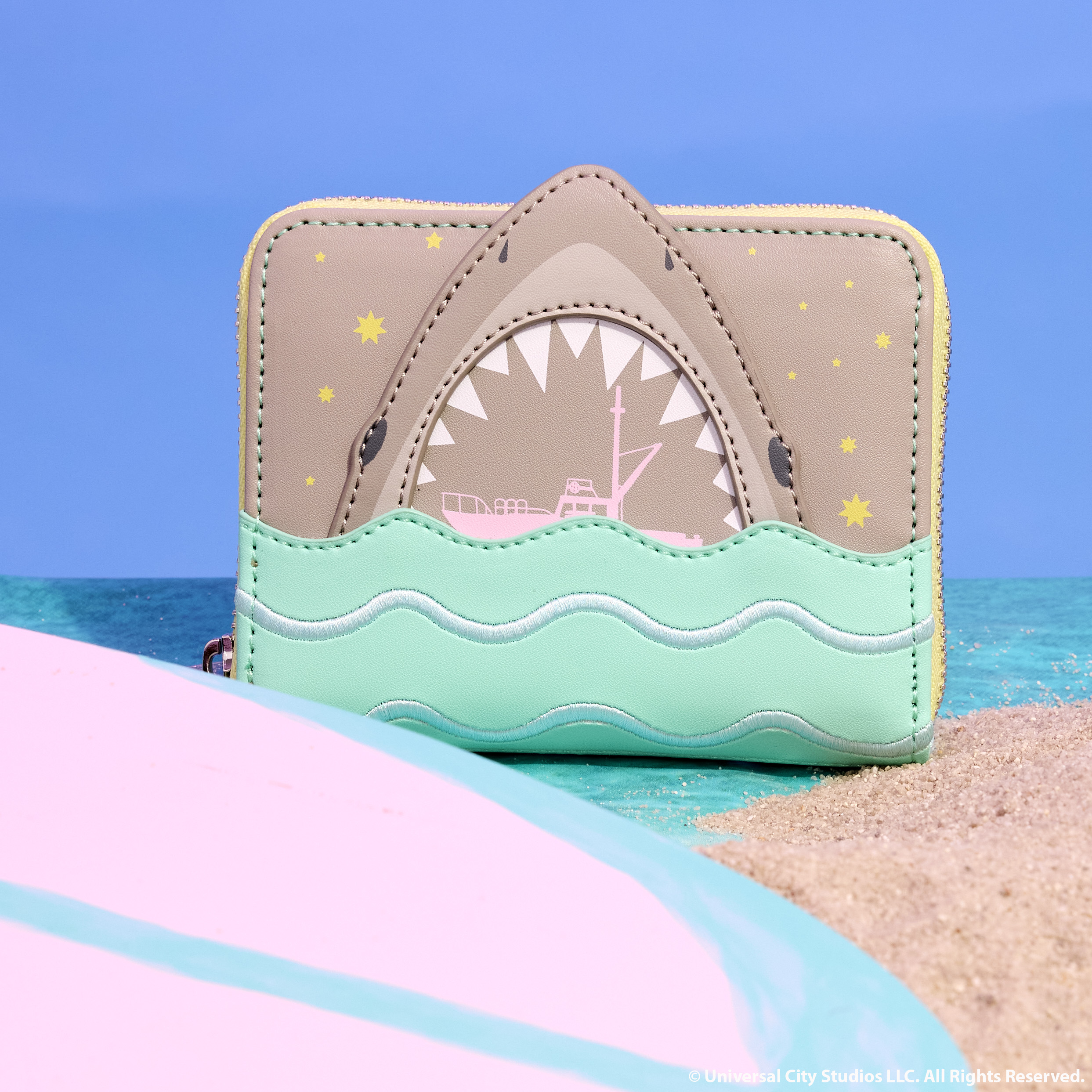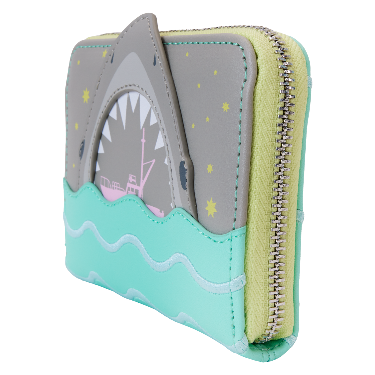Liven up the pool party with a jaw-dropping accessory. Our JAWS Zip-Around Wallet features a fresh and unexpected summer color palette in pale pink, turquoise blue, and soft gray. On the front, blue applique waves with soft blue embroidered “caps” bob beneath the pointed applique of a shark’s head inspired by the iconic film from Universal Pictures and Amblin Entertainment. The mouth is open, revealing sharp teeth—and a pink boat. In the dark, the stars, boat, and teeth all glow! On the back, you’ll find embroidered soft blue “waves,” and the words “Da-Dum, Da-Dum, Da-Dum.” A shark’s fin “swims” between the letters. Secure your valuables for an afternoon (or night) swim—or for grabbing a bite with friends.
