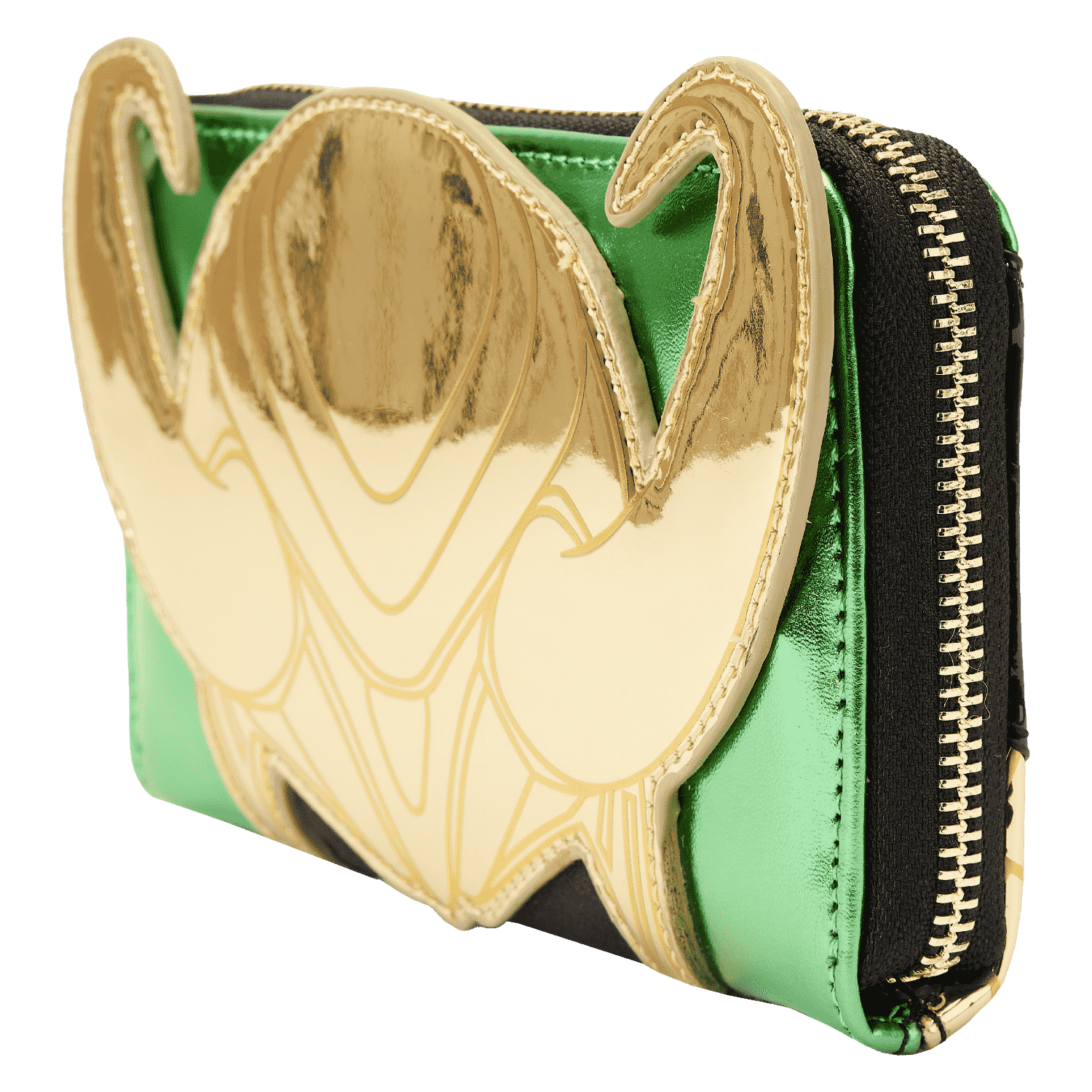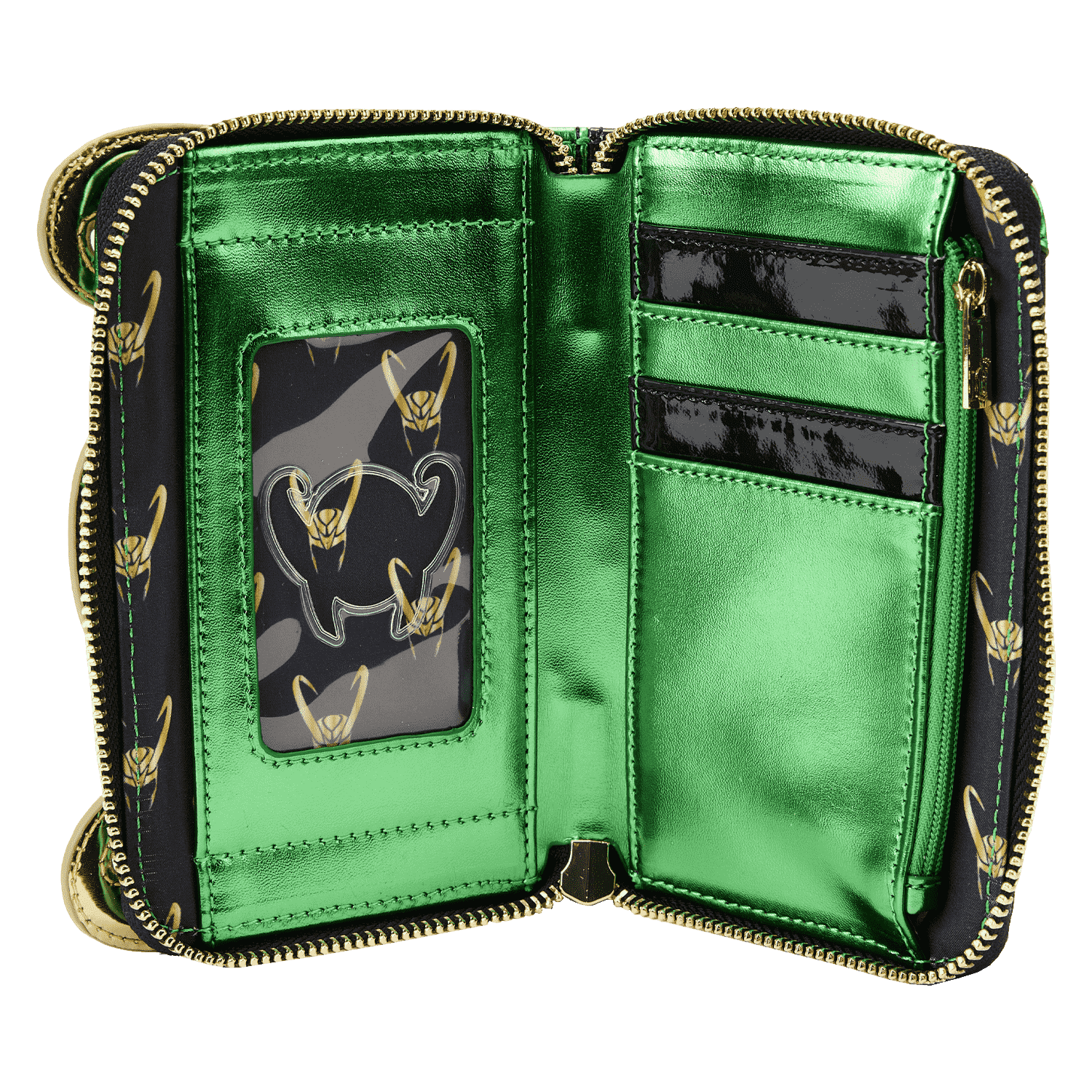 The Loungefly Marvel Metallic Loki Zip Around Wallet is made of vegan leather (polyurethane). Wallet zips closed with shiny gold hardware. Additional features include applique, debossed, glitter, and metallic details. Take note of the coordinating inside lining.