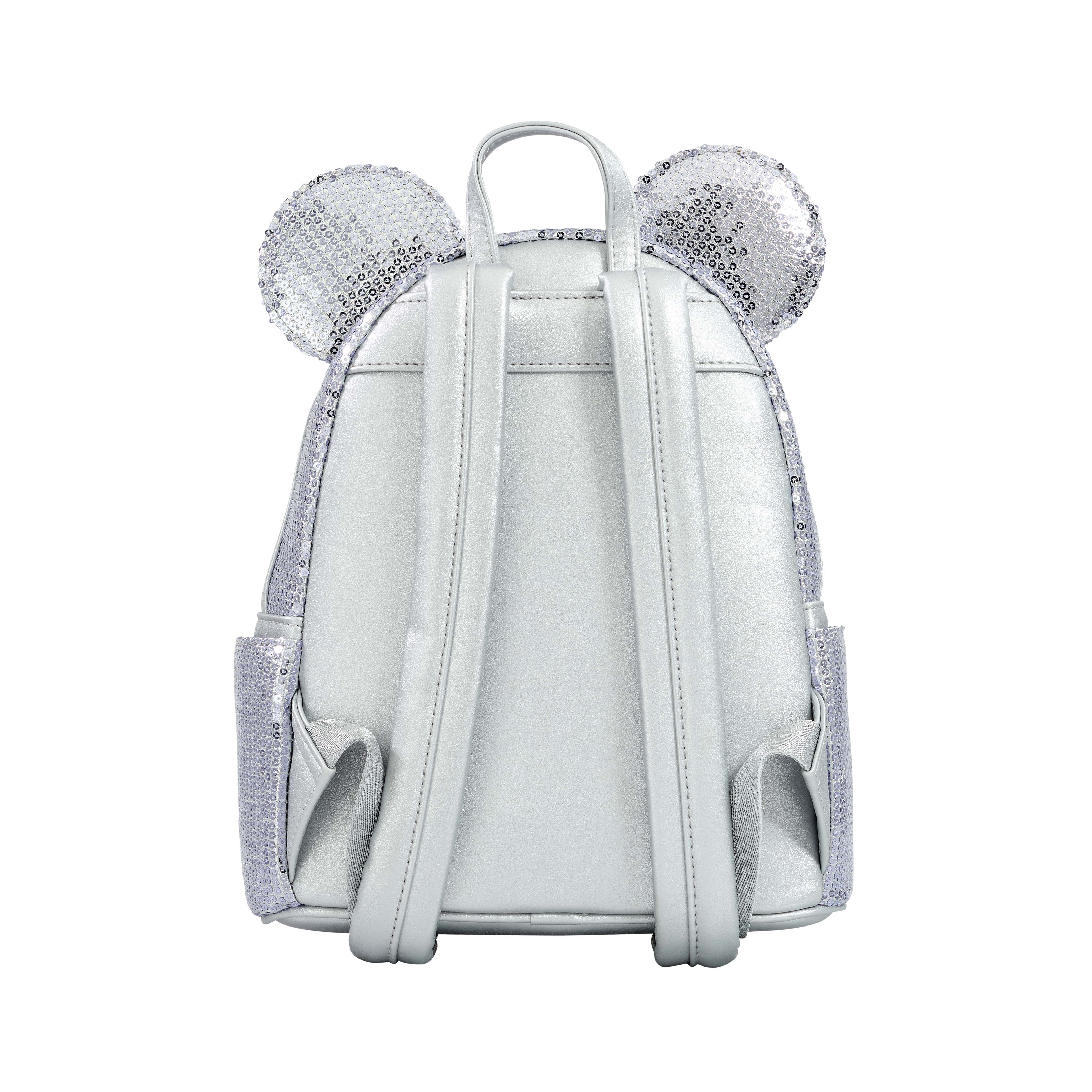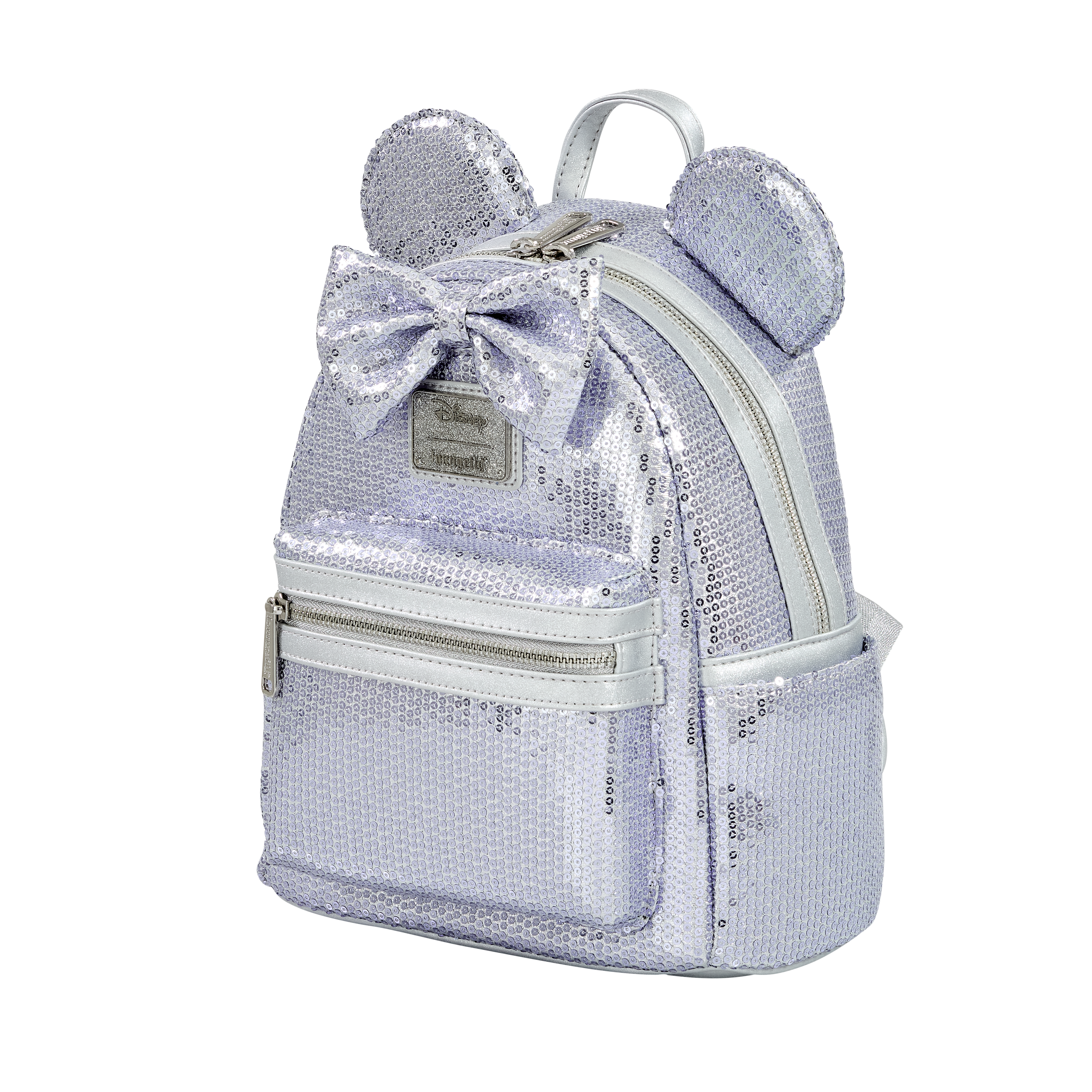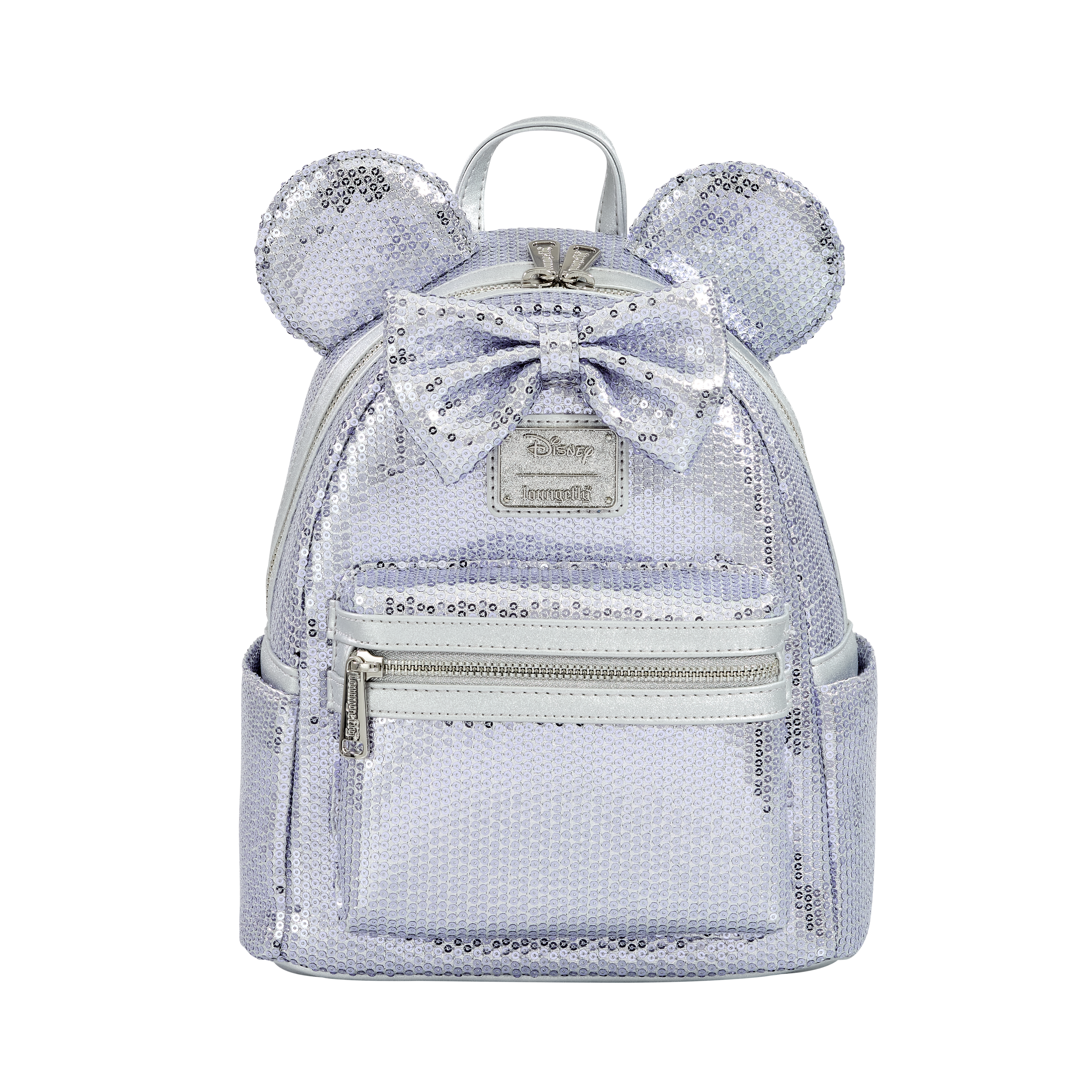 This mini backpack is inspired by Disney’s Minnie Mouse. You’ll find 3D ears at the top with a bow resting between them. The bag is covered in purple sequins, highlighted by shimmery silver faux leather for truly standout style! Take a peek inside to find a coordinating lining featuring purple Minnie Mouse silhouettes!