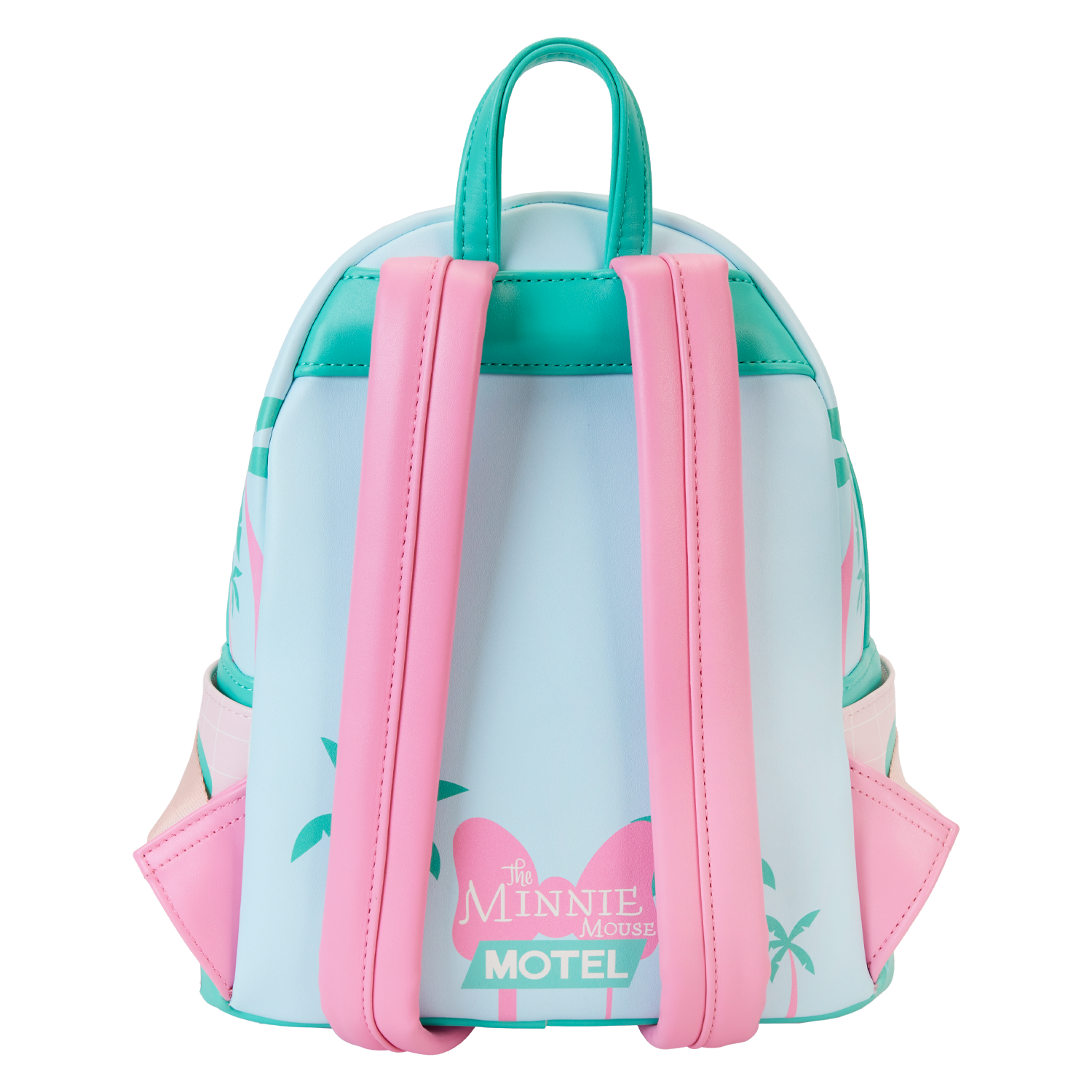 Dreaming of the perfect vacay? Check-in for your next getaway with the Loungefly Minnie Mouse Vacation Style Mini Backpack! On the front zipper pocket, Minnie takes a refreshing dip in a swimming pool. Pink tiles and embroidered tropical plants frame the water and continue onto the bag’s side pockets, while pastel palm trees appear in the sky above. On the back, palm trees surround a bow-shaped sign for Minnie’s motel. This mini backpack adds an air of relaxation to any outing and will keep your belongings safe throughout your stay.