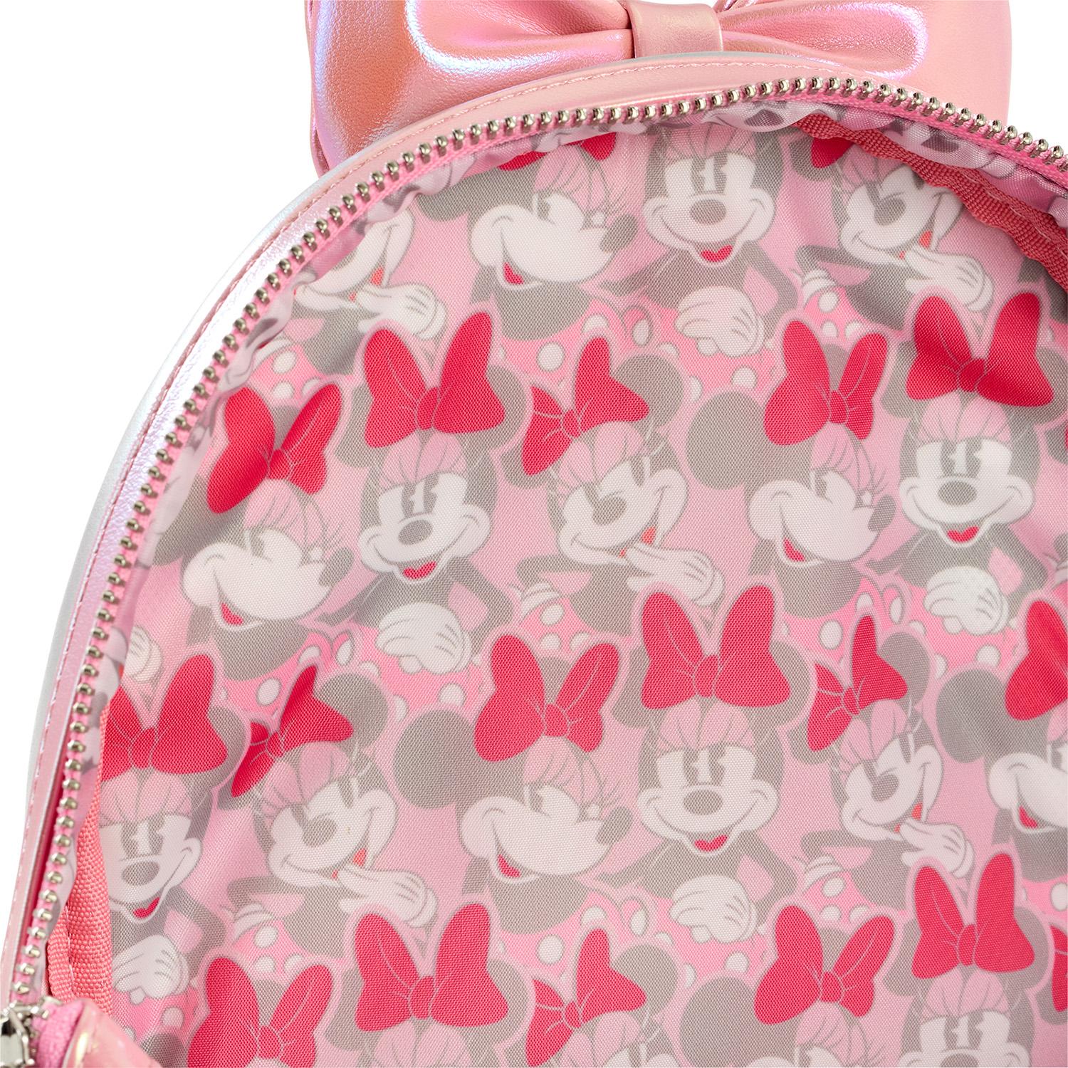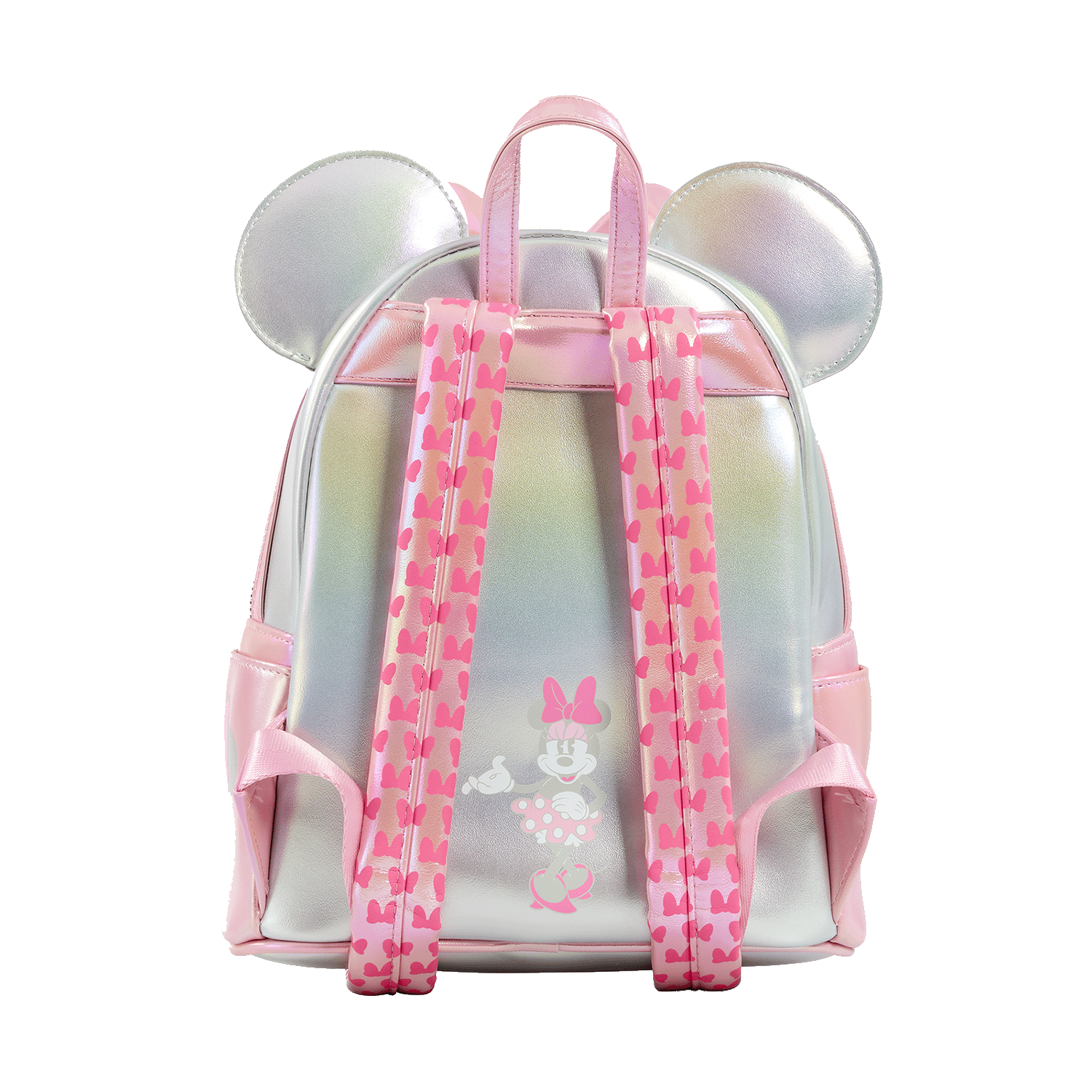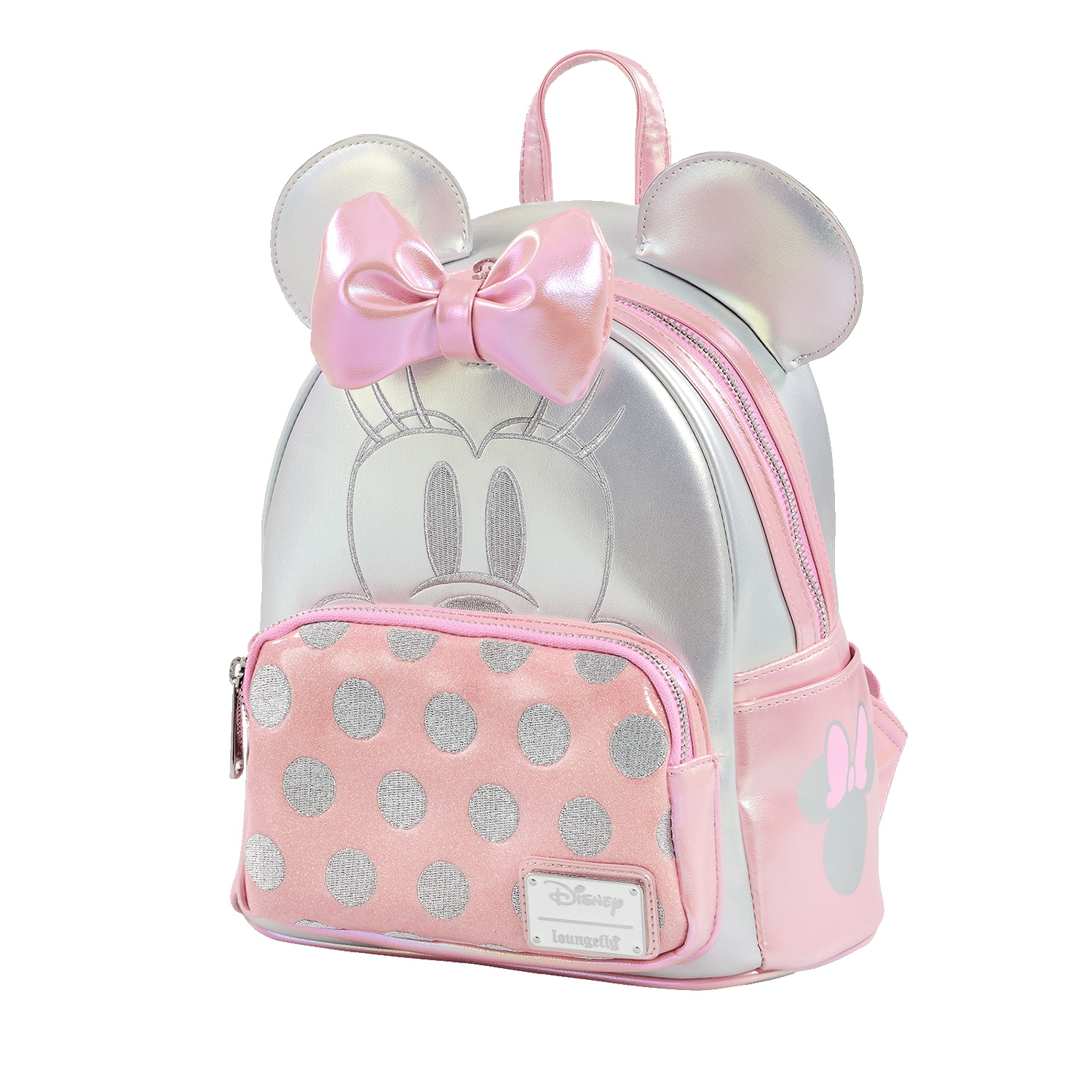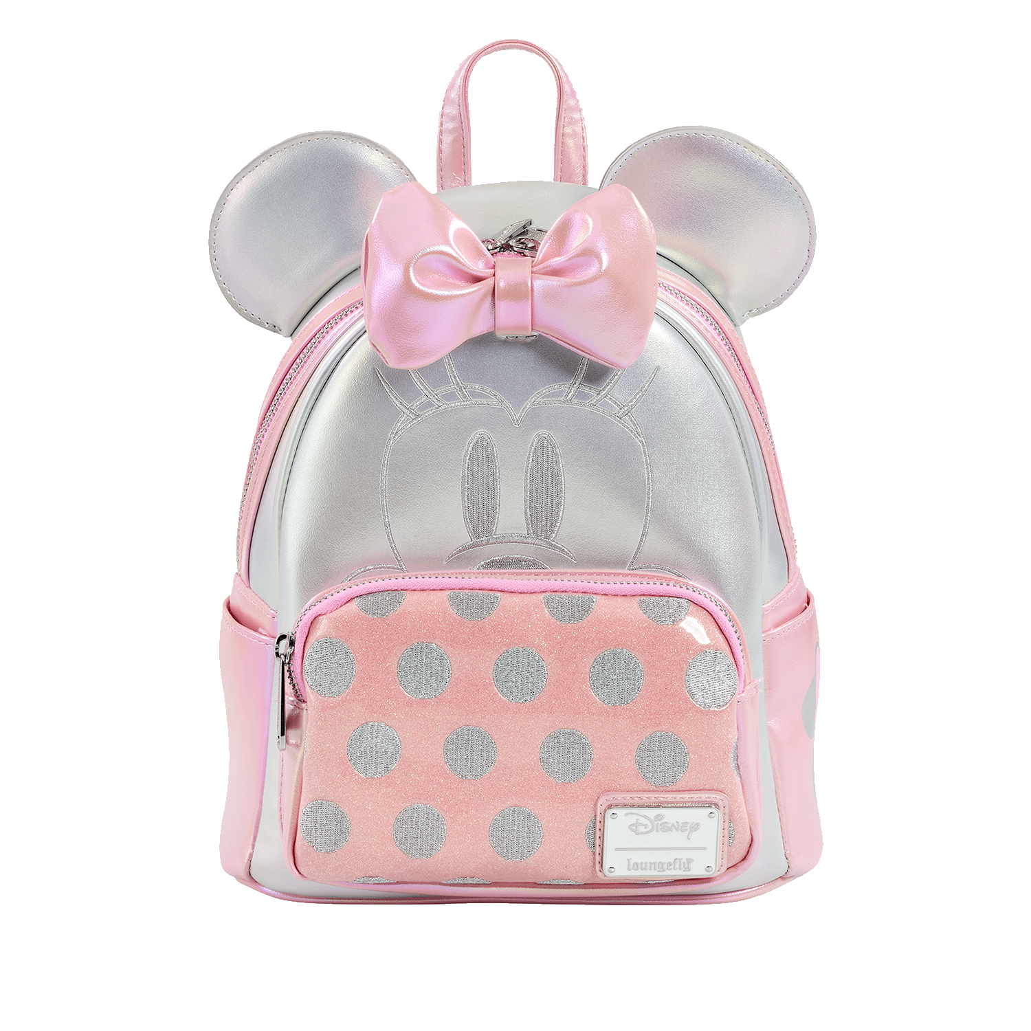 Ready to glam up an iconic look? Minnie Mouse takes shape on this mini backpack with a metallic silver and pink colourway. Sparkly glitter covers the front zipper pocket, offering a shining compliment to the polka dots of her classic style. Add fashionable flair to any outfit by taking this adorable accessory on your next adventure.