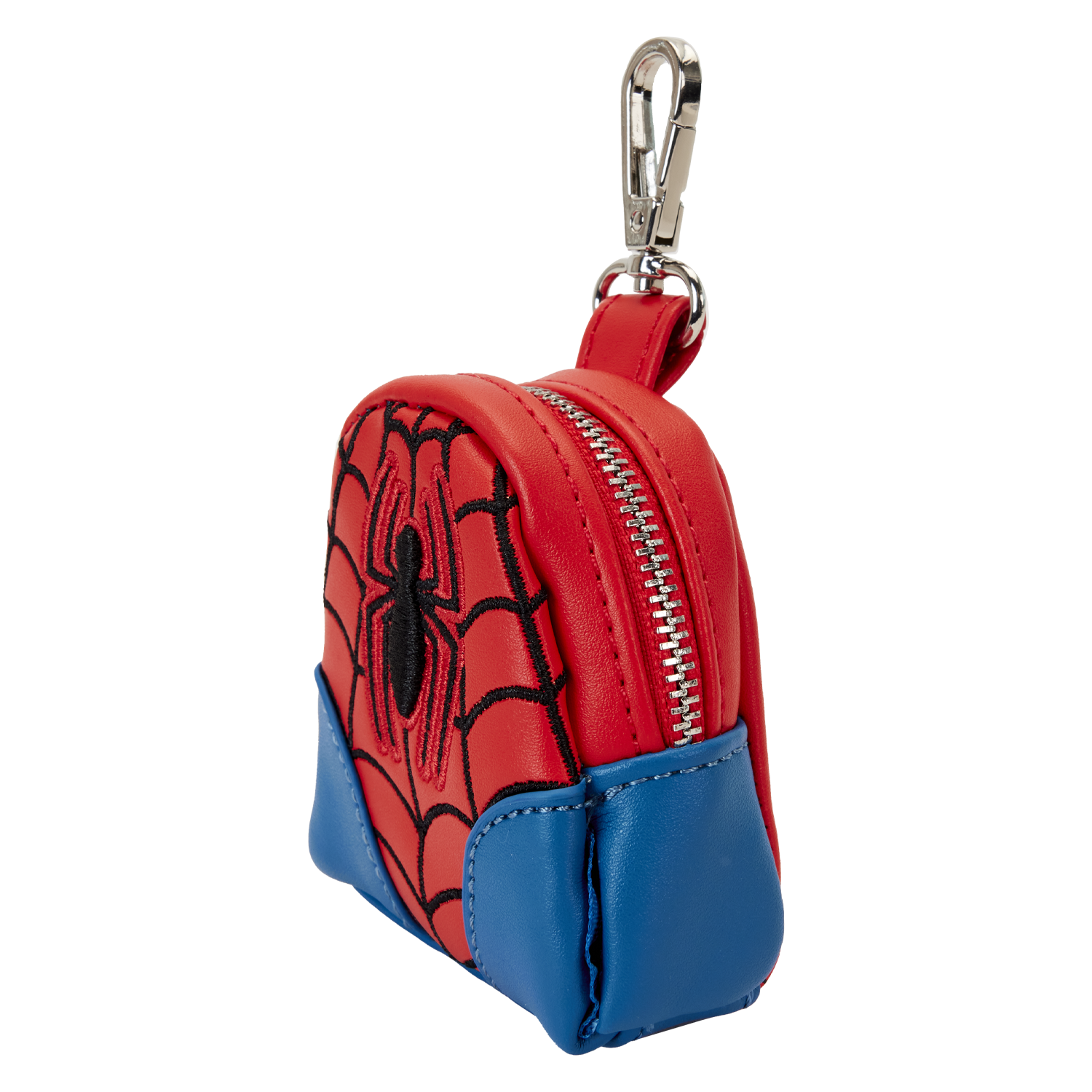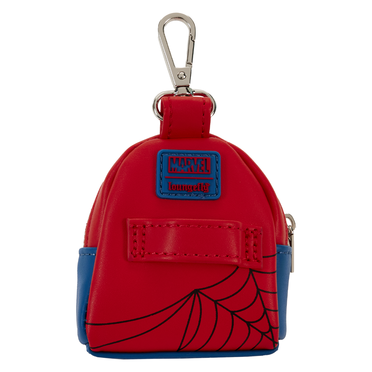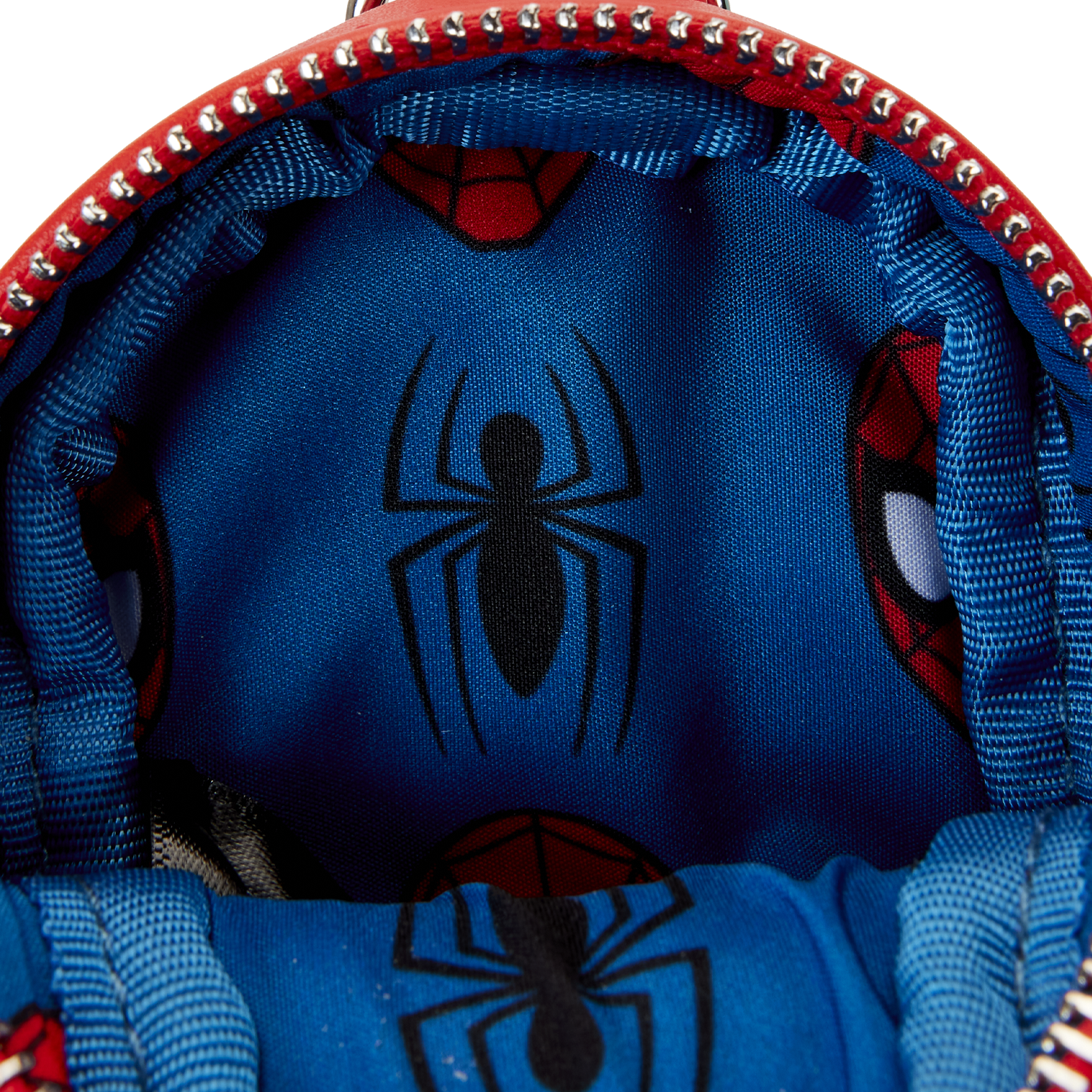 The Loungefly Marvel Spider-Man Treat Bag features vegan leather, printed and applique details, and shiny silver-colored metal hardware. Take note of the coordinating inside lining.