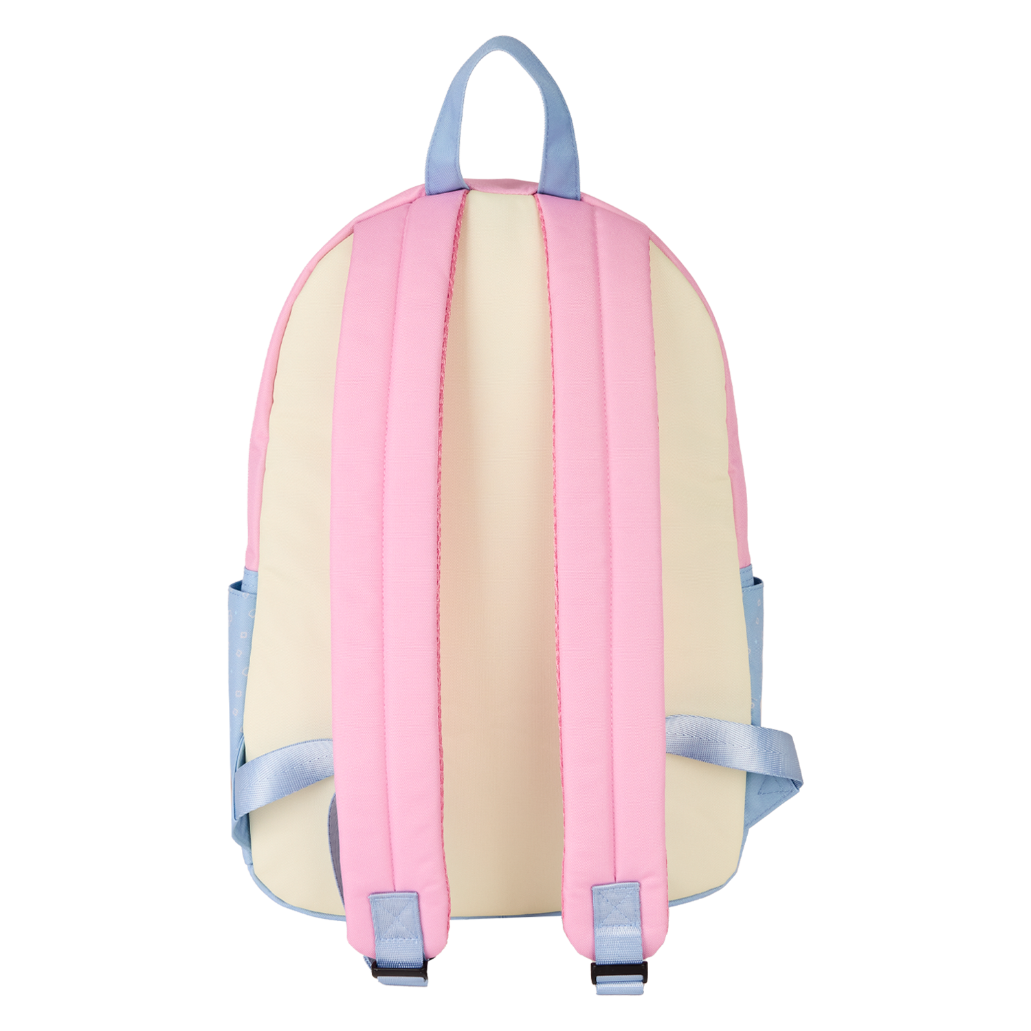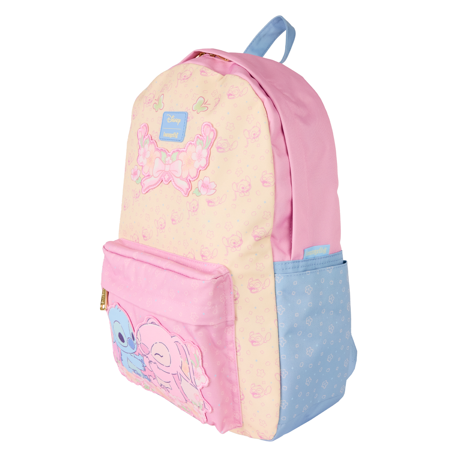 This full-size backpack features Stitch and Angel sitting together on a pink front pocket surrounded by flowers. The rest of the bag features an all-over print of pink flowers and some colour-blocked sections of pink and blue.