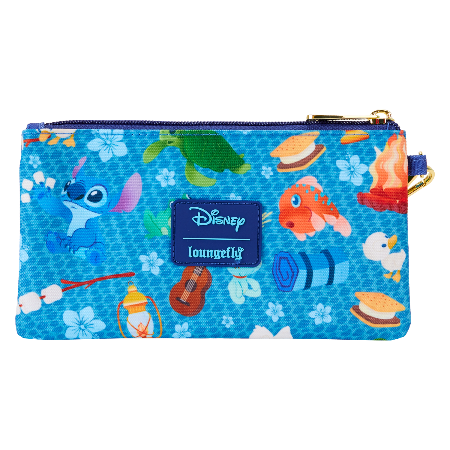 The Loungefly Stitch Camping Cuties AOP Wristlet features shiny gold hardware, detachable wrist strap, and printed details. Inside features three slots for holding cards and important items. Take note of the coordinating inside lining.