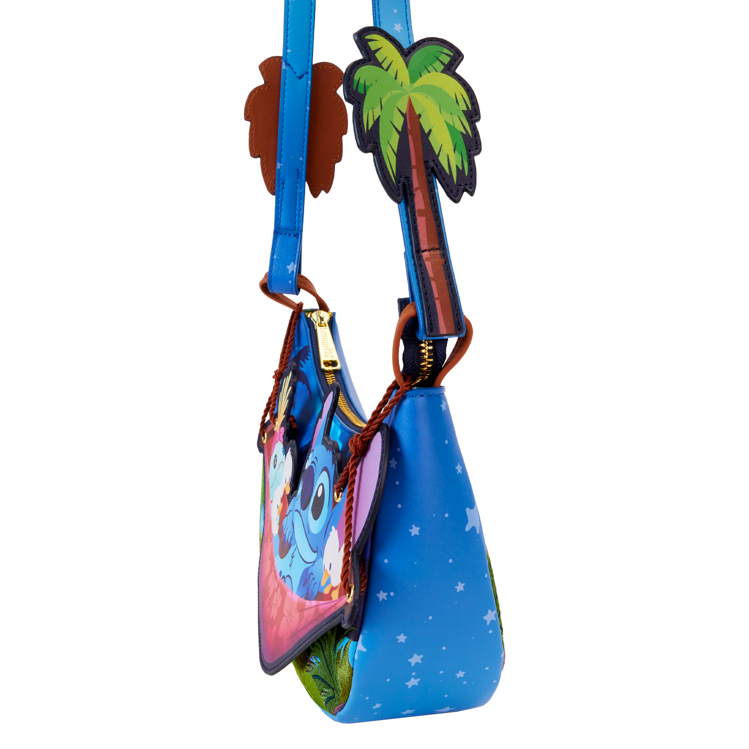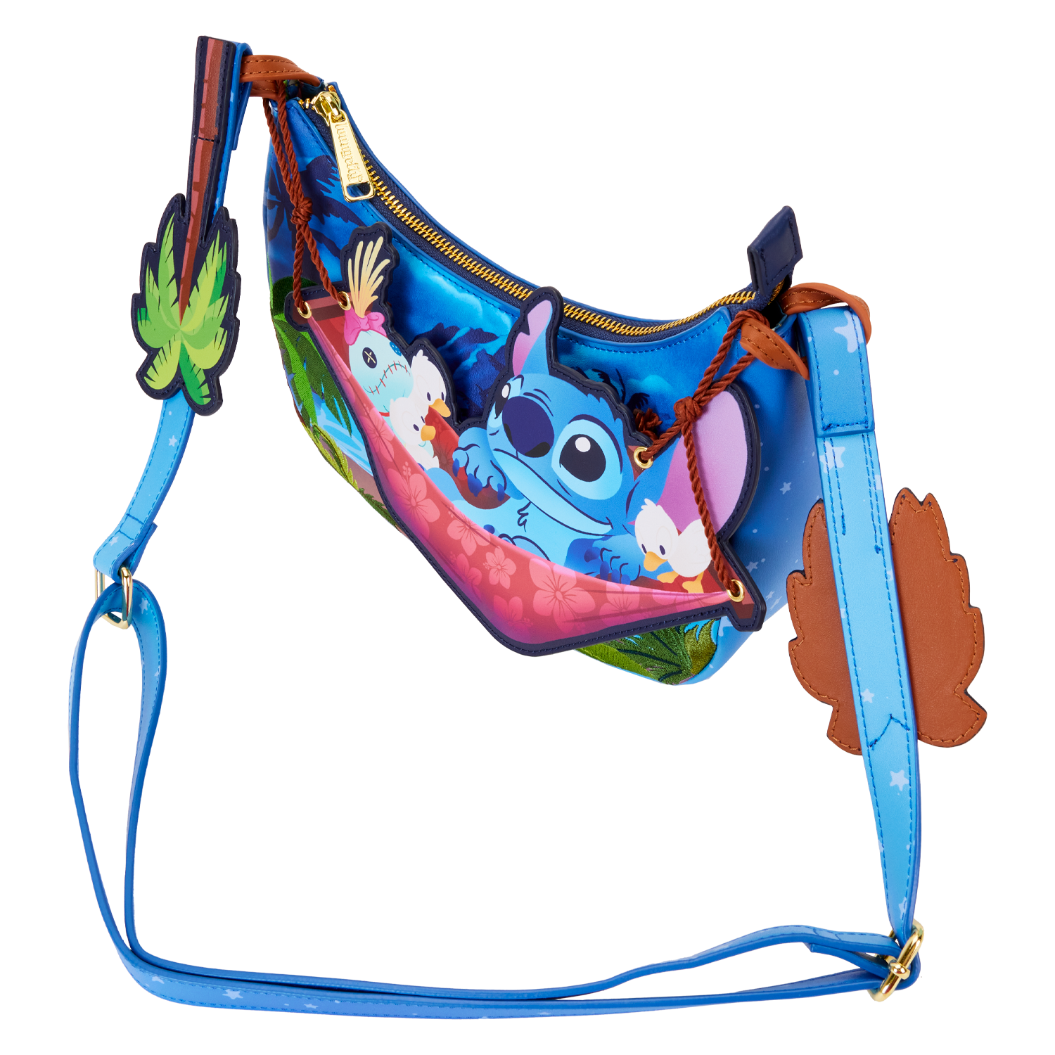 The Loungefly Stitch Camping Cuties Hammock Crossbody Bag is made of vegan leather (polyurethane). Bag has adjustable shoulder strap and shiny gold hardware. Additional features include applique, real rope, and printed details. Take note of the coordinating inside lining.