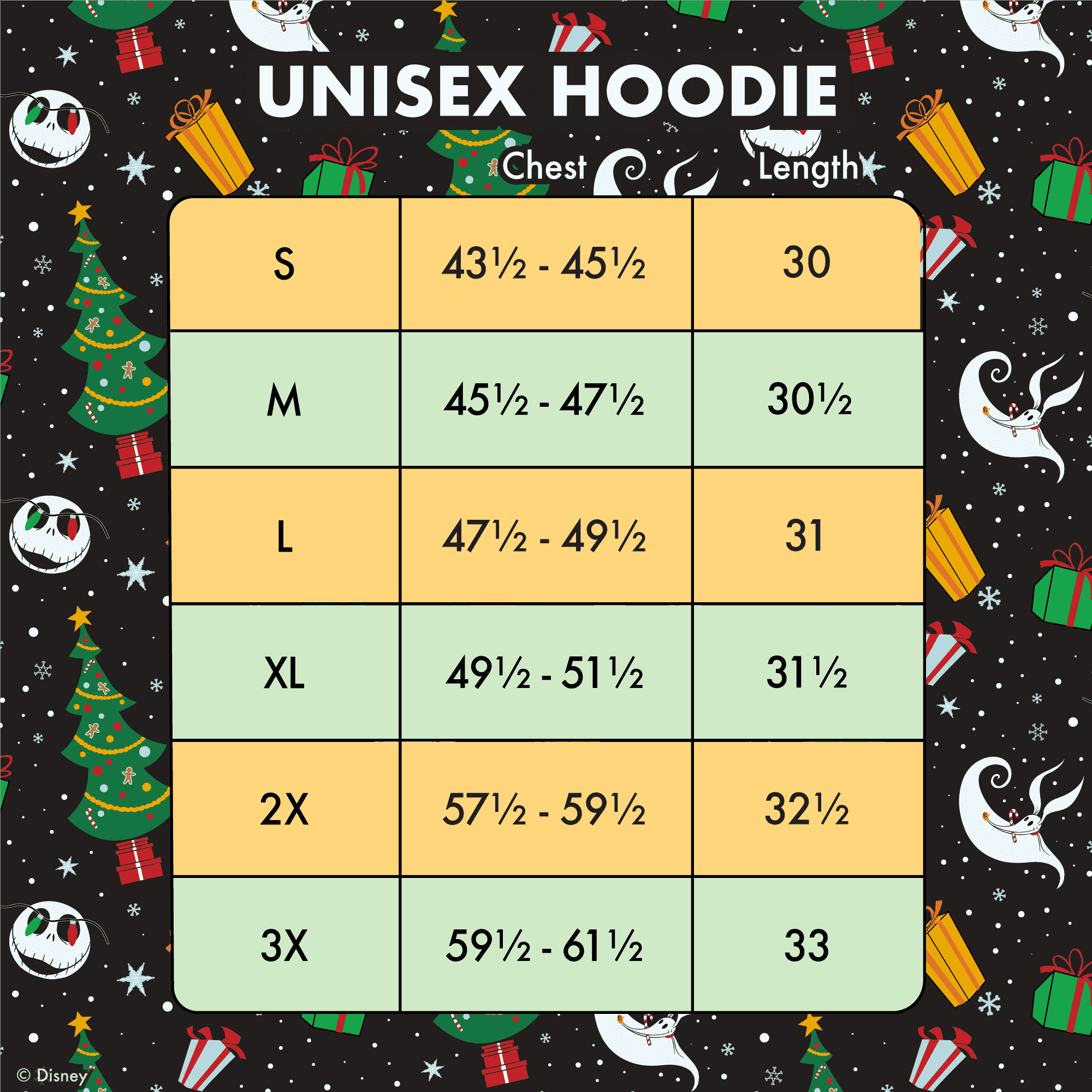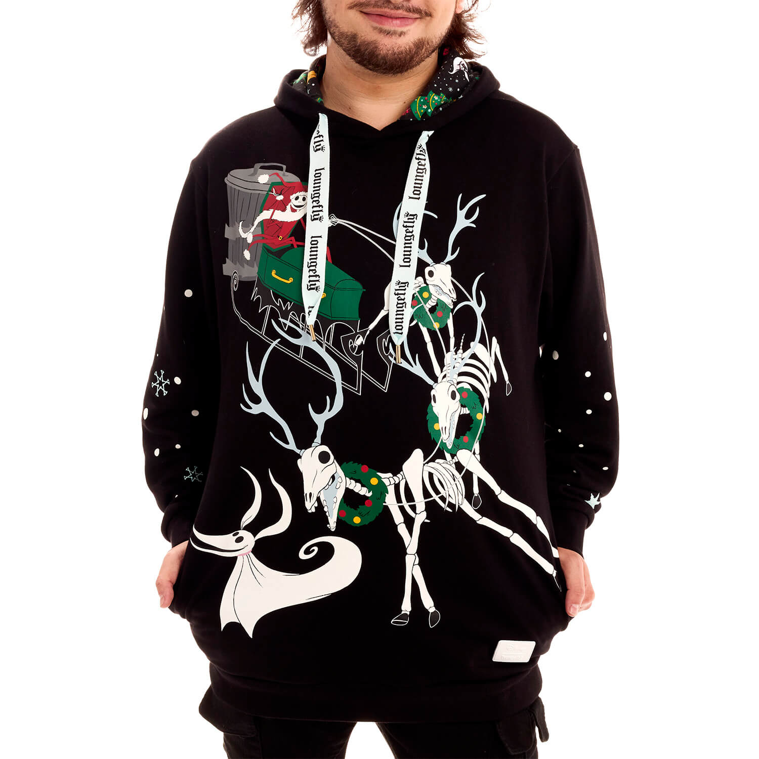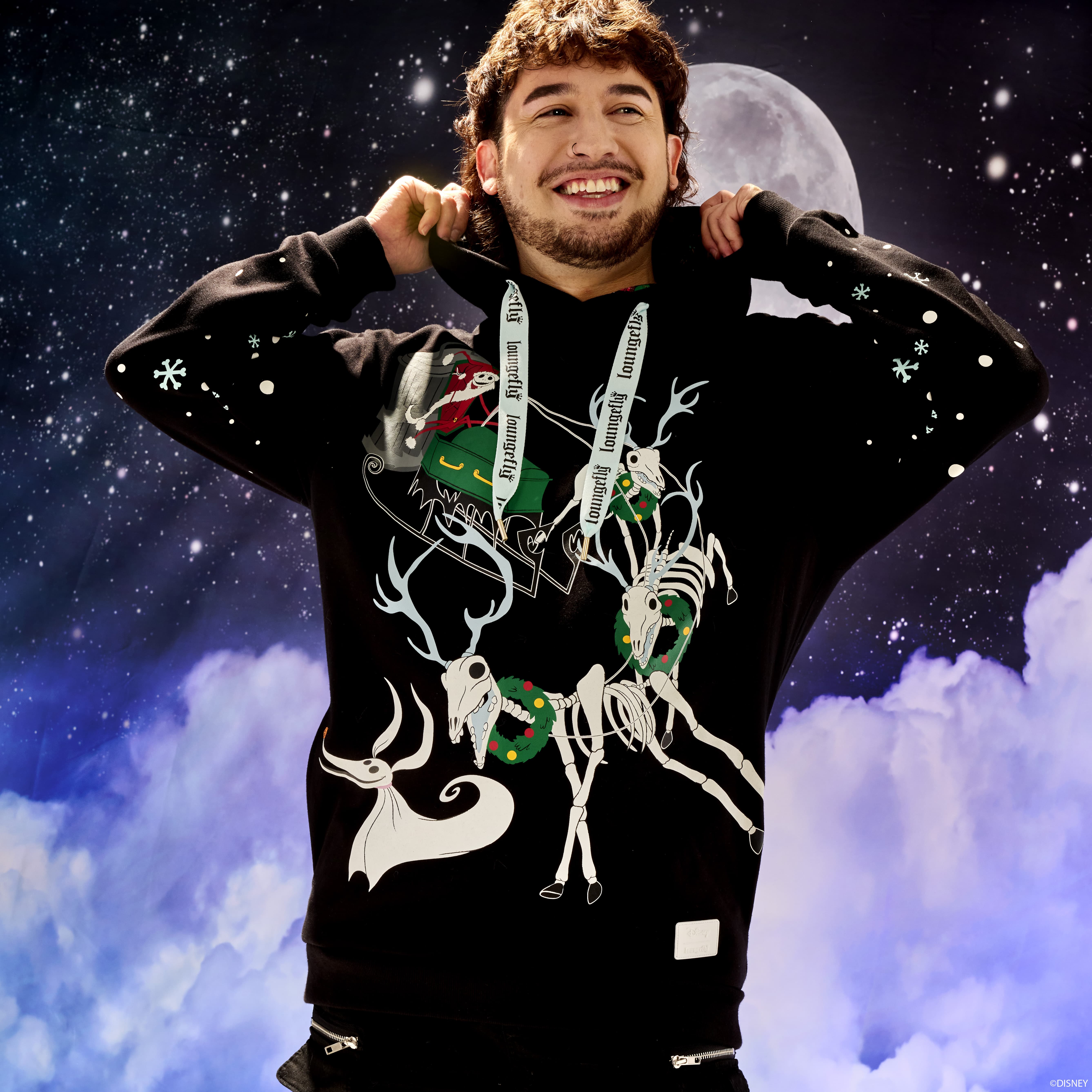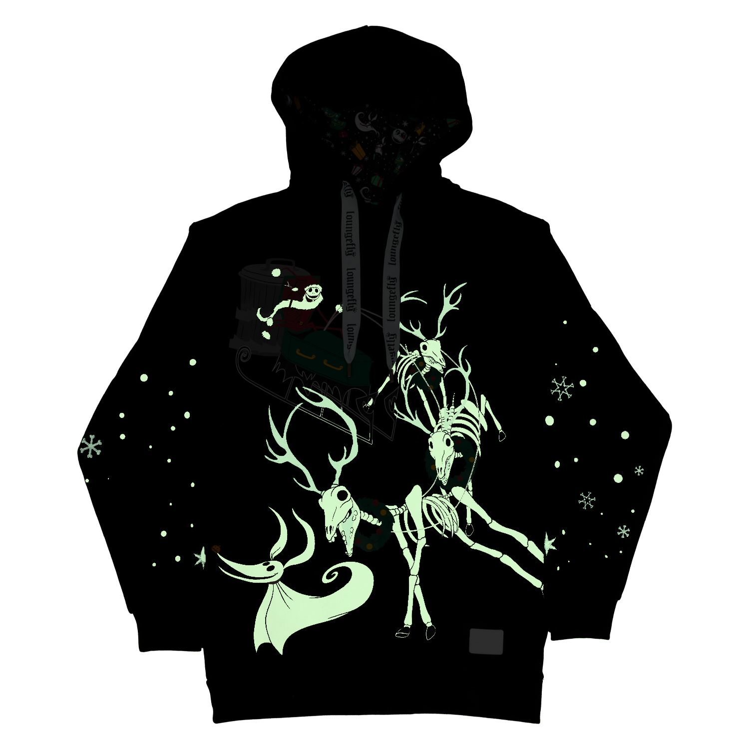 Fancy a holiday from your holiday? Jack Skellington puts a new twist on your winter festivities with this spirited hoodie. Dressed as Sandy Claws, Jack drives a sleigh led by a team of skeleton reindeer. Turn down the lights to see the design glow in the dark! This hoodie makes a cozy addition to any outfit and is sure to add warmth to your chilly nights.