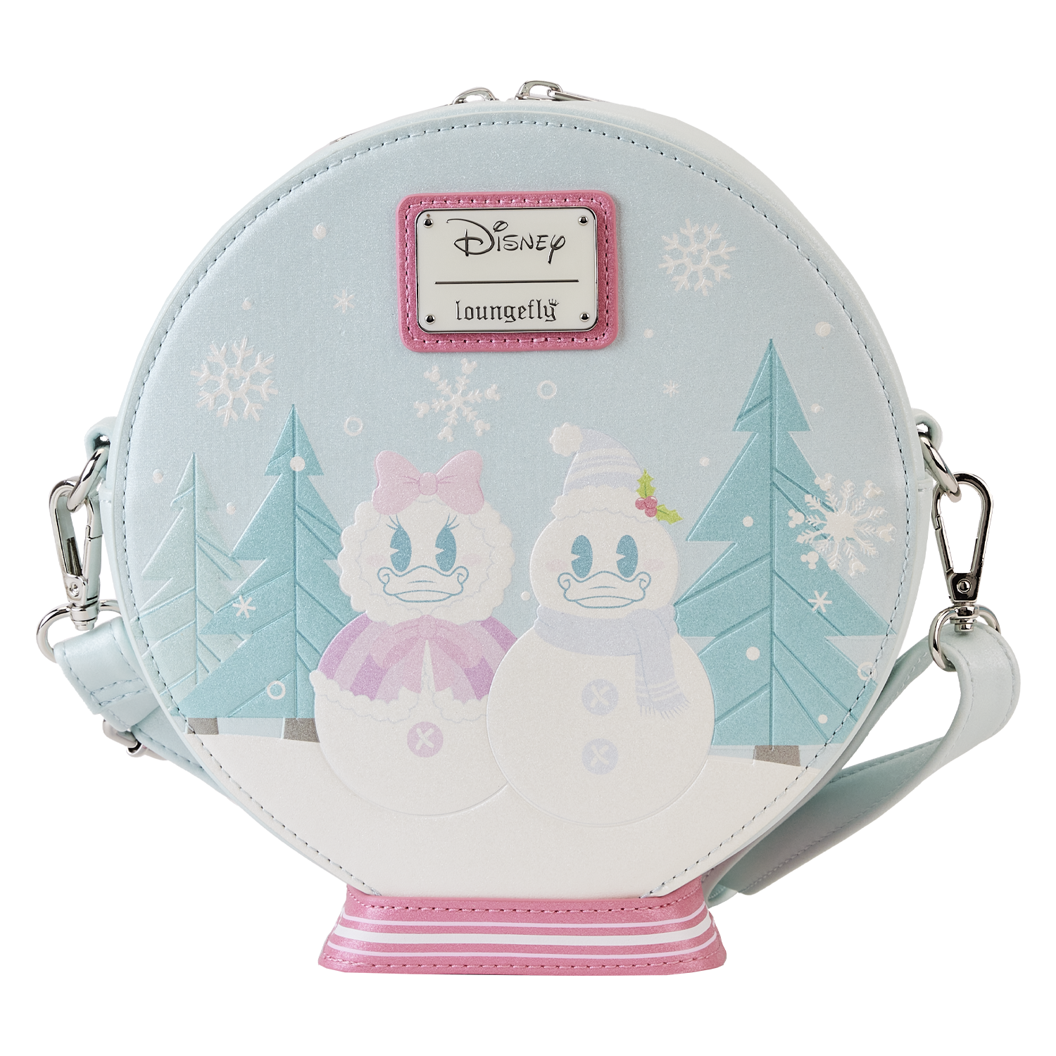 Ready for a look that's fresh as new-fallen snow? The Loungefly Mickey and Friends Winter Snow Globe Crossbody Bag gives a cool new look to your winter wardrobe. Using three-dimensional details, this bag takes the shape of an adorable see-through snow globe. On the front, Mickey and Minnie appear as snowmen in a snowy forest. Shake the bag to bring the scene to life with loose pom-pom snowballs that rest along the dome's base. On the back, Daisy and Donald Duck appear as snowmen. Perfect for adventuring through the snow or cuddling up by the fire, this crossbody bag will keep your belongings safe as you skate through the season in style.