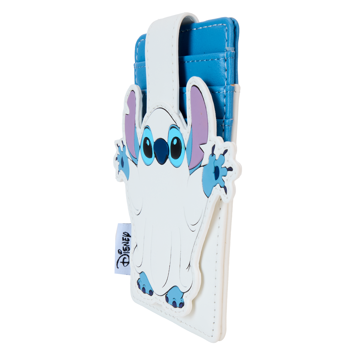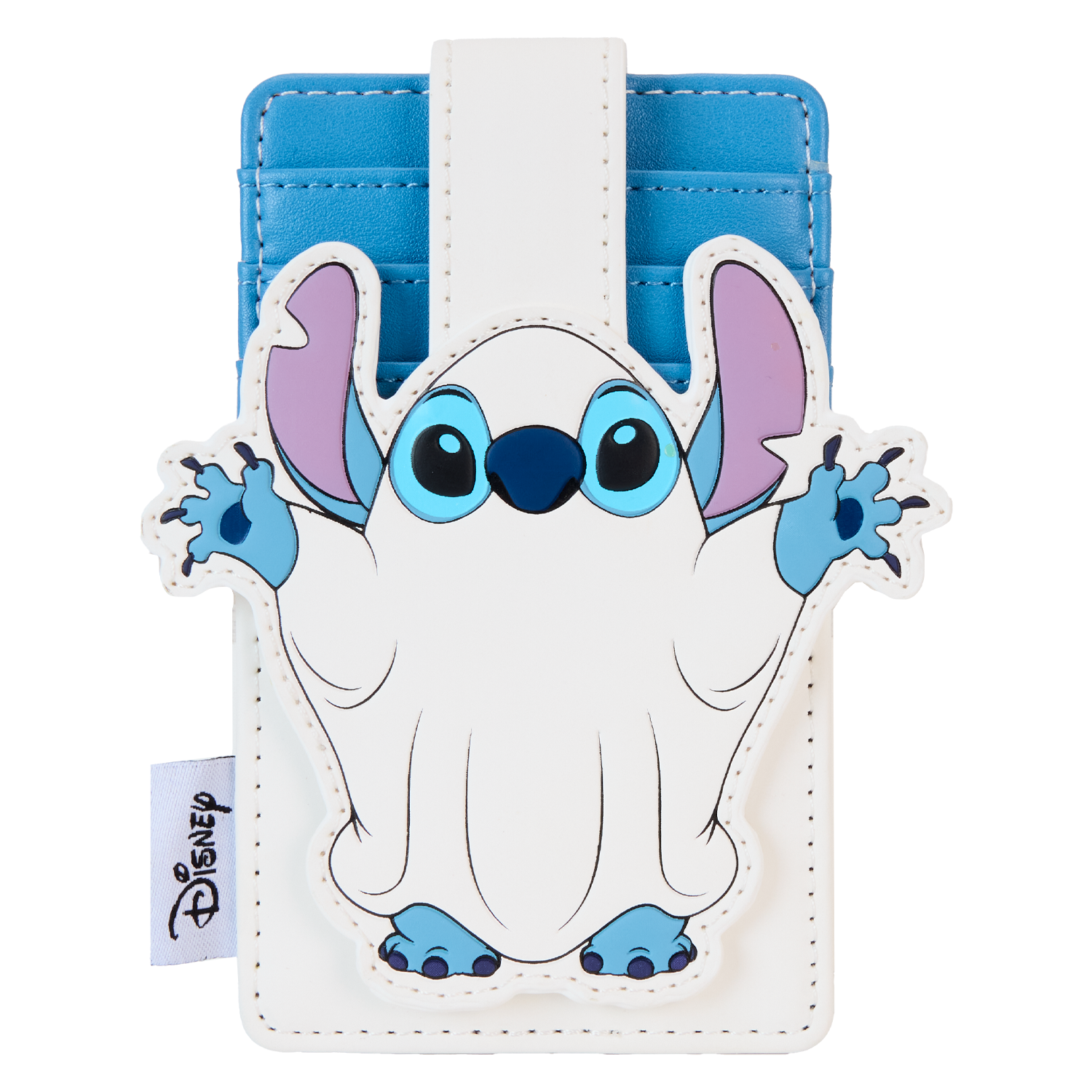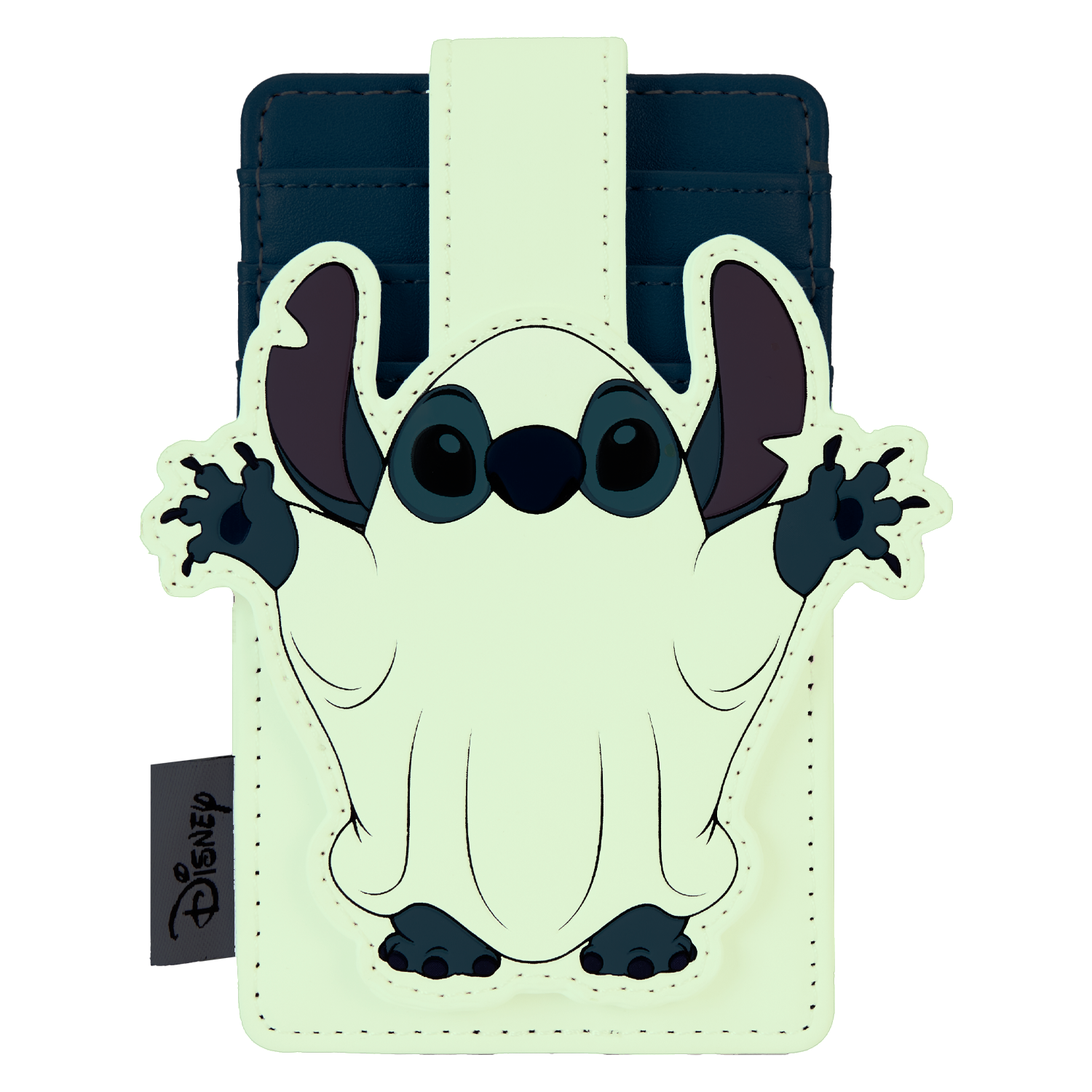 Ready to cause some mischief? Stitch has dressed the part for a surprise on this scary-fun card holder. His hands, feet, and ears stick out from the costume, giving you a sneak peek as to who’s really behind this ghostly facade. Turn down the lights to see him glow in the dark! This accessory makes a playful addition to any outing and is perfect for Disney fans looking to keep one of their favorite characters close.