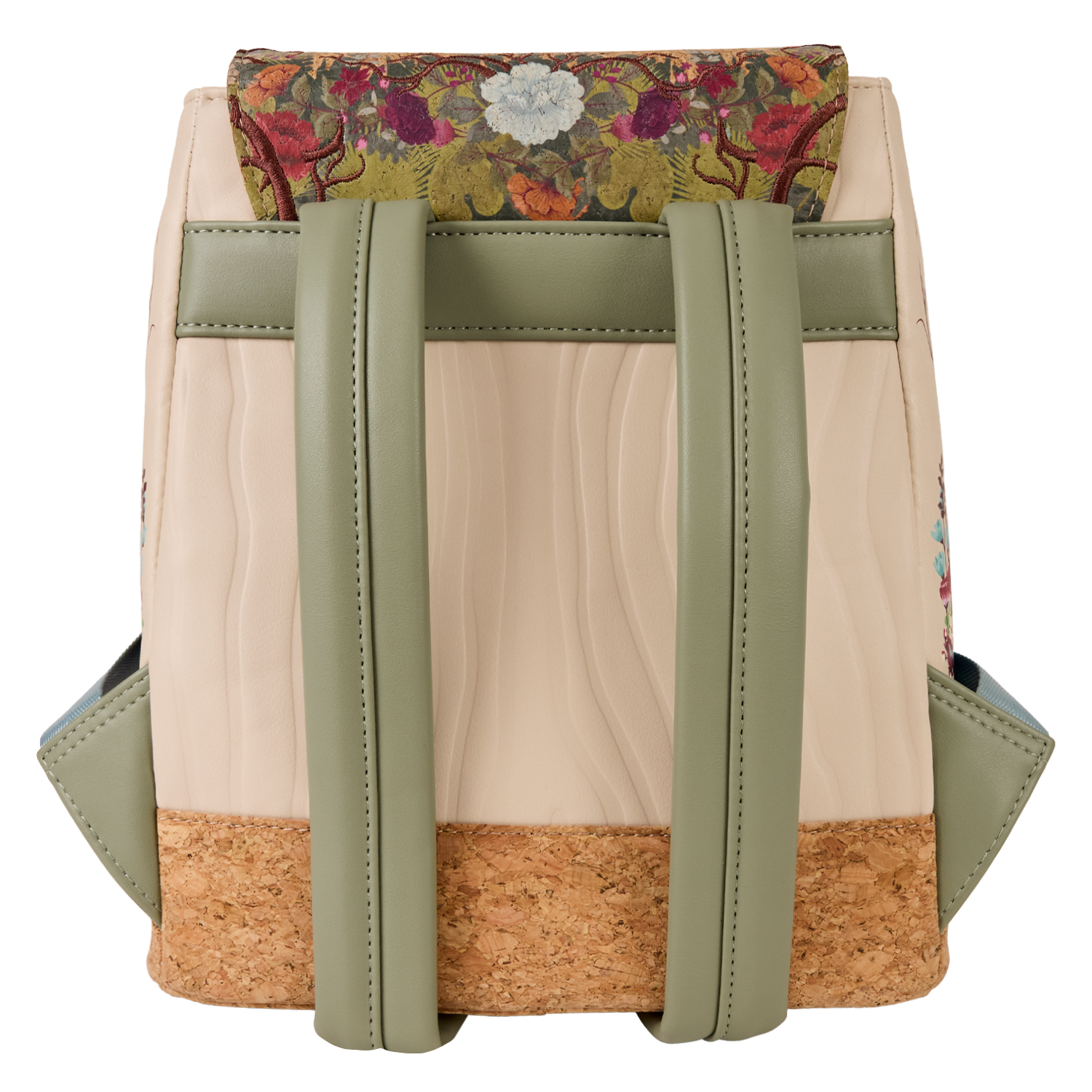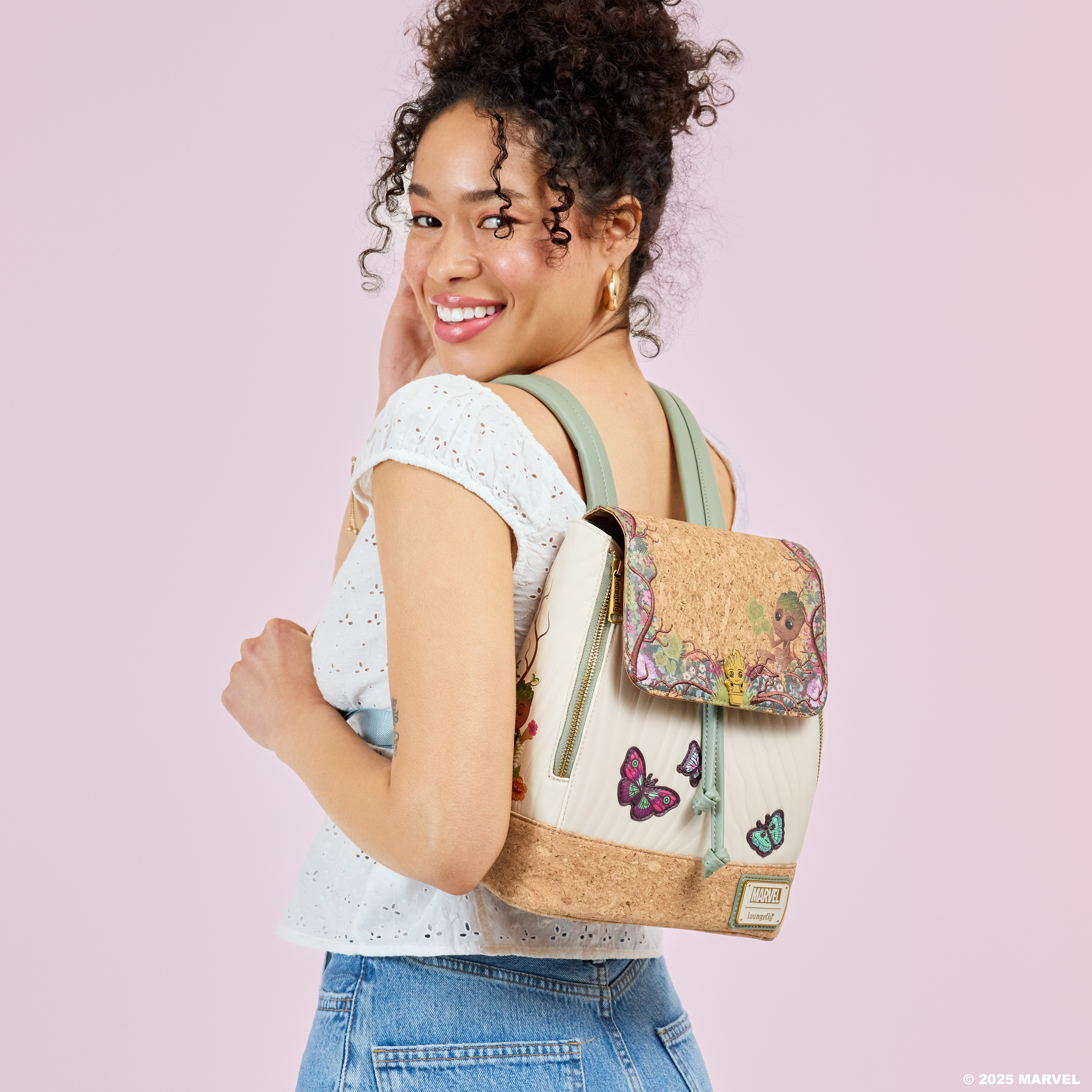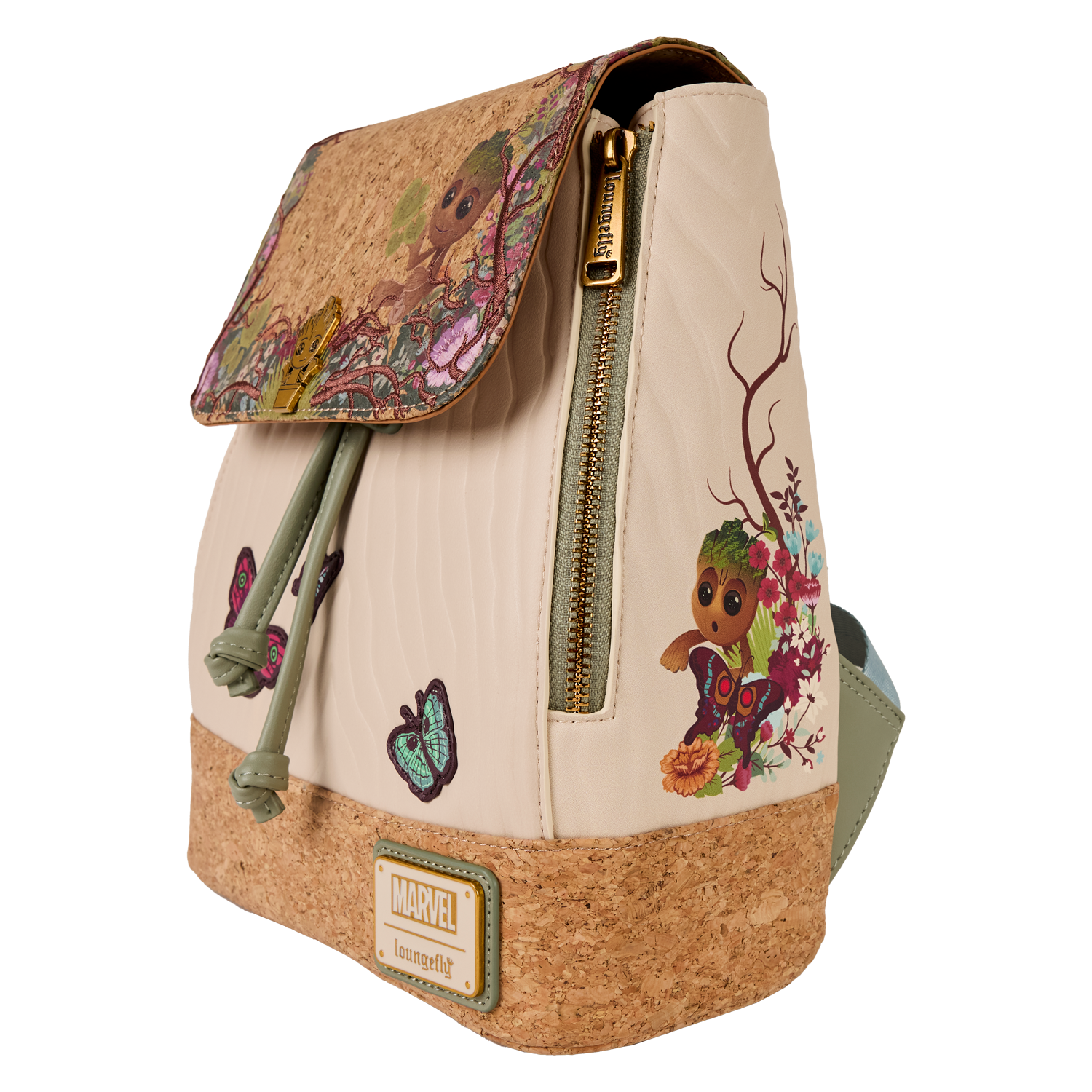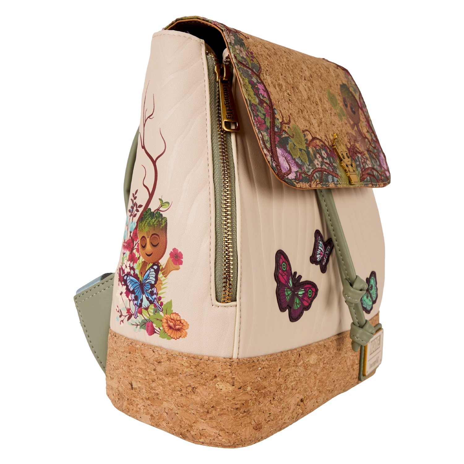 This mini backpack is inspired by Groot from Marvel's Guardians of the Galaxy. Find embroidered butterflies and flowers on this bag, along with an image of Groot sitting amongst them. Faux cork accents and wood texture give it an outdoorsy feel that still has an elevated vibe.