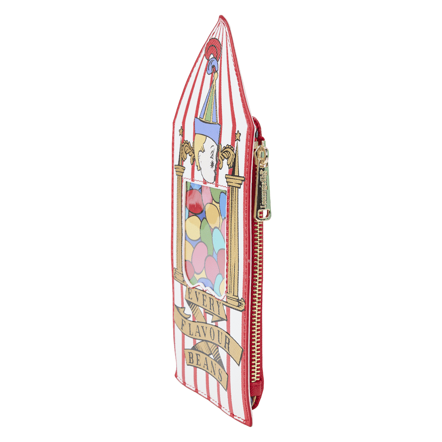 Board the Hogwarts Express™ in style with our Loungefly Warner Bros. Harry Potter™ Bertie Bott’s Every-Flavour Beans™ Card Holder. This card holder takes on the carnival-striped-tent-box shape, characteristic of the special treat Harry Potter samples from the trolley on the train. Red and white stripes cover the front of the card holder. You’ll also find the Bertie Bott’s Every-Flavor Beans logo, along with a printed picture of the candies behind a clear PVC window. On the back, there are 4 slots for holding cards and a zipper compartment for securing coins or other valuables. Your travels will never lack variety when you carry this charming accessory along.