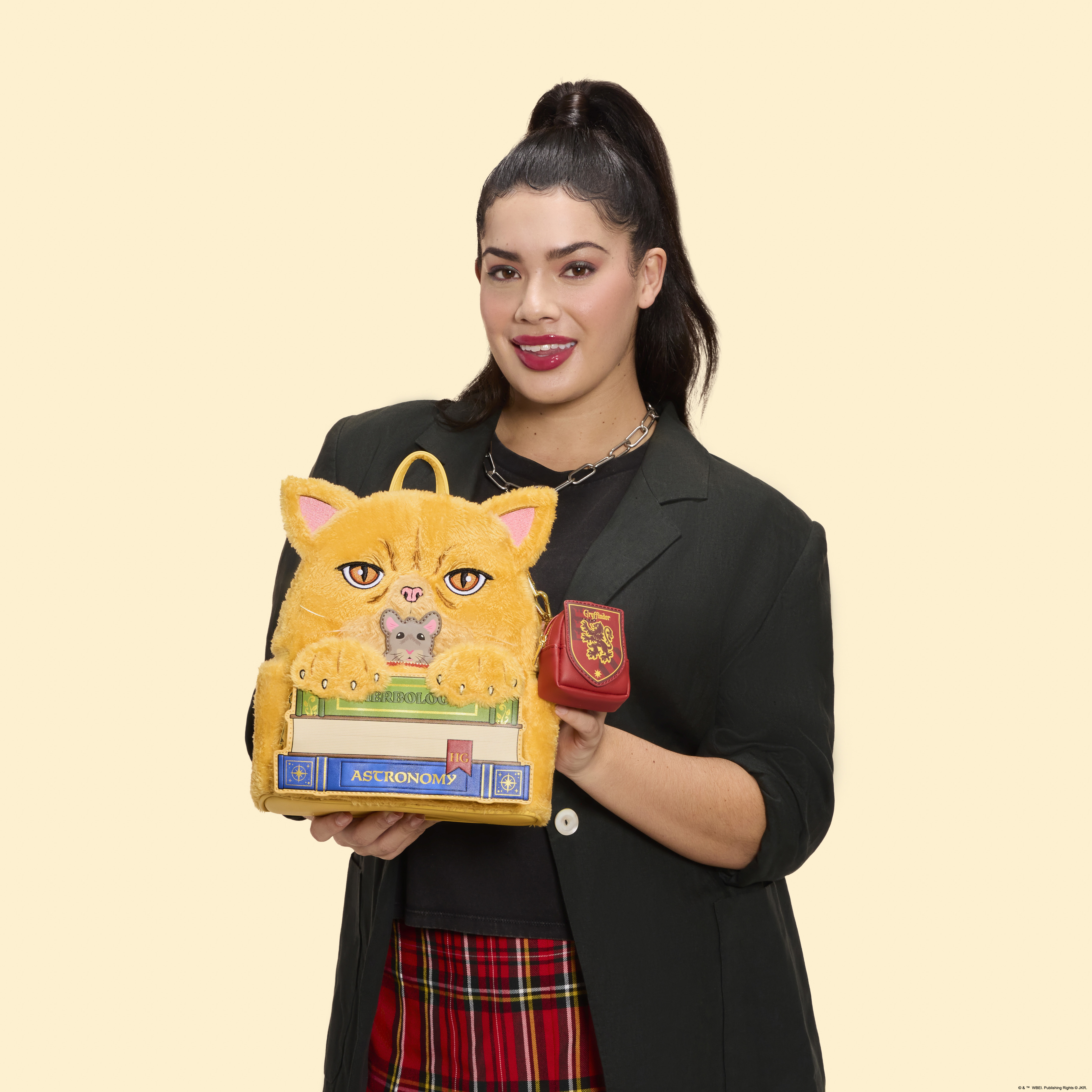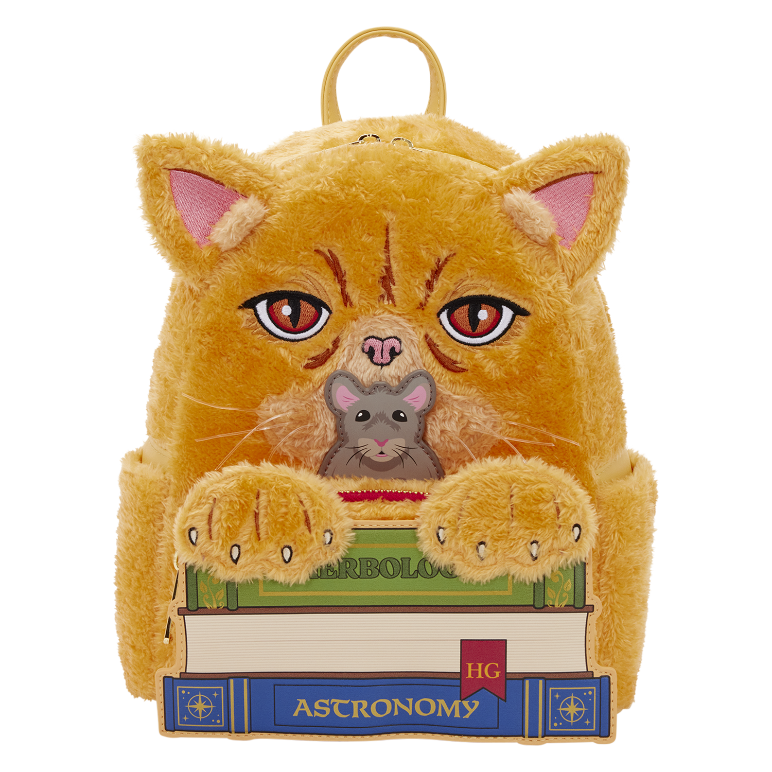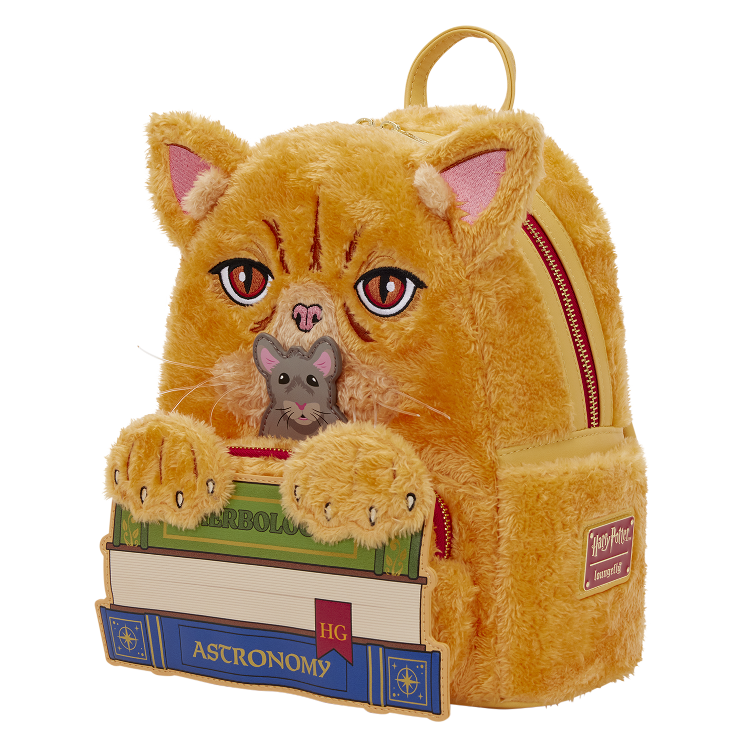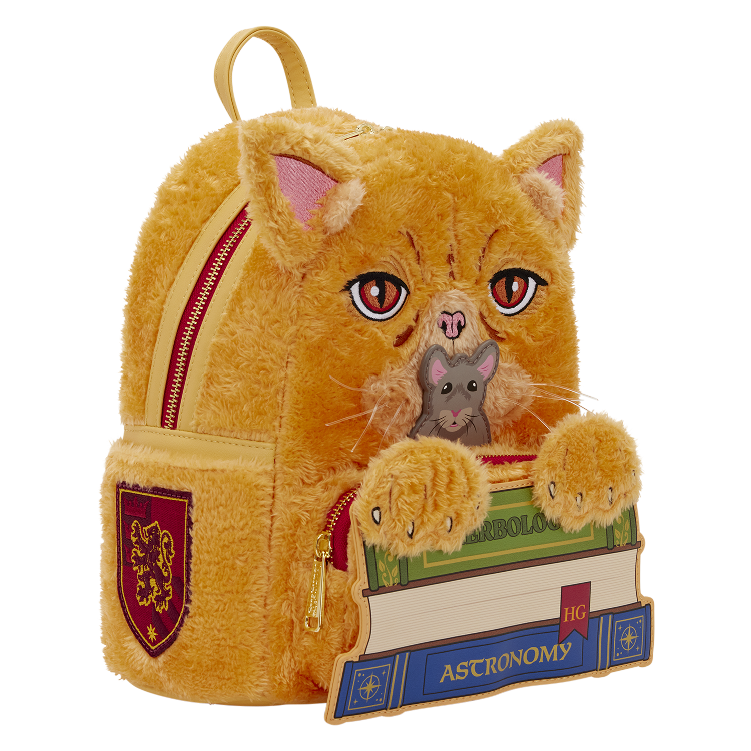 This mini backpack is inspired by Hermione Granger's cat, Crookshanks! He appears behind a stack of books, complete with faux fur and embroidered facial details. Scabbers pops up from behind the books, too! On the side, you'll find an embroidered patch of the Gryffindor symbol.