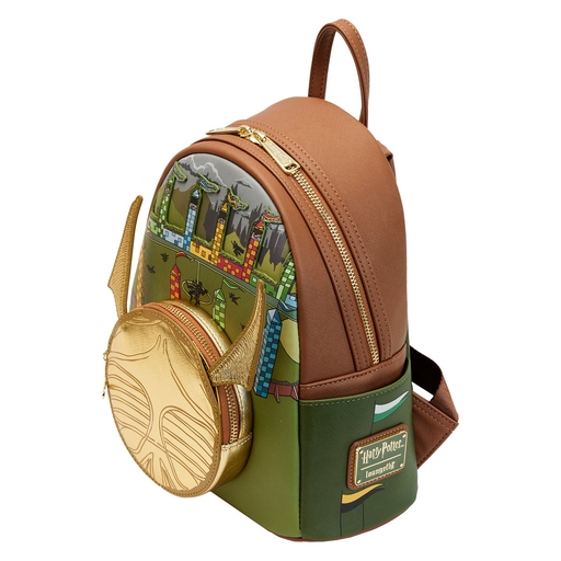With the swish of broomsticks and the roar of the crowds, a Quidditch™ match is in full force at Hogwarts™. Capture the excitement—and the Golden Snitch™—with our Loungefly Harry Potter™ Golden Snitch Mini Backpack. Coming to life in gold metallic and applique details, the Golden Snitch “flies” with movable wings! This coveted prize takes over the circular front pocket, and a raised metal zipper charm of a Seeker on a broom tops off the look. The colorful Quidditch field rises in the background, and on the side pockets, each House is represented. On the back, gold metallic print spells out Quidditch and Hogwarts. It’s the perfect accessory for attending a Quidditch match or for turning everyday outings into magical adventures.