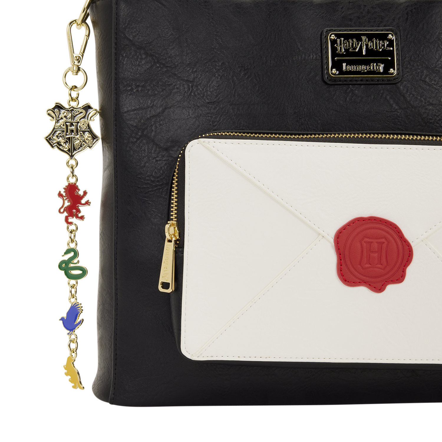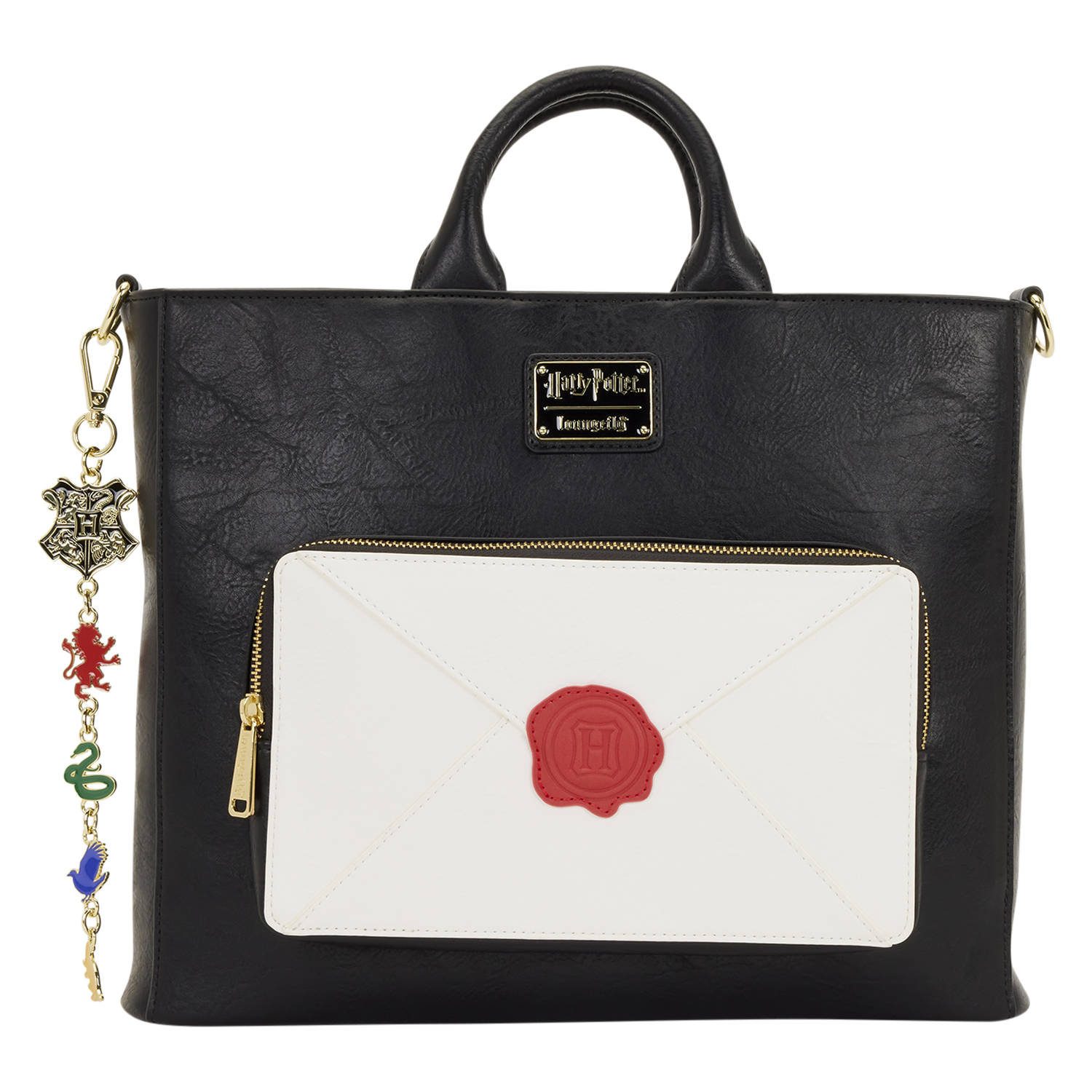 This Harry Potter bag is a must for any fan that wants to add some fandom flair to their day! This tote can convert to a backpack so you can wear it however you'd like. The front pocket is in the shape of a Hogwarts letter, with debossed and PVC applique wax seal. Turn the bag around to find the Hogwarts emblem on the bag in gold foil. Attached to the bag is a keychain that features a charm of the Hogwarts logo and a charm of each Hogwarts house!
