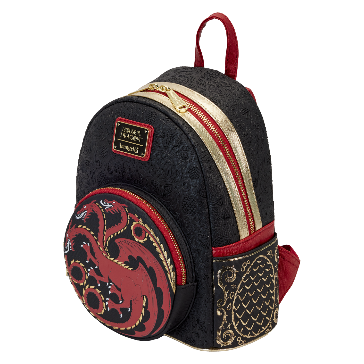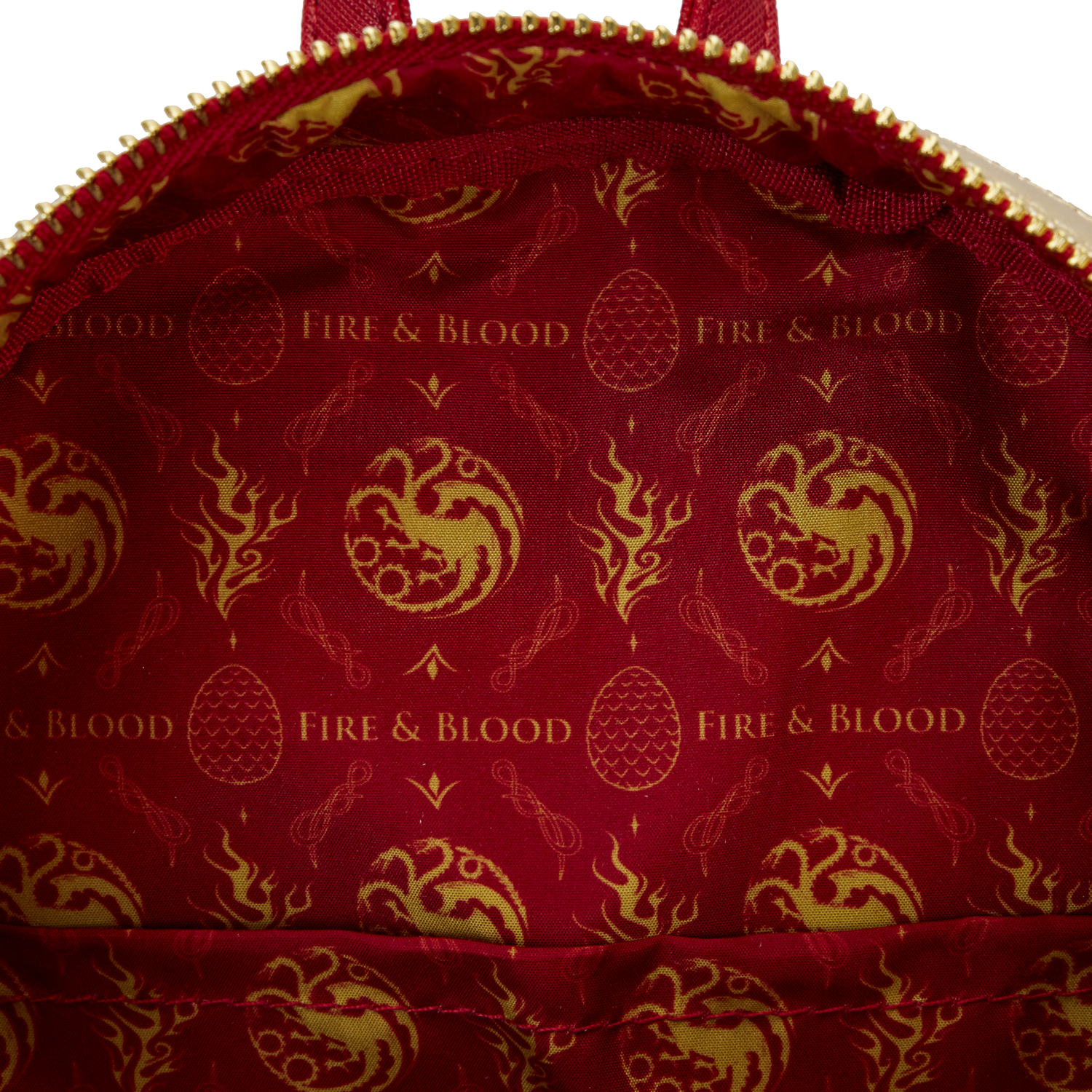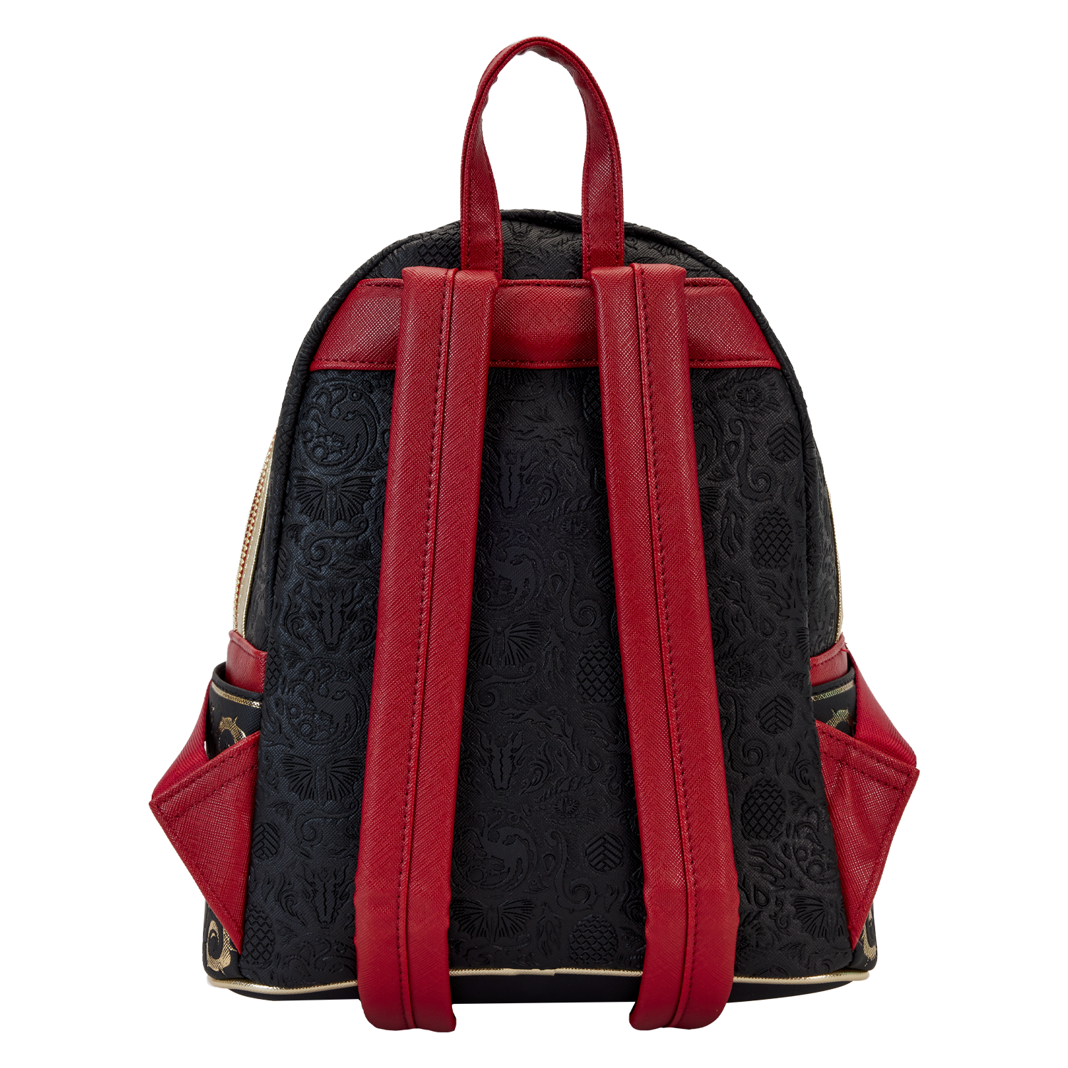 The Loungefly House of the Dragon Targaryen Mini Backpack is made of vegan leather (polyurethane). Bag has adjustable shoulder straps and shiny gold hardware. Additional features include applique, metallic, debossed, embroidered, and printed details. Take note of the coordinating inside lining.