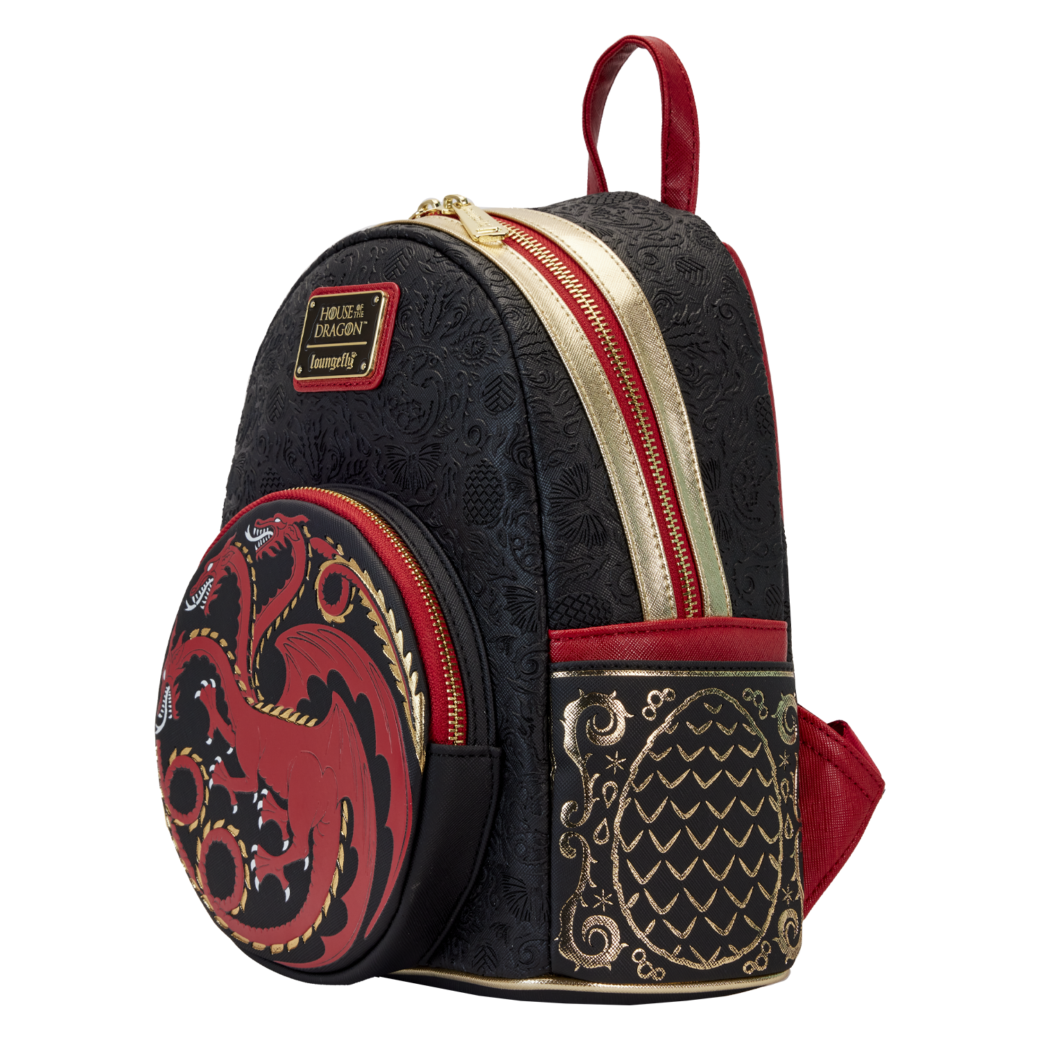 Enter the House of the Dragon with a look worthy of royalty! Covered in elegant gold foil and embroidered details, the Loungefly House of the Dragon Targaryen Mini Backpack shows the House Targaryen sigil on the front zipper pocket. A zipper charm in the shape of a dragon egg appears nearby, and a debossed dragon motif covers the body of the bag in an all-over print. Turn the bag around to see gold foil details continue onto the side pockets. This accessory is designed for anyone born to rule and will keep your belongings safe as you secure your legacy.