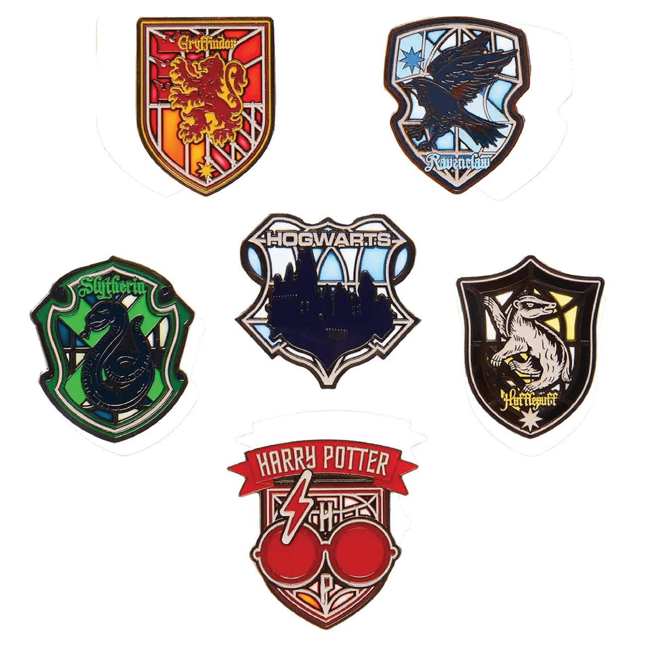 Heading to Hogwarts? Put the finishing touches on your wardrobe with our Loungefly Harry Potter™ Stained Glass Mystery Box Pin Set. Each enamel pin is shaped like a crest and has stained-glass effect details. Pins in this collection include crests of Hogwarts, Ravenclaw, Gryffindor, Hufflepuff, Slytherin, and Harry Potter. Each one comes in mystery box packaging, so when you open it, a surprise awaits. All wands at the ready! Collect them all.