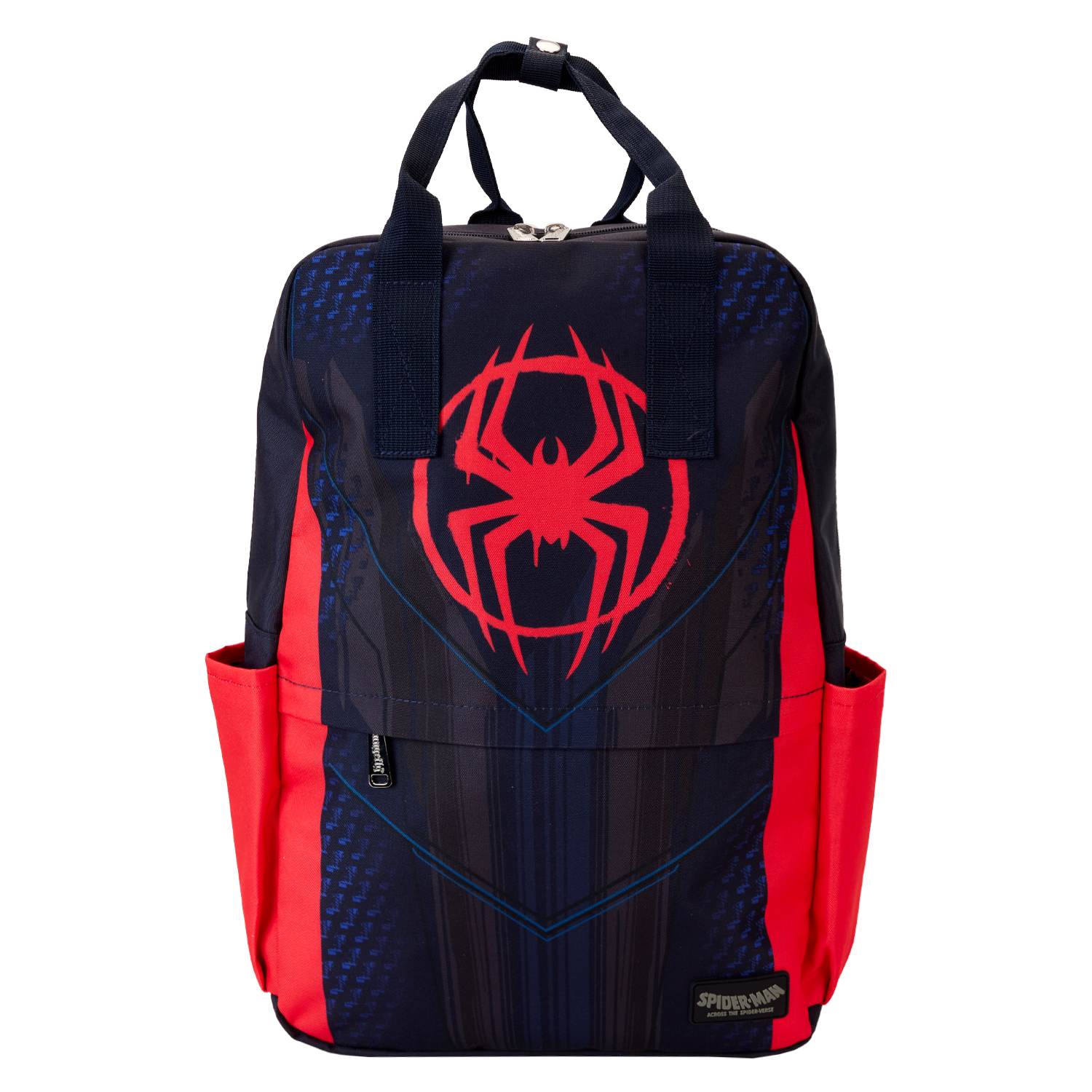 Let’s do this one more time! Bitten by a radioactive spider, Miles Morales takes the role of Spider-Man on the Loungefly Spider-Verse Miles Morales Suit Full Size Backpack. On the front, a graffiti-style spider symbol appears below the bag’s top handle. Details of his hero suit continue onto the zipper pocket below, and the spider symbol makes an encore appearance on the bag’s back. This backpack makes a heroic addition to your next mission and will keep your belongings safe on your interdimensional travels.