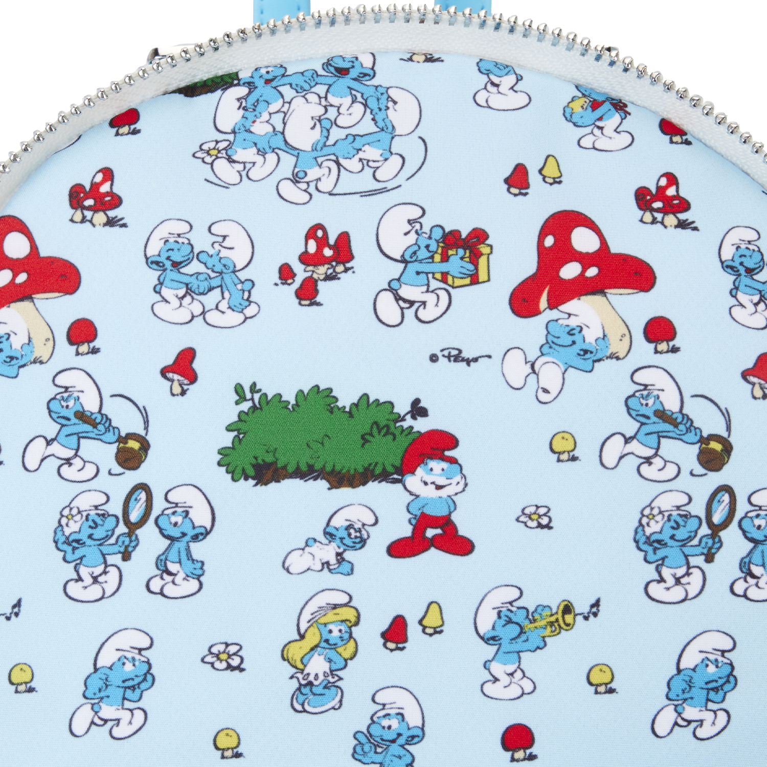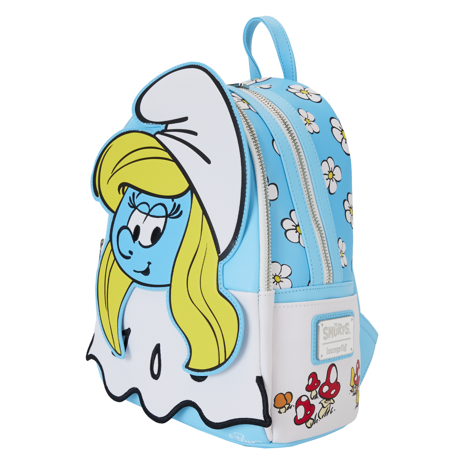La-la-la-la-la-la! Have a wonderfully Smurfy day with our Loungefly The Smurfs™ Smurfette™ Cosplay Mini Backpack. This blue backpack features Smurfette’s adorable face and hat on the front, in die-cut applique detail. Her skirt takes on a fun scalloped design at the hem. Behind her, you’ll find a front zipped compartment for storing smaller items on all your journeys. A white and yellow daisy debossed print pattern follows along the top, and on the side pockets, you’ll find printed images of the colorful mushrooms. Turn the backpack around, and you’ll discover the entire cast, including Papa Smurf™ and Smurfette, front and center. Make your way through the Smurf Village™ in style with this fun accessory.