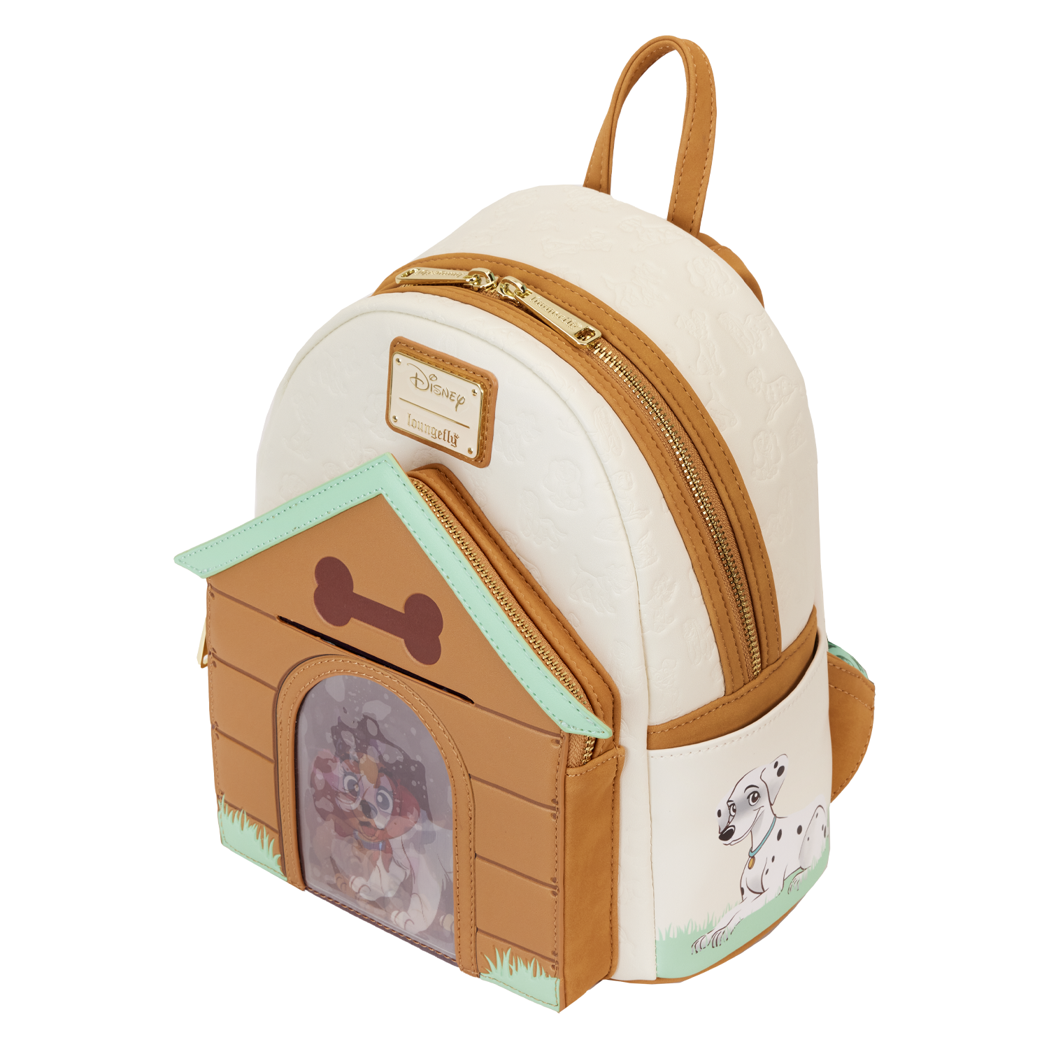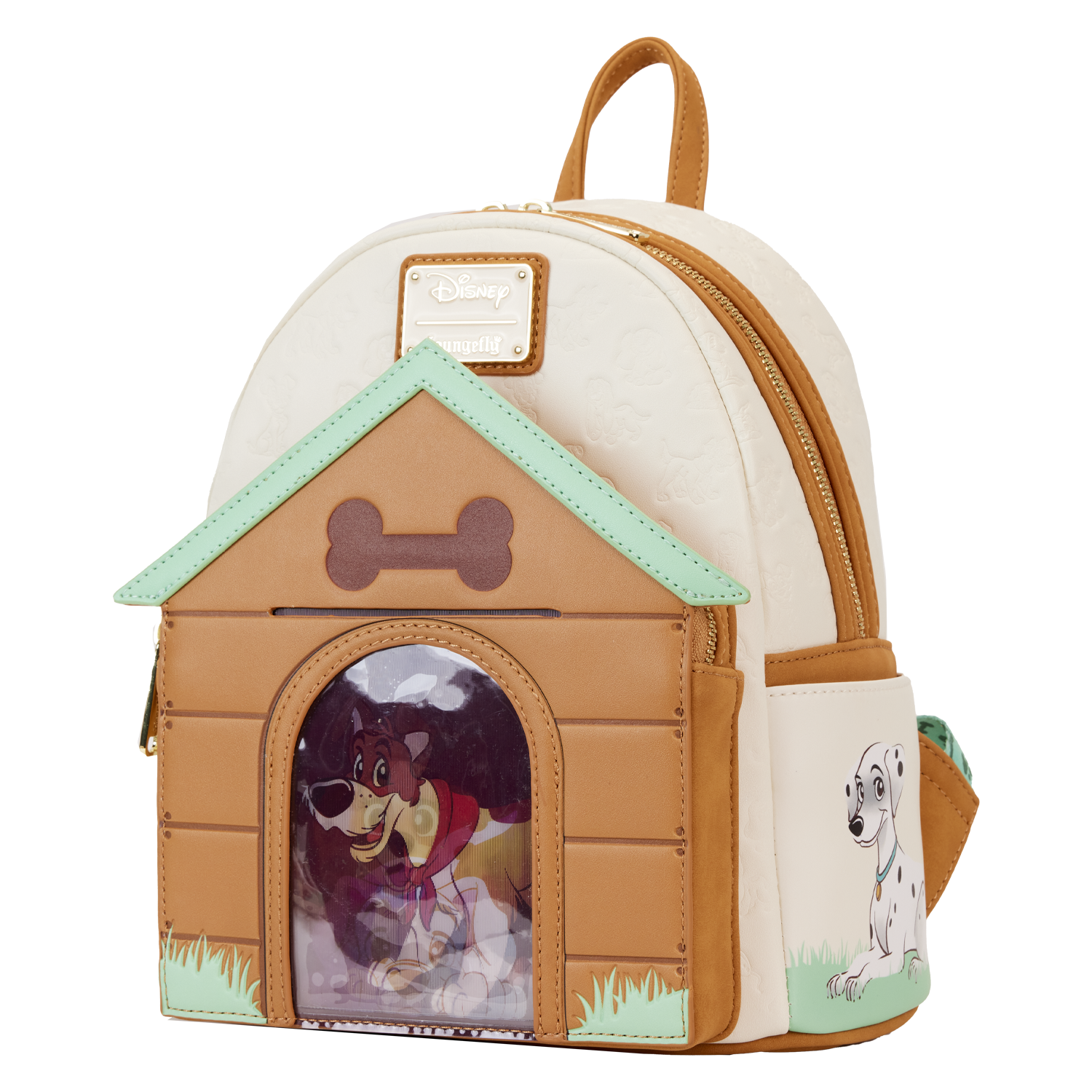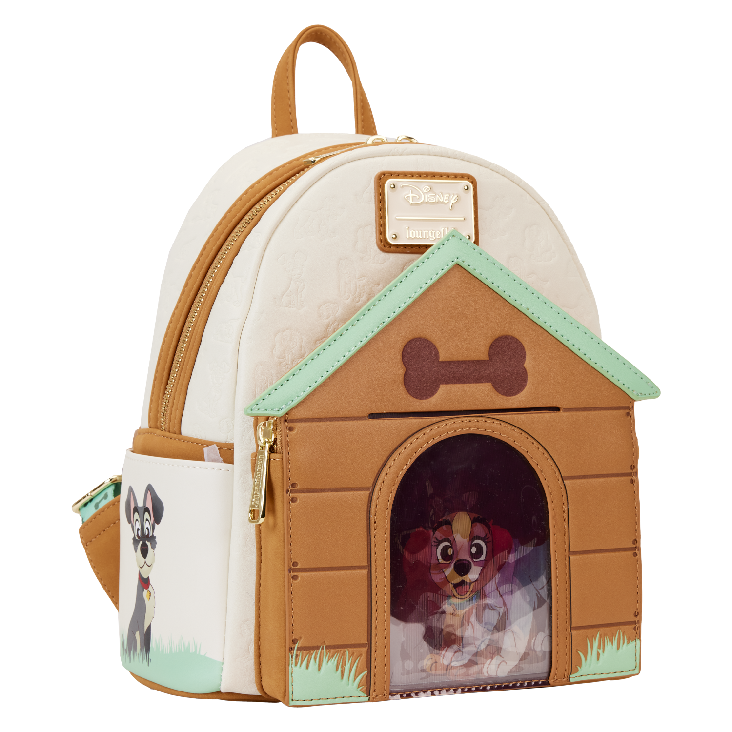 Paws for a picture-perfect moment! Our Loungefly Disney I Heart Disney Dogs Triple Lenticular Mini Backpack is ready to embark on journeys full of fun memories. On the front of this accessory, a fully figural doghouse takes shape over the front pocket. Lenticular details on the door reveal three different Disney Dogs: Lady, a Dalmatian puppy, and Dodger. You can even place a photo of your pet behind the door for a more personalized touch. Various Disney Dogs appear as a debossed print above the doghouse as well. On the side pockets, you’ll find Disney’s Perdita and The Tramp. On the back, Disney’s Copper plays in the grass. Even the straps include a motif of bones and paw prints. Enjoy a stroll through the park with this treat of an accessory.