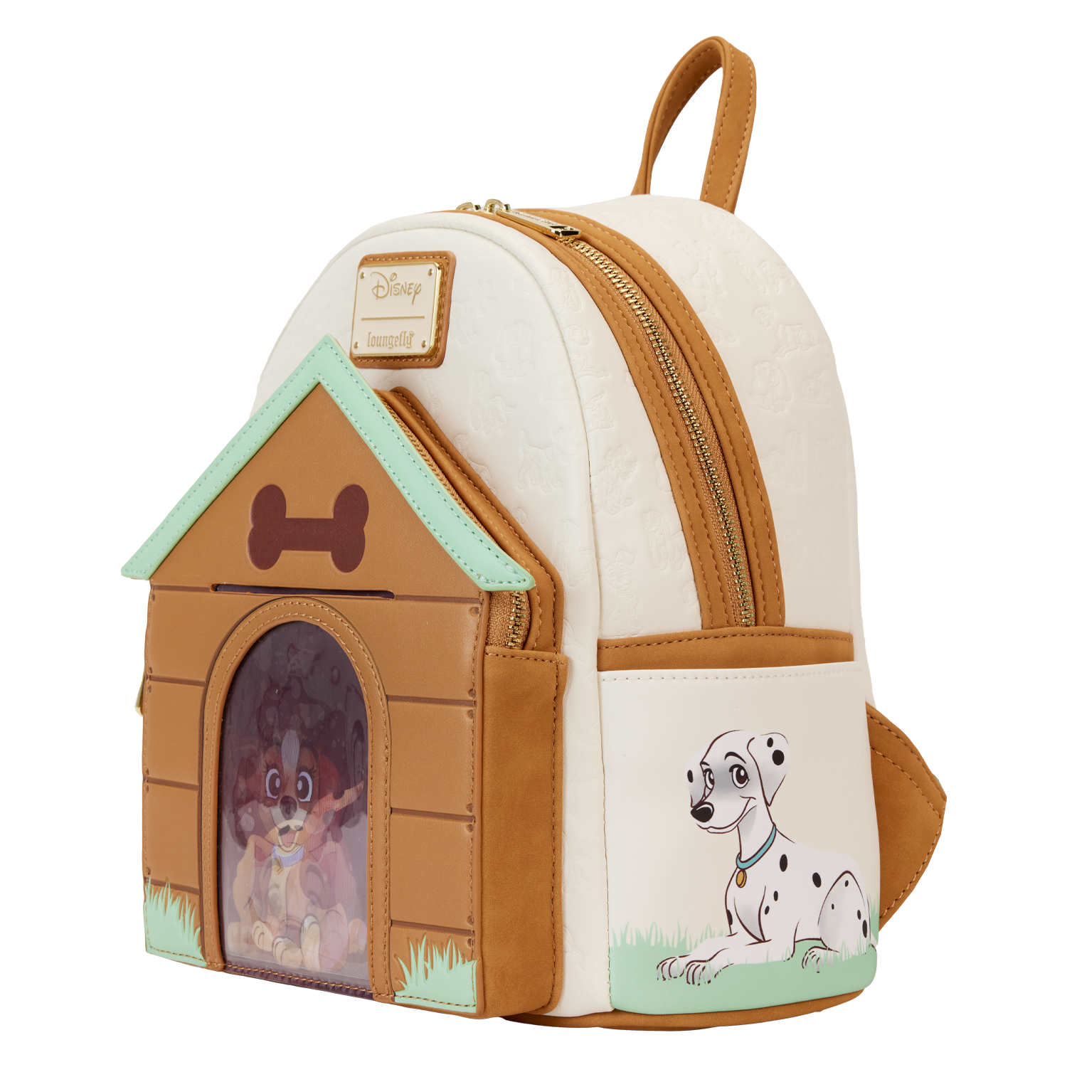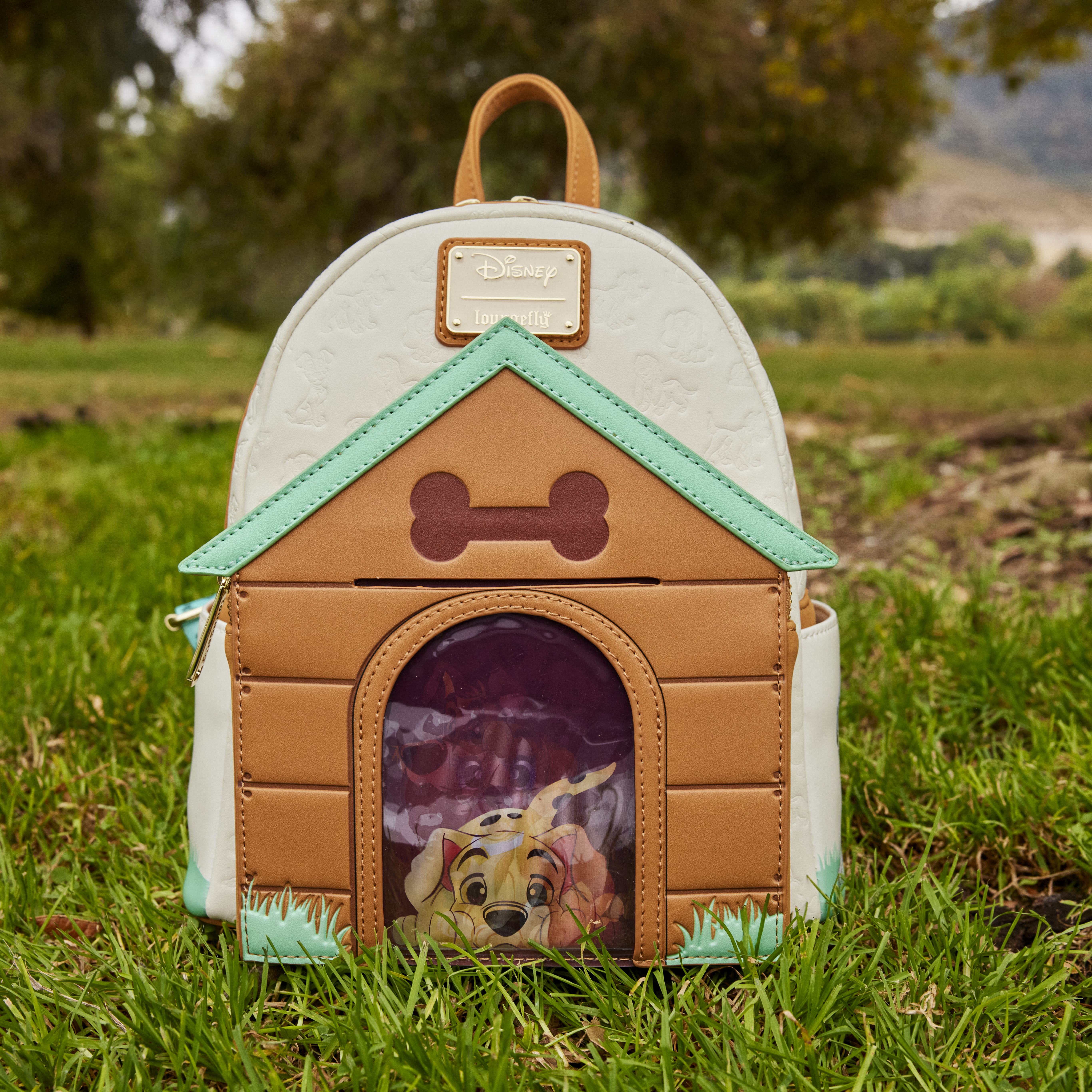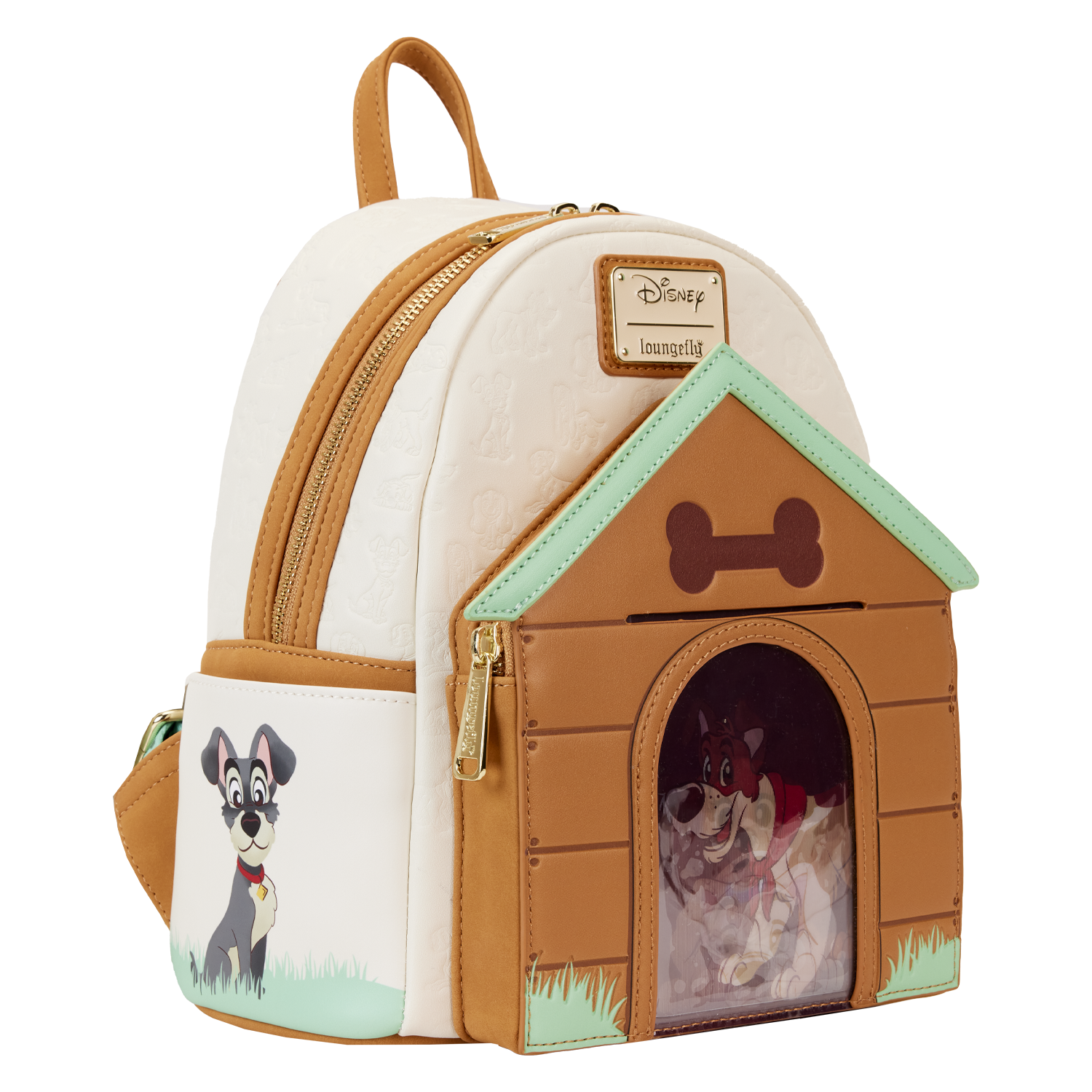 Paws for a picture-perfect moment! Our Loungefly Disney I Heart Disney Dogs Triple Lenticular Mini Backpack is ready to embark on journeys full of fun memories. On the front of this accessory, a fully figural doghouse takes shape over the front pocket. Lenticular details on the door reveal three different Disney Dogs: Lady, a Dalmatian puppy, and Dodger. You can even place a photo of your pet behind the door for a more personalized touch. Various Disney Dogs appear as a debossed print above the doghouse as well. On the side pockets, you’ll find Disney’s Perdita and The Tramp. On the back, Disney’s Copper plays in the grass. Even the straps include a motif of bones and paw prints. Enjoy a stroll through the park with this treat of an accessory.