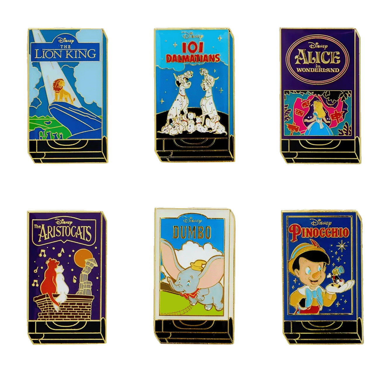 Celebrate your favourite Disney classics with the Loungefly Disney Classic VHS Blind Box Pin Set! Each pin features a beloved movie case reimagined as a collectible enamel pin, including Alice in Wonderland, Dumbo, The Lion King, Pinocchio, 101 Dalmatians, and The Aristocats. Add a nostalgic touch of Disney magic to any outfit or accessory. Which one will you get? It’s a surprise!