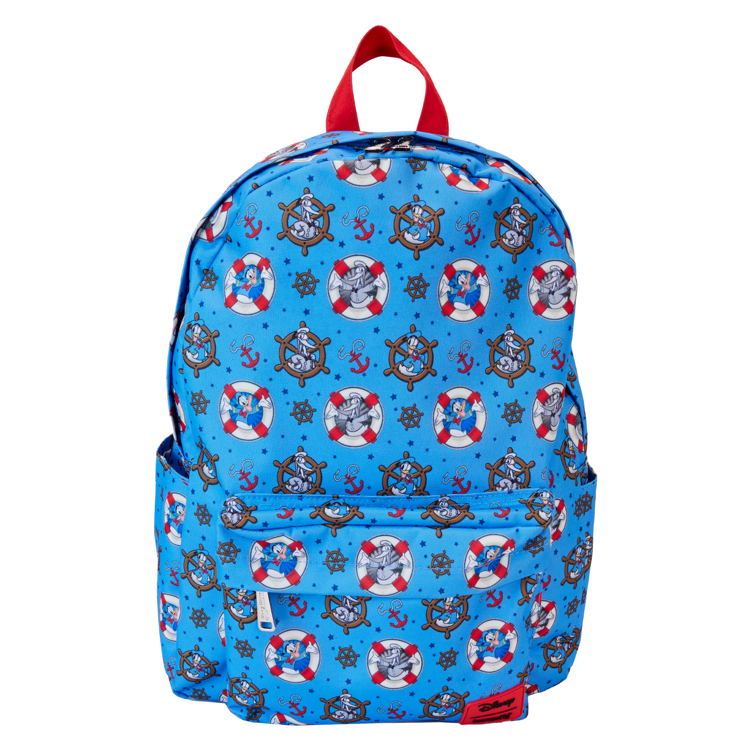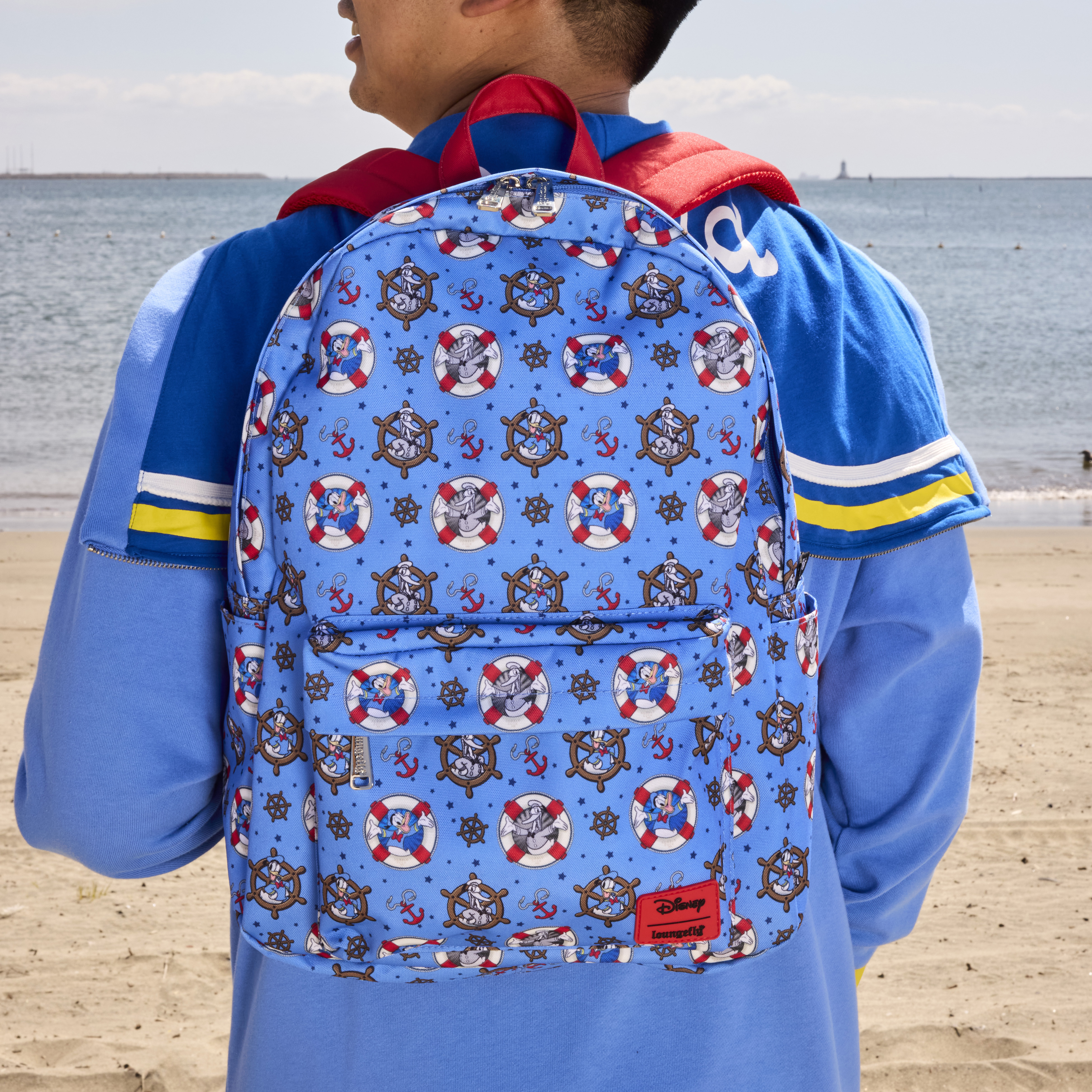 Navigate the fun with your favorite plus one! This full-size backpack is perfect for sailing through your day in character. Disney’s Donald Duck appears as a motif in black and white--and in color. You can find him peeking out from the circle within a life ring--or from the center of the steering wheel of a ship. Other nautical themes accompany him on this blue backpack with red trim. And if you decide to rock the boat, the front pocket is perfect for keeping smaller items secure during your journeys. Make waves while celebrating Donald Duck’s 90th anniversary in style.