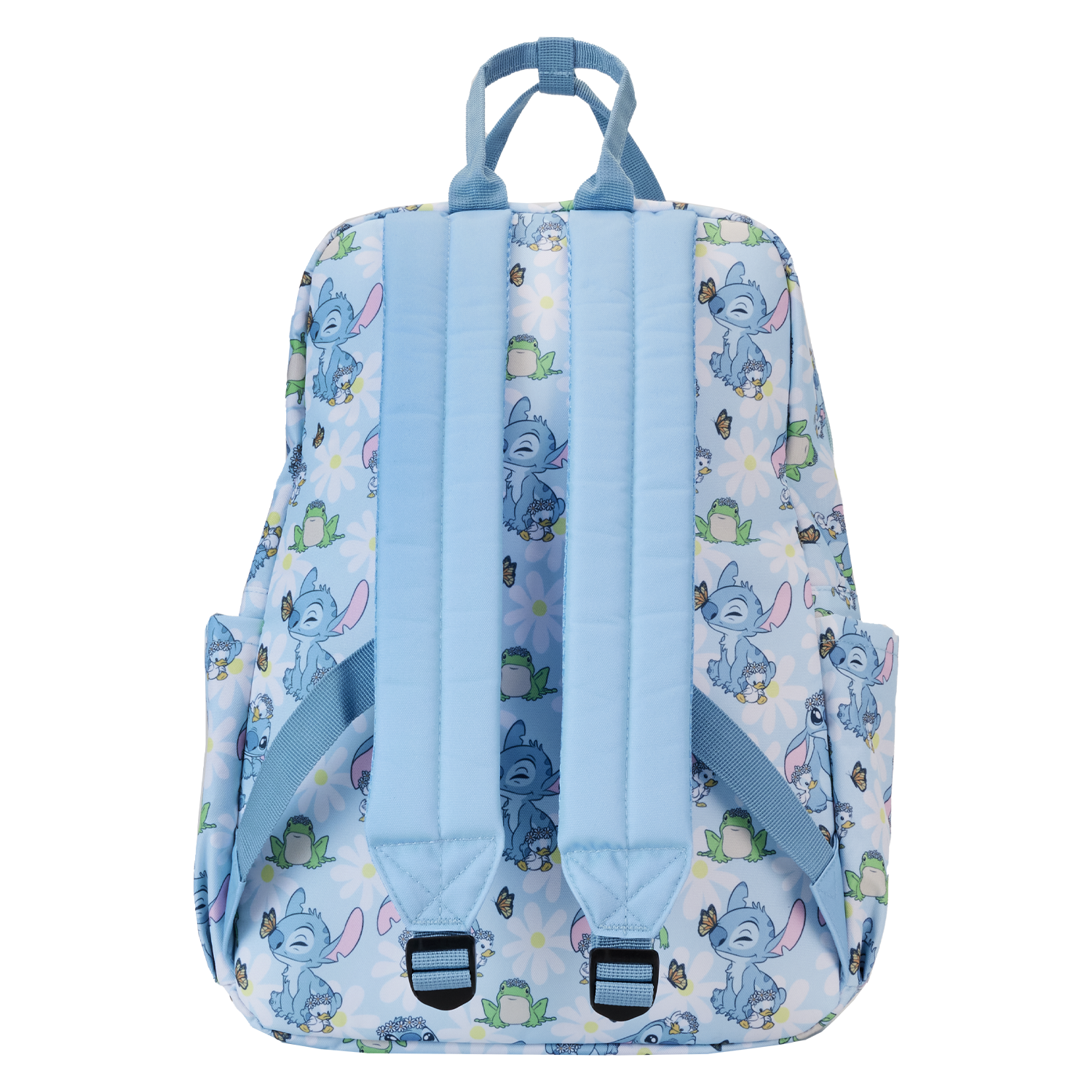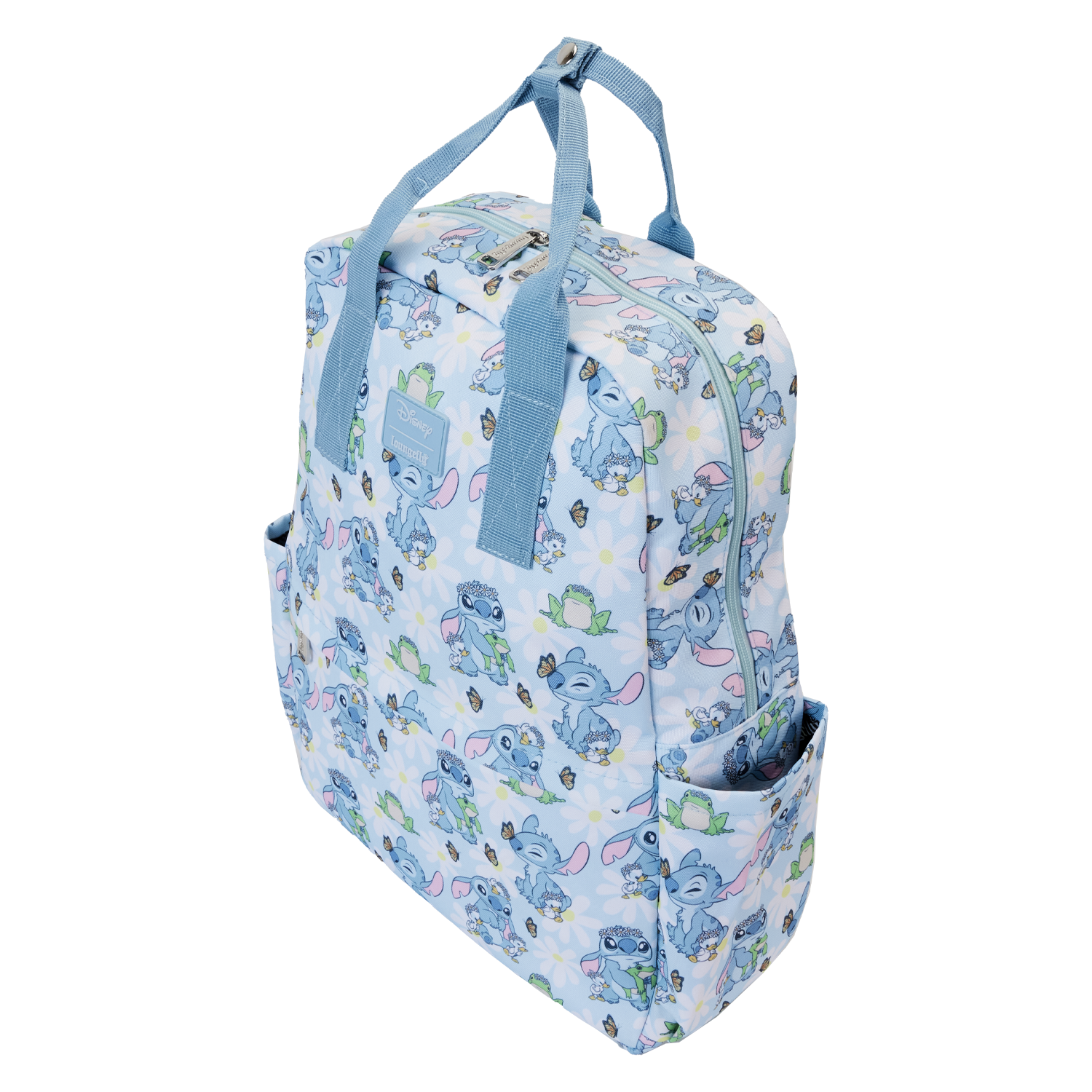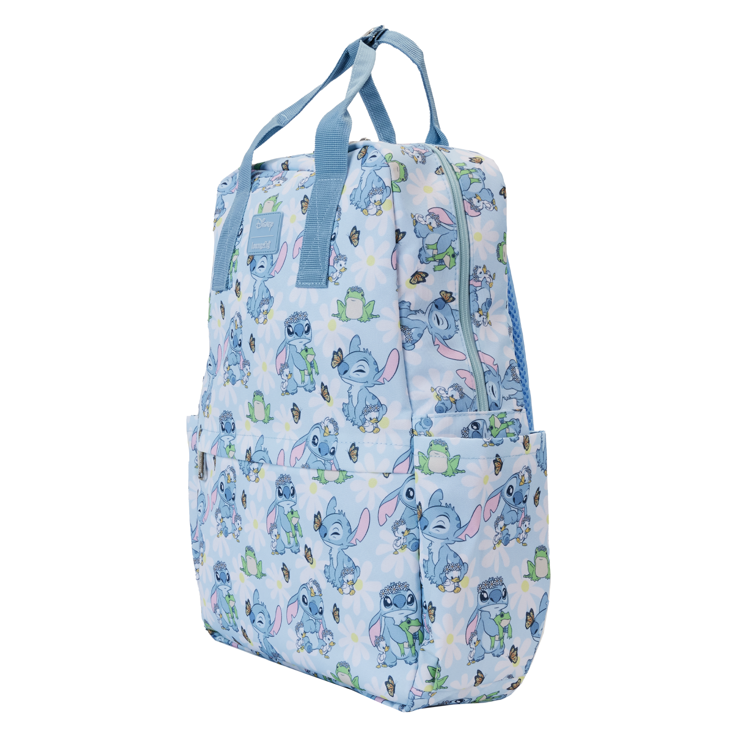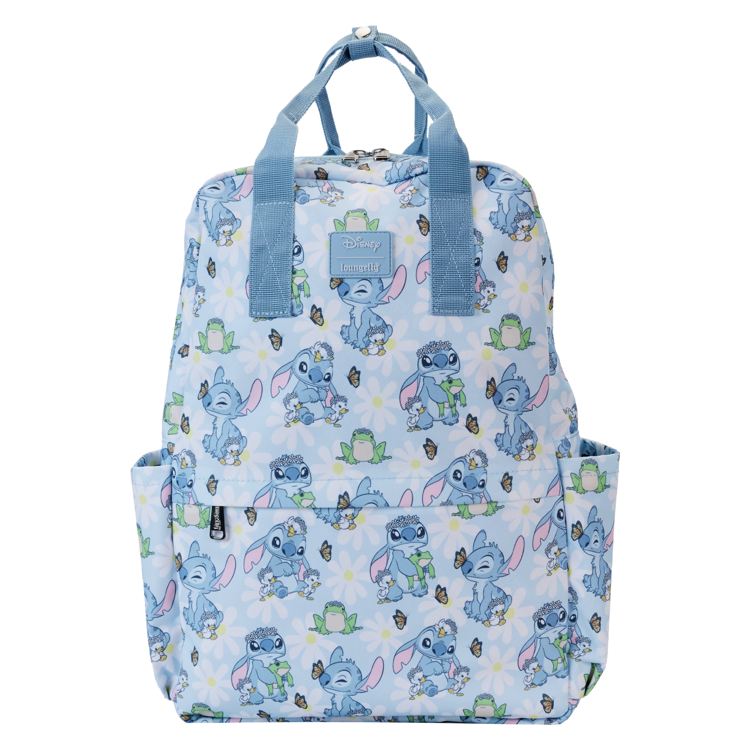 New beginnings are in bloom! Embrace a season of fresh starts with the Loungefly Lilo & Stitch Springtime Stitch AOP Full-Size Backpack. This accessory features an all-over print of the loveable alien as he makes flower crowns for all his friends. White daisies cover a blue background, where Stitch plays with some frogs and ducklings. Look closely and you may find a butterfly perched on Stitch’s nose! This backpack has plenty of room to carry your belongings and makes an adorable companion to any outing with friends.