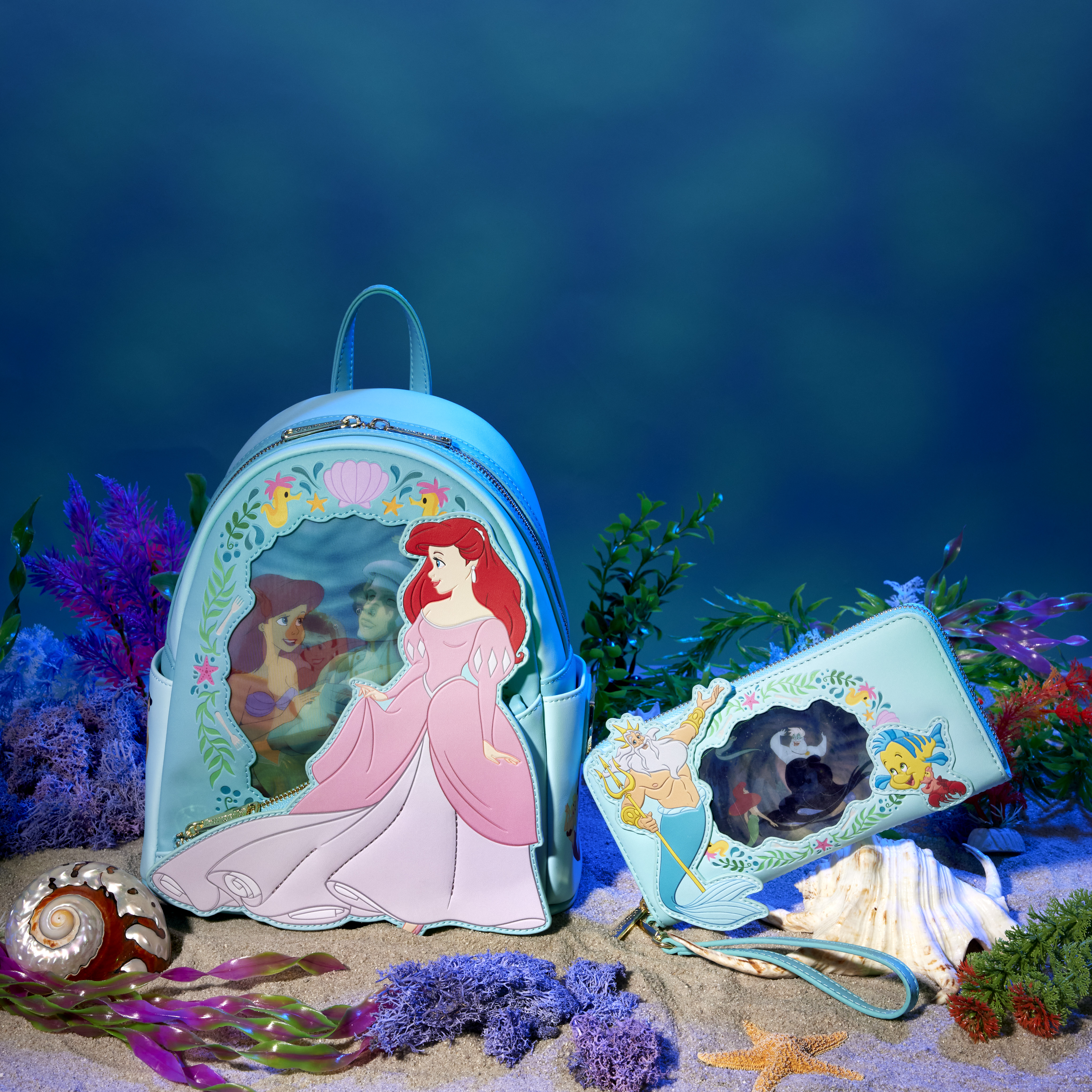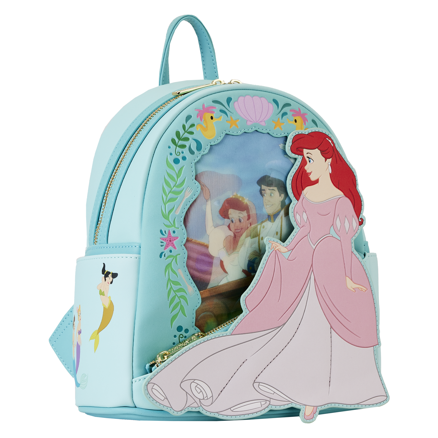 Wave hello to an ocean of adventures! Bring along our Loungefly Disney The Little Mermaid Princess Lenticular Mini Backpack. On the front, Disney's Ariel, dressed in princess pink, looks into a die-cut applique window to see herself in mermaid form, admiring the statue of Disney's Prince Eric under the water. In an alternate view, through lenticular details, she sees herself, and Prince Eric, living happily ever after. A diagonal zipper pocket, near Ariel's dress, allows you to secure smaller items throughout all your journeys. Swimmingly fun details follow through on the side pockets as well. Disney's Adella, Andrina, and Aquata appear on one side pocket, and Attina, Alana, and Arista appear on the other. Ariel makes an encore appearance on the back, along with a sea turtle and some festive sea horses. Sail away in style with this treasure of an accessory.