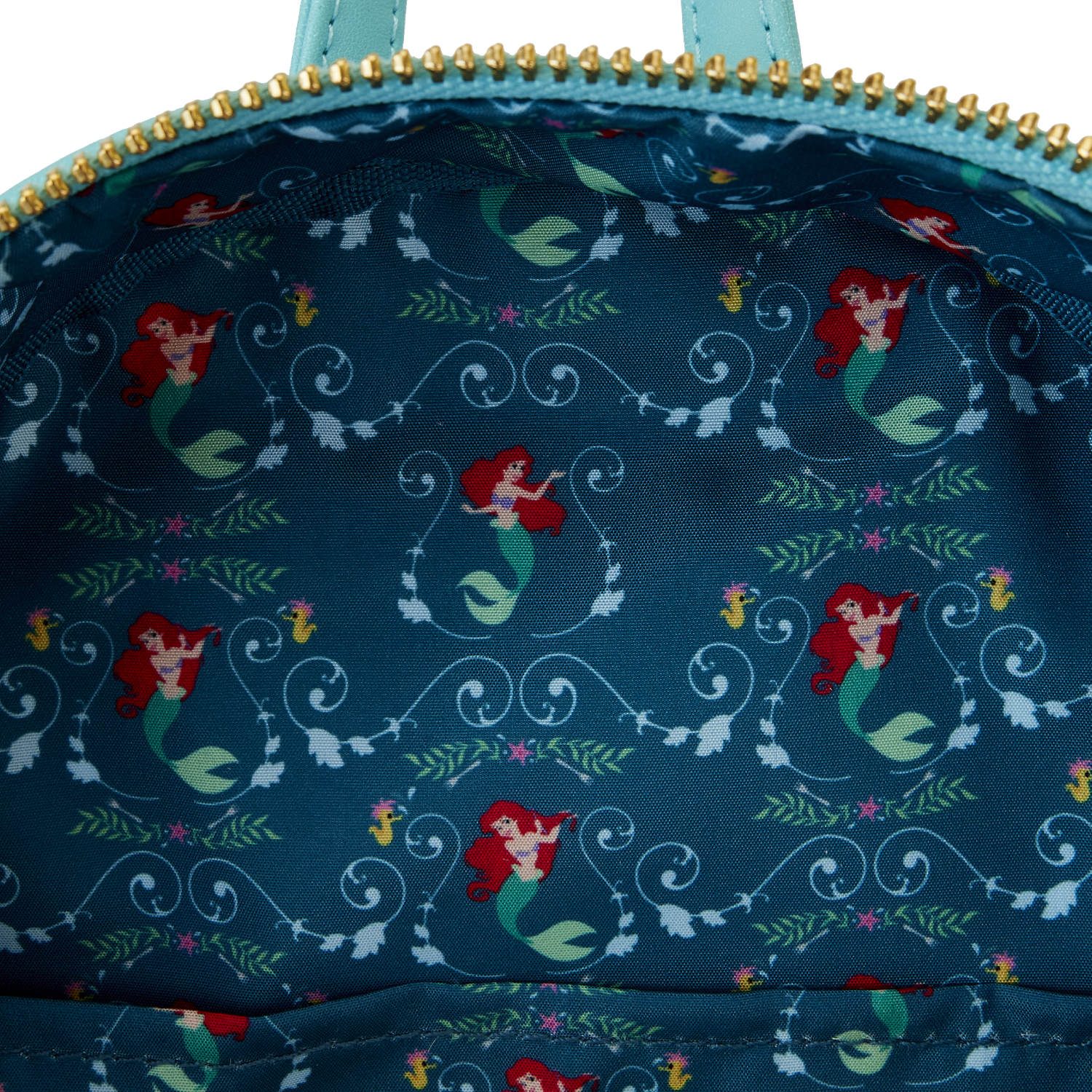 The Loungefly Disney The Little Mermaid Princess Lenticular Mini Backpack is made of vegan leather (polyurethane). Bag has adjustable shoulder straps and gold-colored metal hardware. Additional features include applique, lenticular, debossed, and printed details. Take note of the coordinating inside lining.
