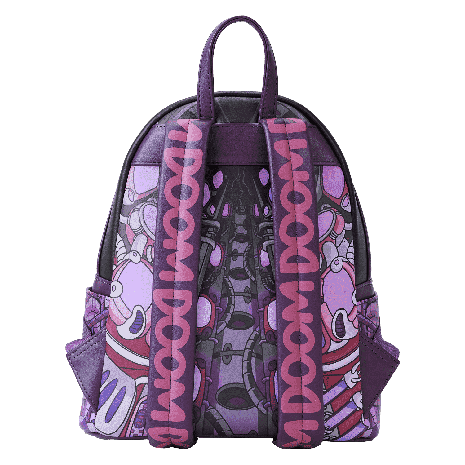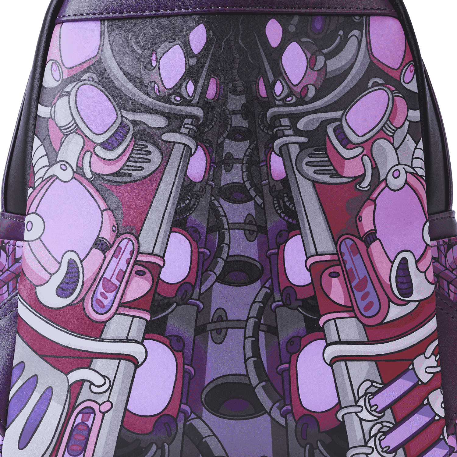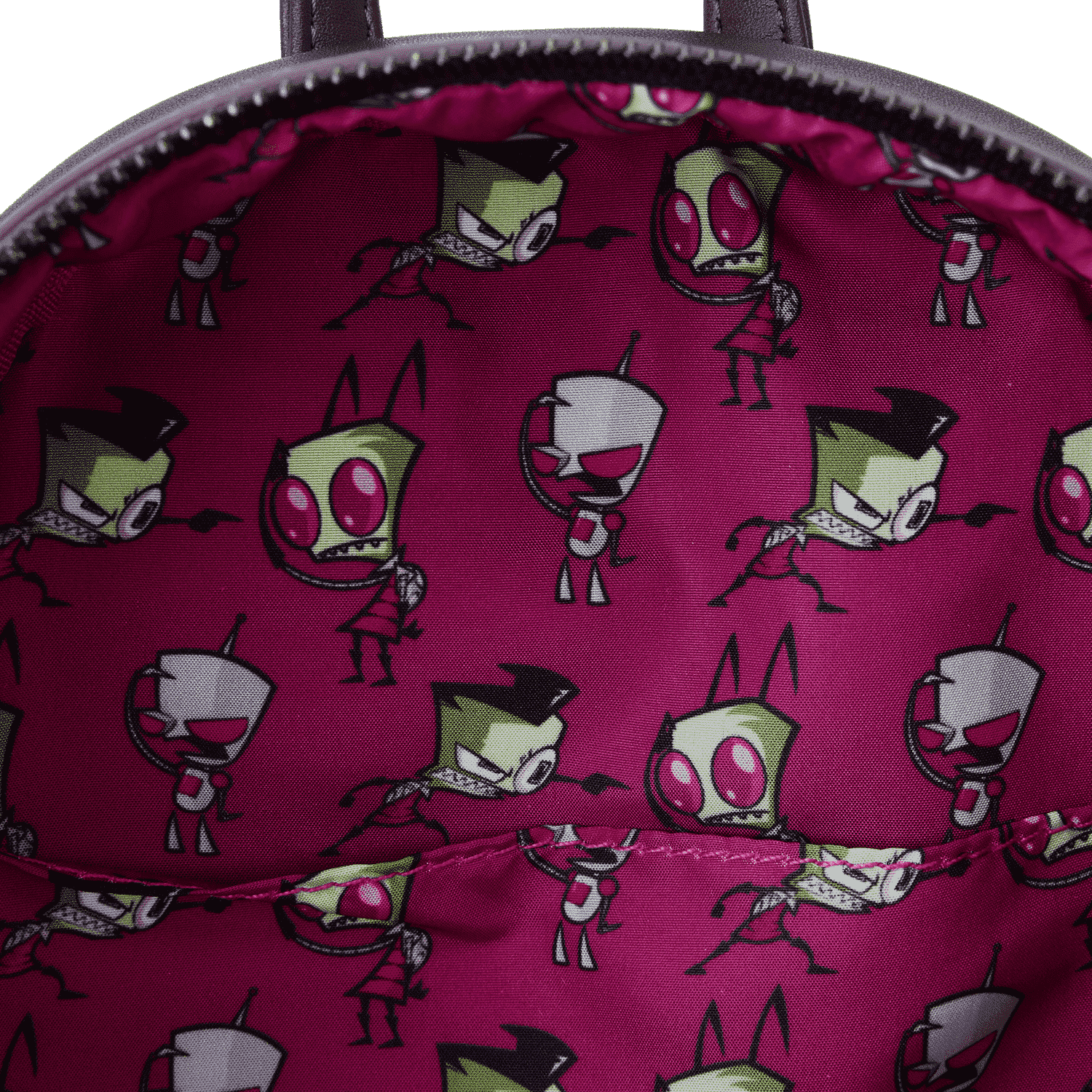 The Loungefly Invader Zim Secret Lair Mini Backpack is made of vegan leather (polyurethane). Bag has adjustable shoulder straps and gunmetal-colored hardware. Additional features include applique, debossed, and printed details. Take note of the coordinating inside lining.