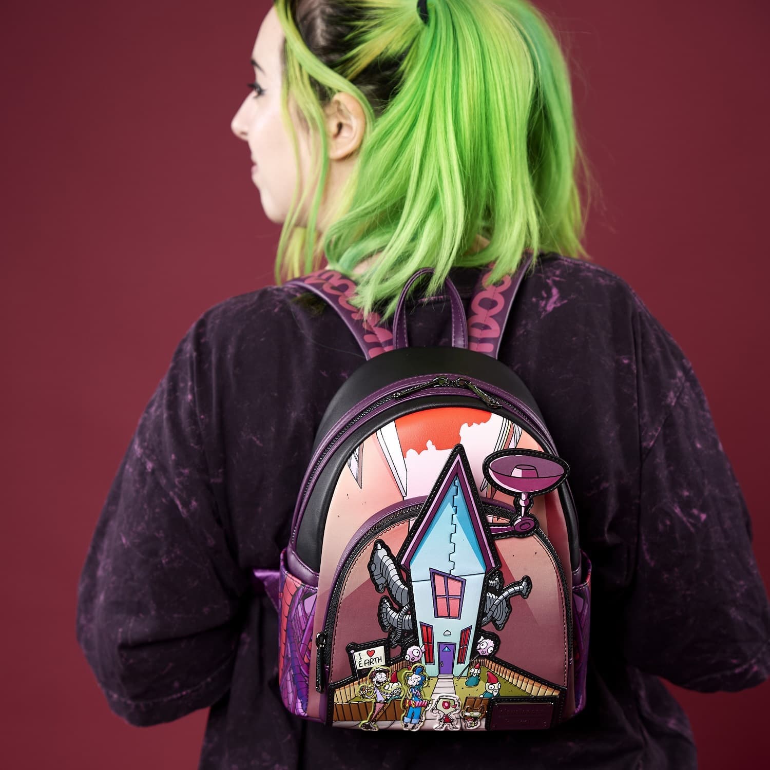Onward to victory! Unleash your plot to take over the world with the Loungefly Invader Zim Secret Lair Mini Backpack. On the front zipper pocket, Zim and GIR attempt to blend into their earthly surroundings. Up above, Zim’s secret base is disguised as a suburban home that rises towards the sky. Turn the bag around to explore the inner workings of Zim’s lair and prepare for doom as GIR’s favorite word appears on the shoulder straps. Whether you’re dressed in your humanoid best or prefer to keep things extra-terrestrial, this mini backpack makes the perfect strategy for all your fashion plans.