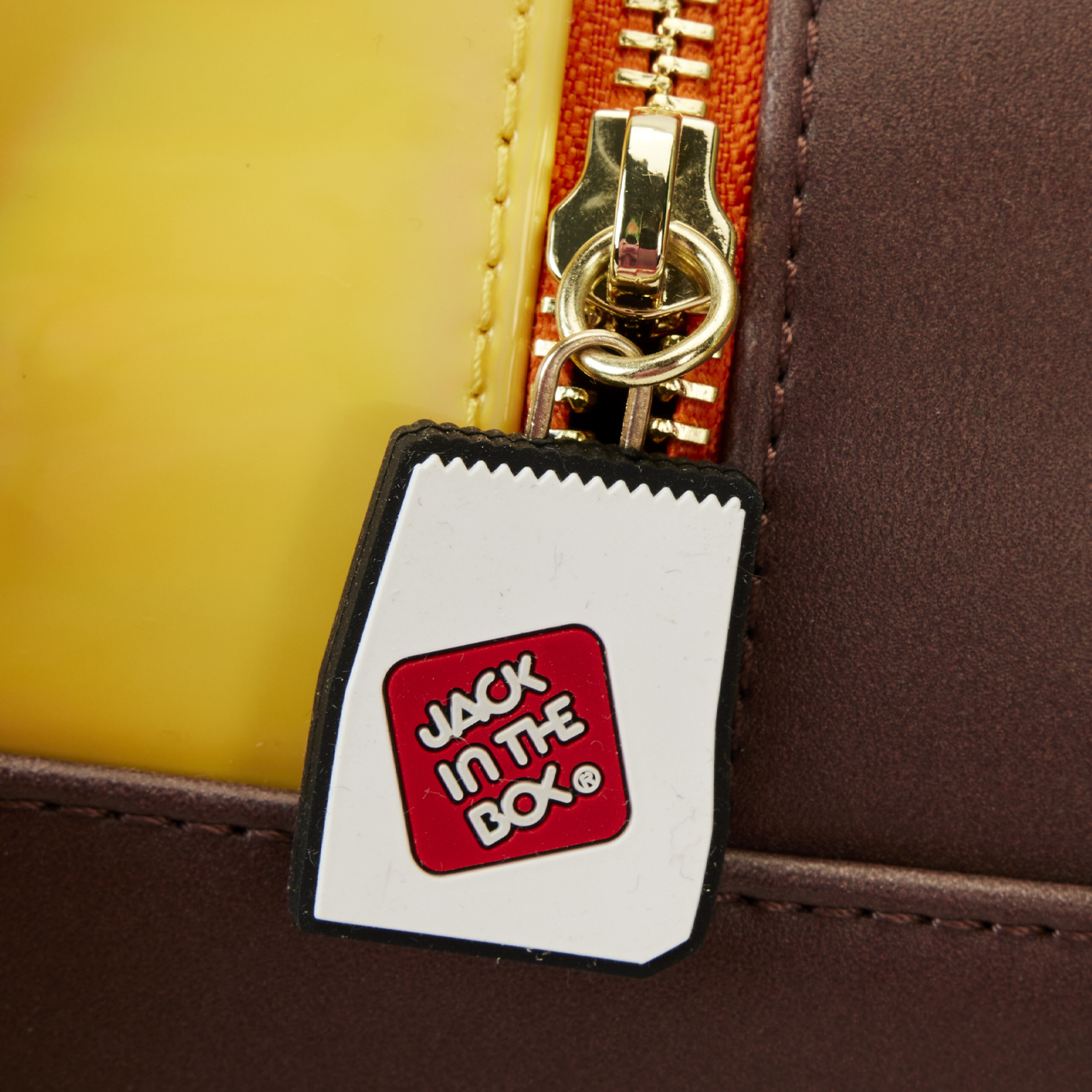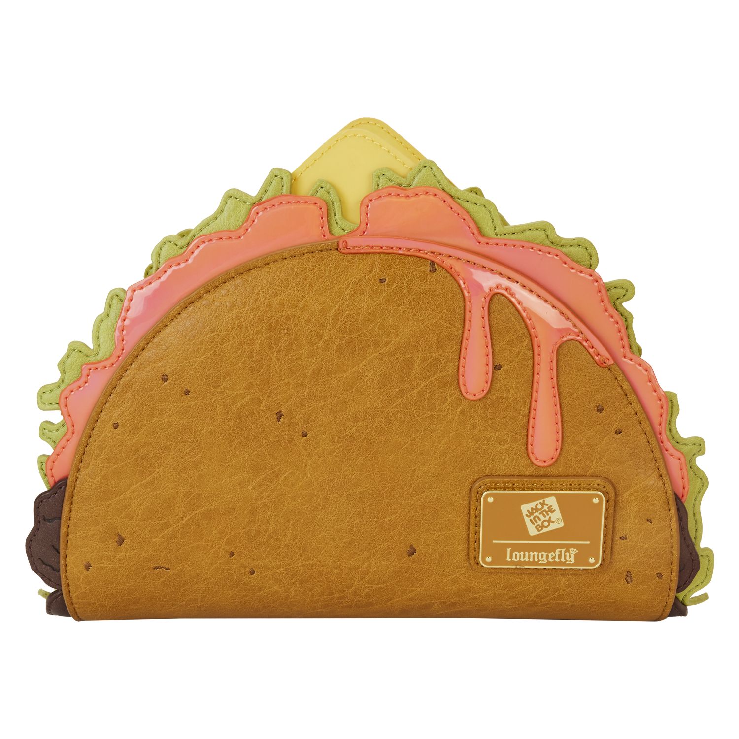 Up for a bite? The Loungefly Jack in the Box® Late Night Taco Crossbody Bag is here to satisfy your fashion cravings any time. Inspired by one of the restaurant’s famous menu offerings, this bag takes the shape of a crunchy taco. A speckled tortilla shell covers the front and back of the bag, where meat, cheese, and lettuce stick out from the bag’s sides. A generous helping of hot sauce dribbles down the front side, and an embroidered Jack in the Box logo appears on the back. Look closely and you’ll find a silicone zipper charm in the shape of a takeout bag, as well as a detachable coin bag shaped like an antenna ball mascot! With plenty of room to hold your munchies, this crossbody bag will hit the spot when styling your next outfit.