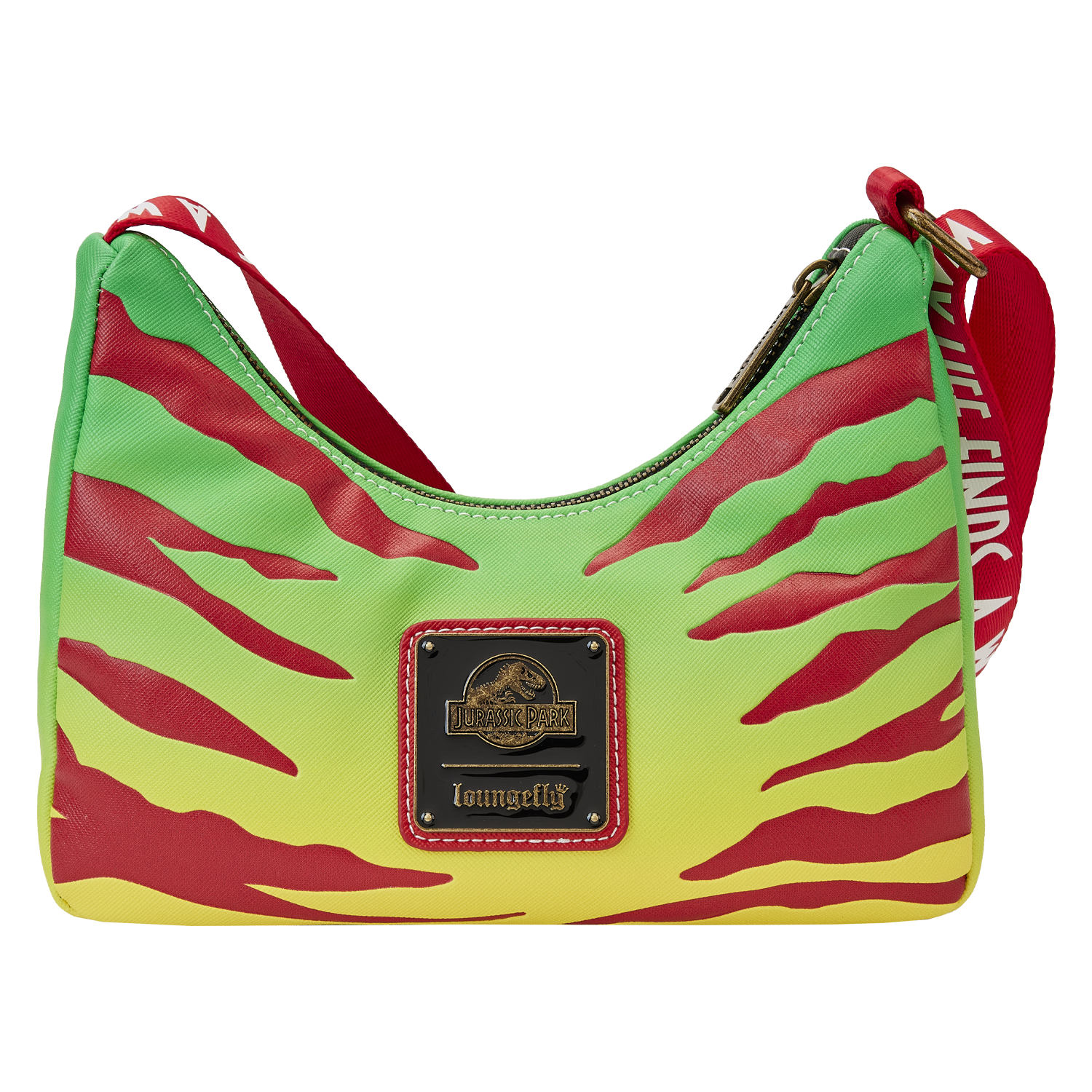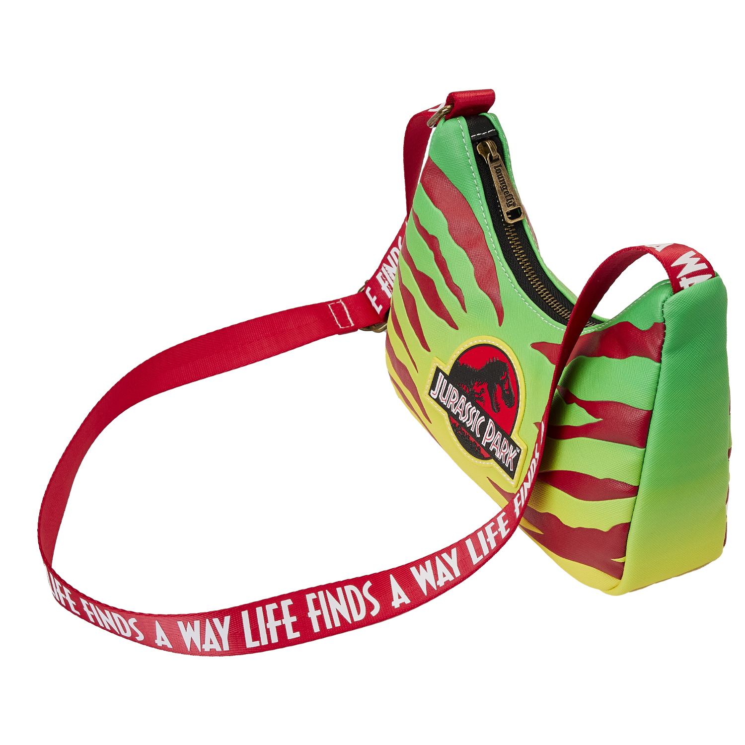 Welcome to Jurassic Park! Celebrate a larger-than-life adventure with the Loungefly Jurassic Park 30th Anniversary Life Finds a Way Crossbody Bag. Journey to a land frozen in time with a retro “baguette” design that features a vibrant yellow and green gradient. Slashes of red stripes are debossed to add texture, and the Jurassic Park logo appears on the front. Up above, a coin purse accompanies the adjustable fabric strap which displays an iconic quote from the film. Perfect for tourists on the go, this accessory will keep your essentials safe as you start your next expedition.