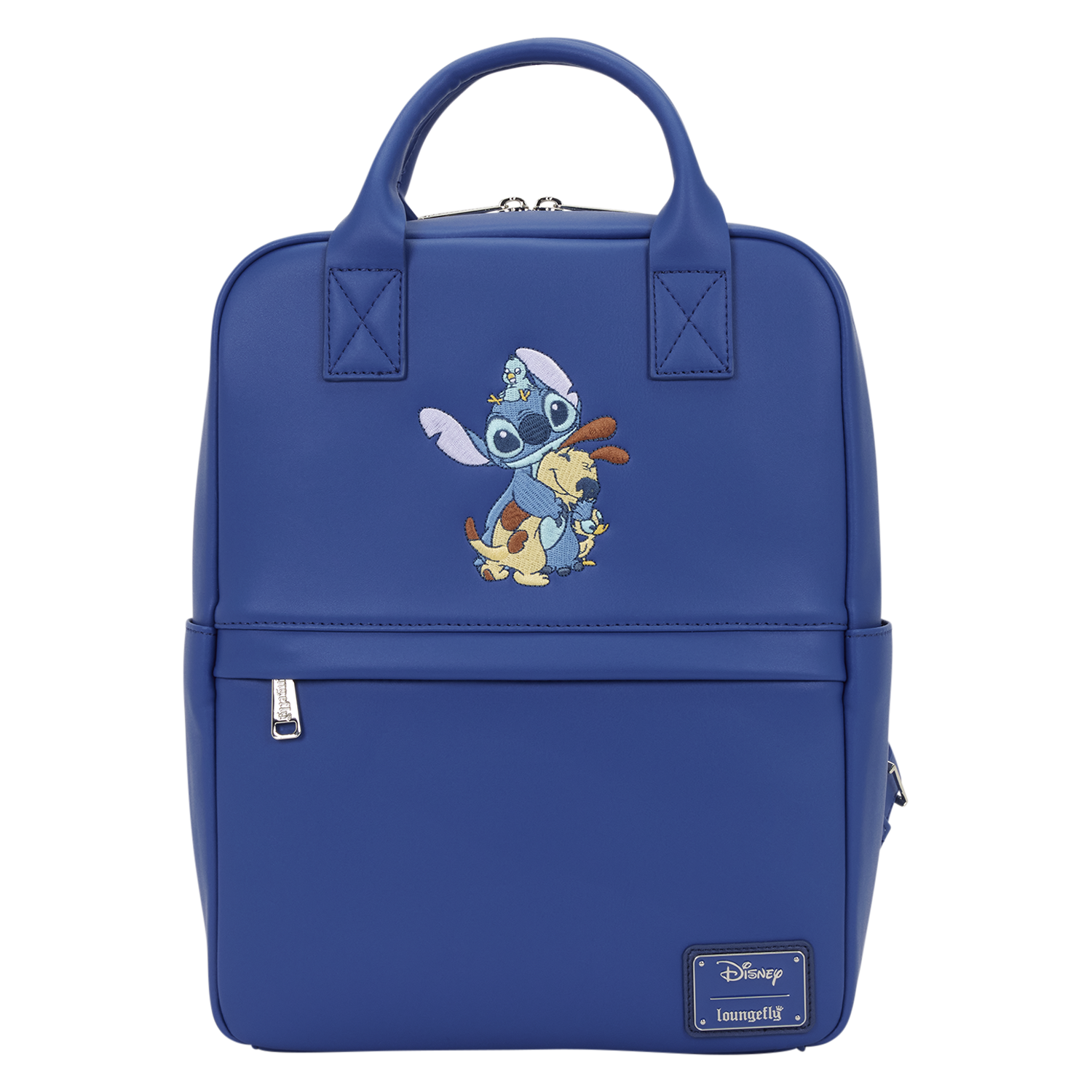 This mid-size backpack is blue and features printed details of Stitch hugging some animal friends, like a dog, a duckling, and a bird. You'll find a zippered front pocket and side drop pockets in addition to the main zippered compartment. It's ready to hold your essentials on any adventure!